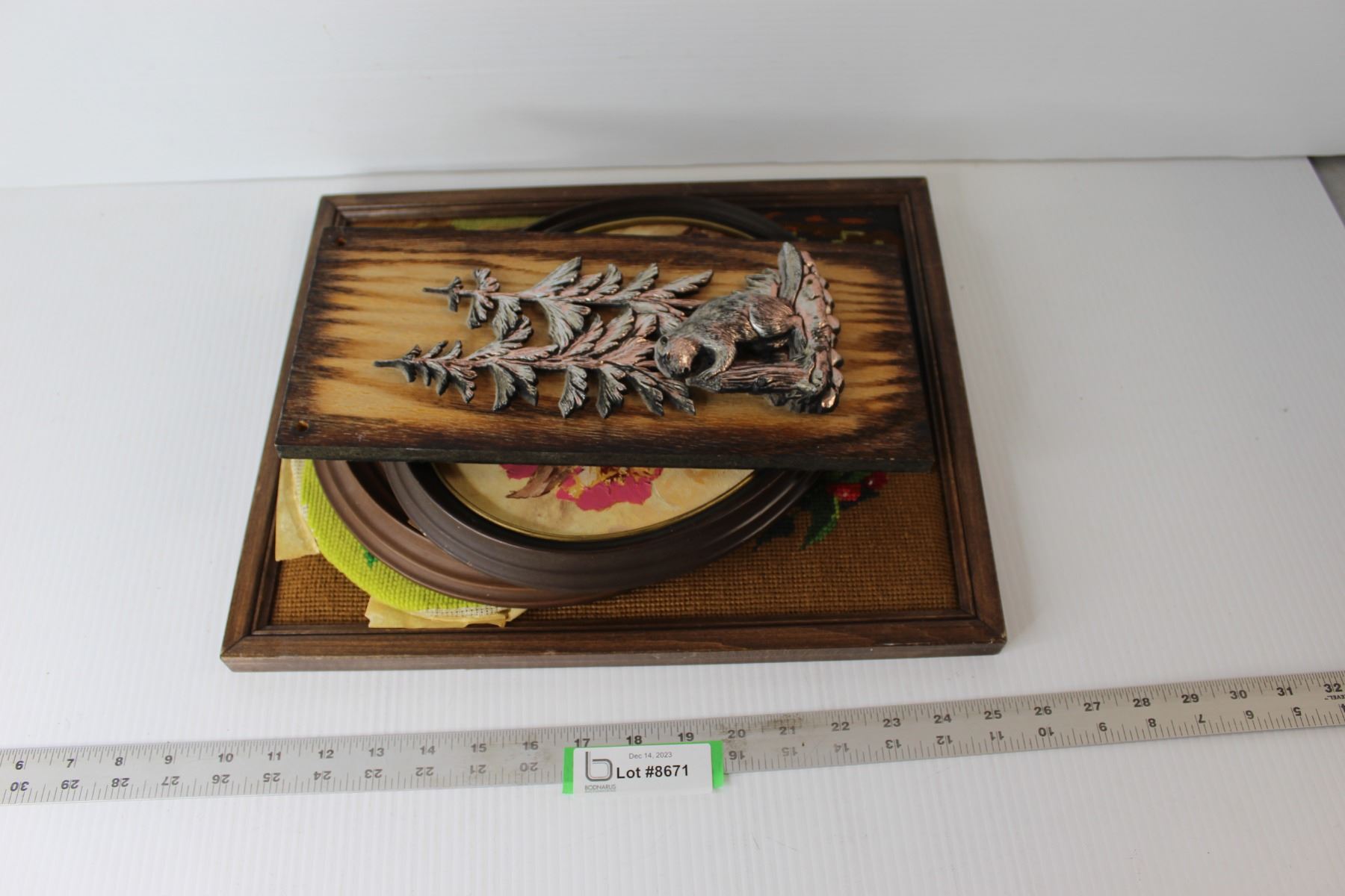 (2) Framed Cloth Pictures, Framed Oval Picture, Evergreens/Beaver Wall Hanging