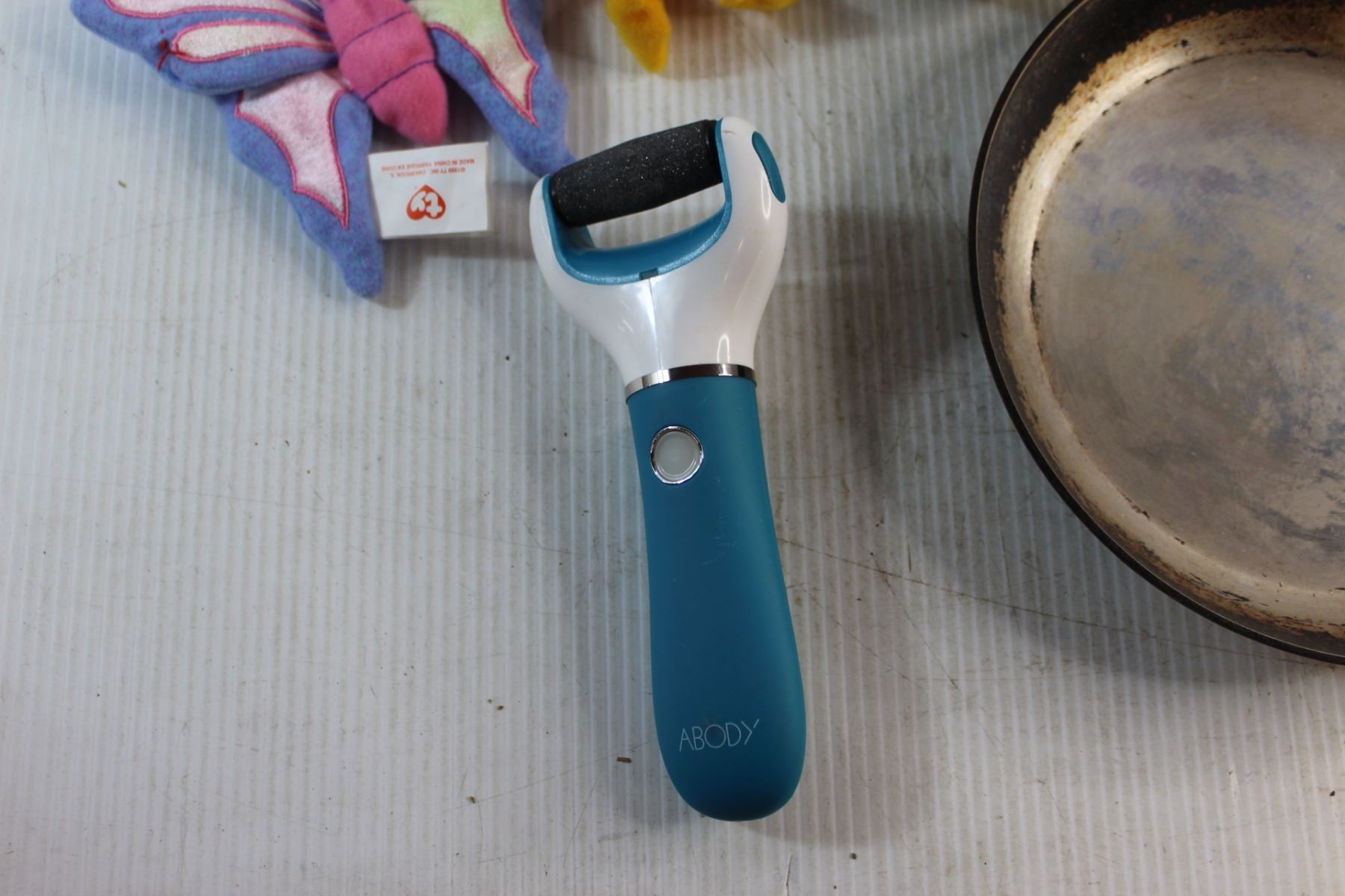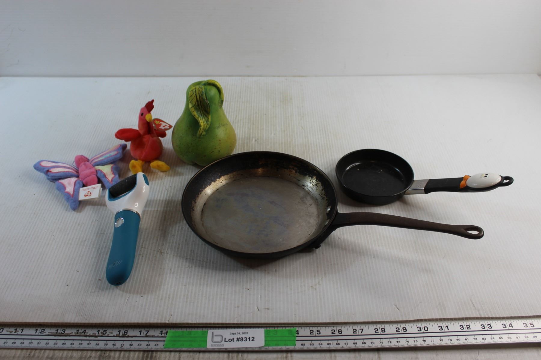 (2) Frying Pans 9'' & 5'', (2) Plush Toys, Pear Decoration and Abody Electronic Pedicure Device