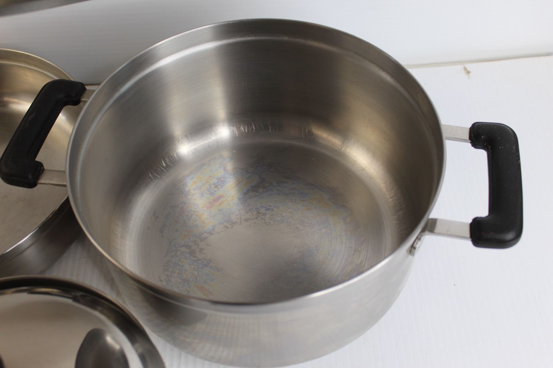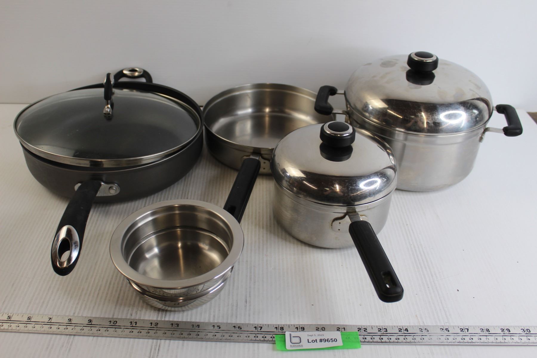 (2) Frying Pans (One has Mismatched Lid), (2) Pots, Dog Water Bowl