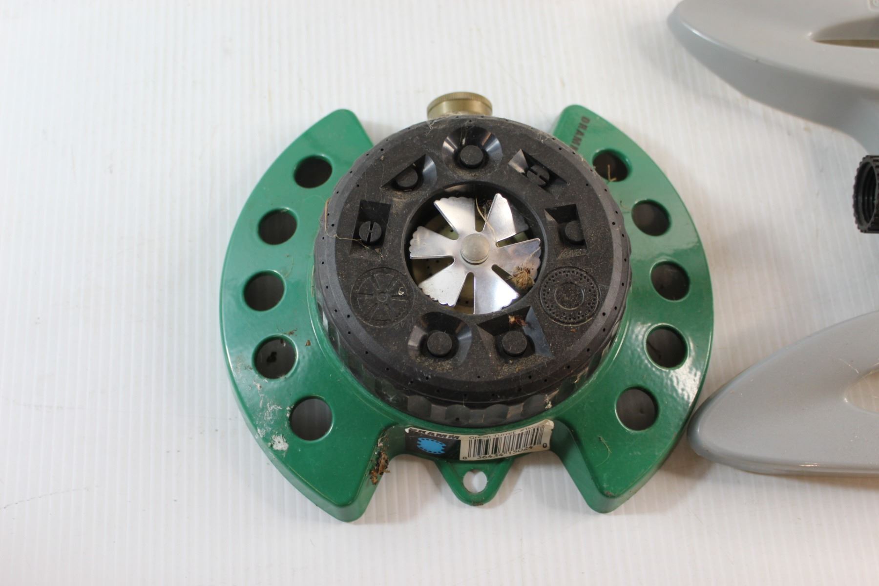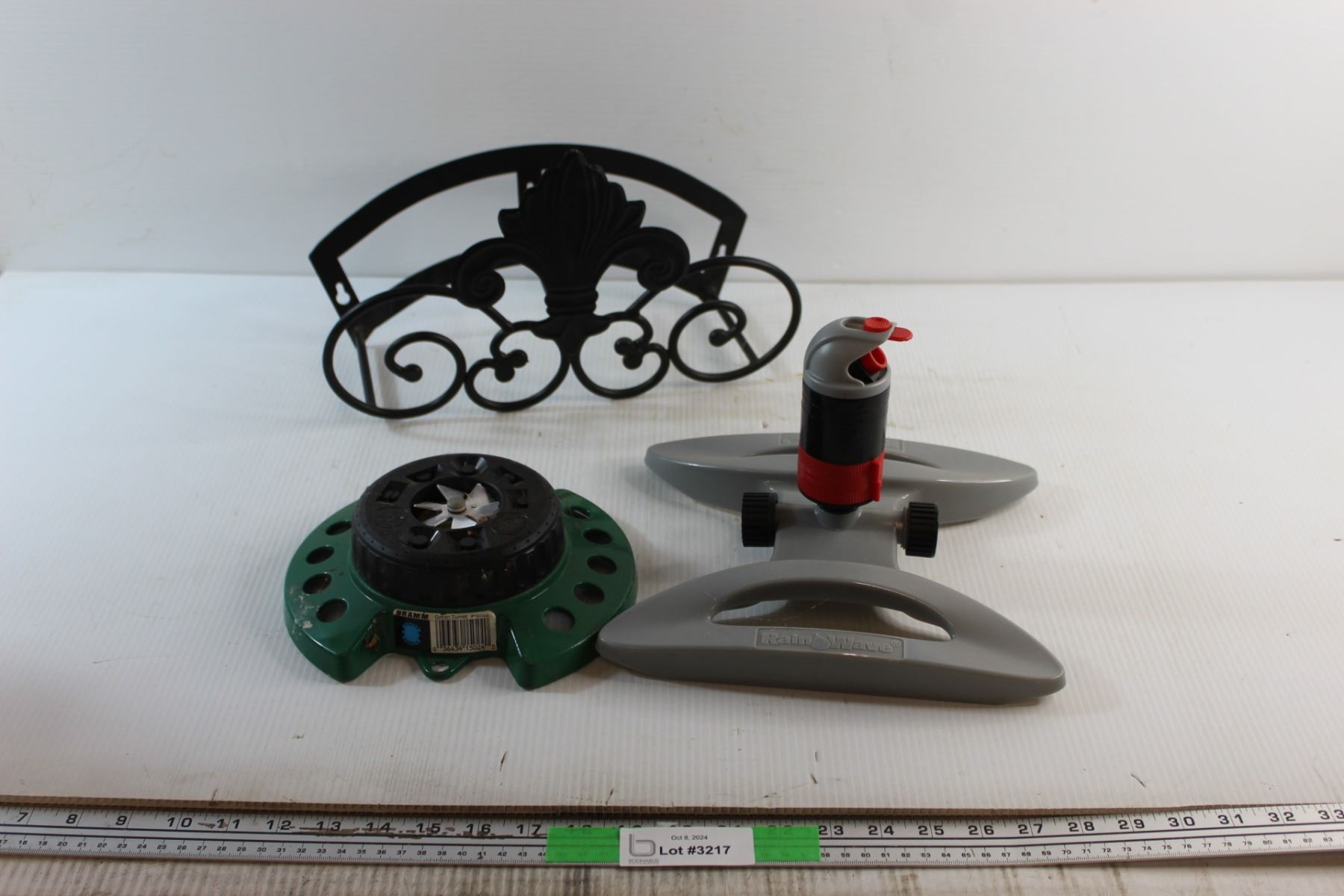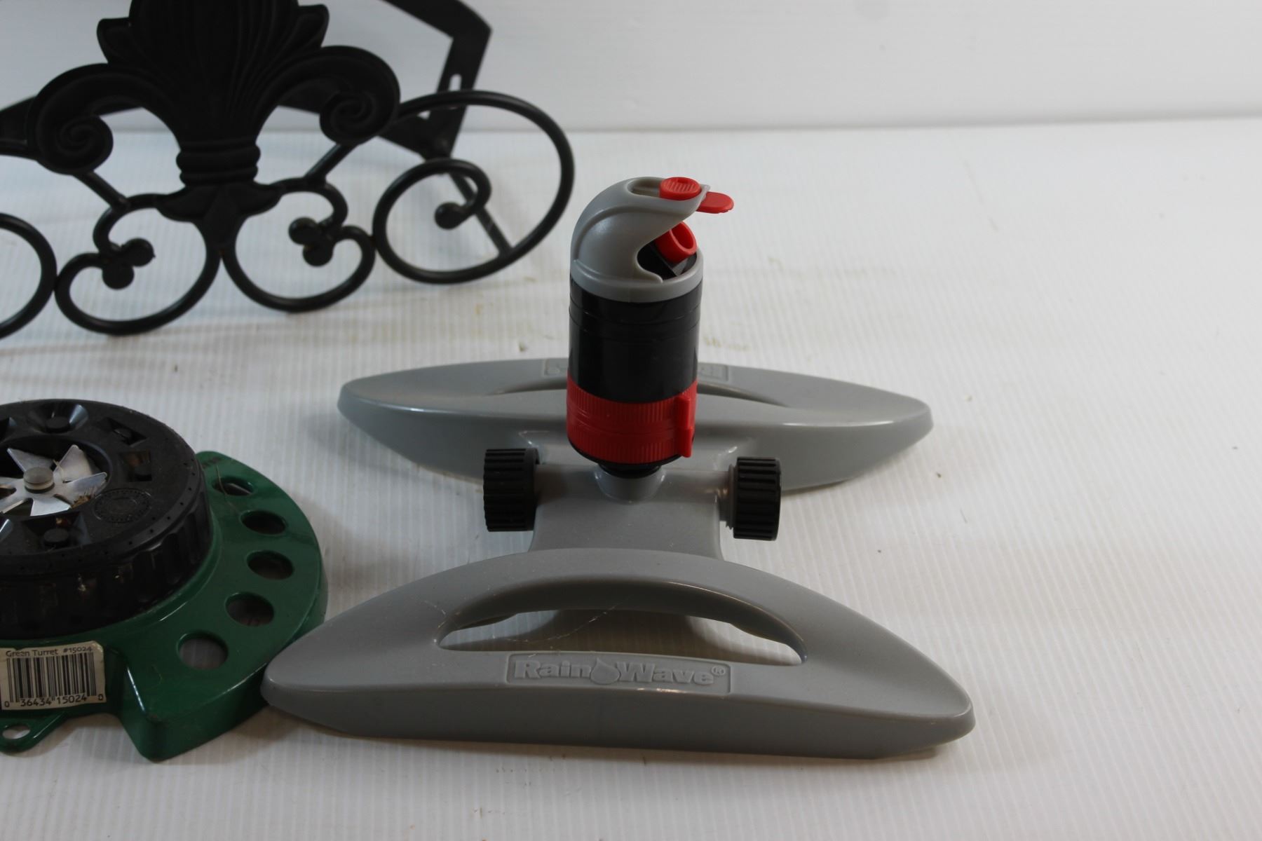 (2) Garden Sprinklers and Wired Garden Hose Hanger