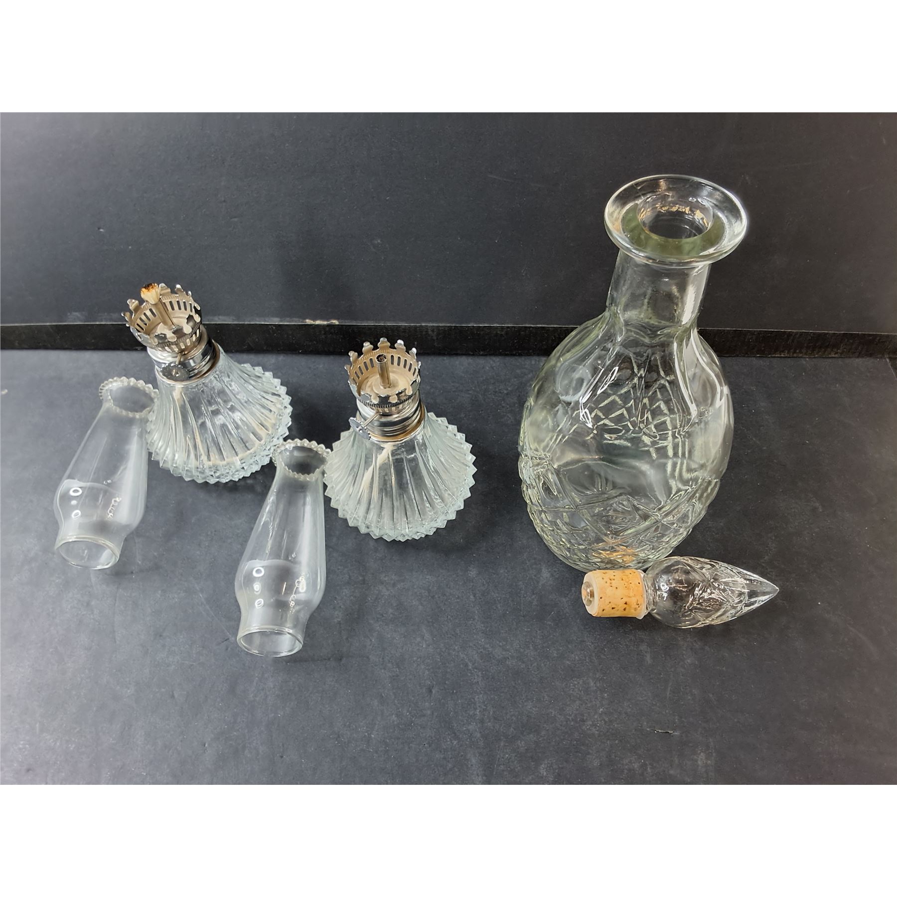 (2) Glass Kerosene Lamps & Glass Decanter 11.5" Tall