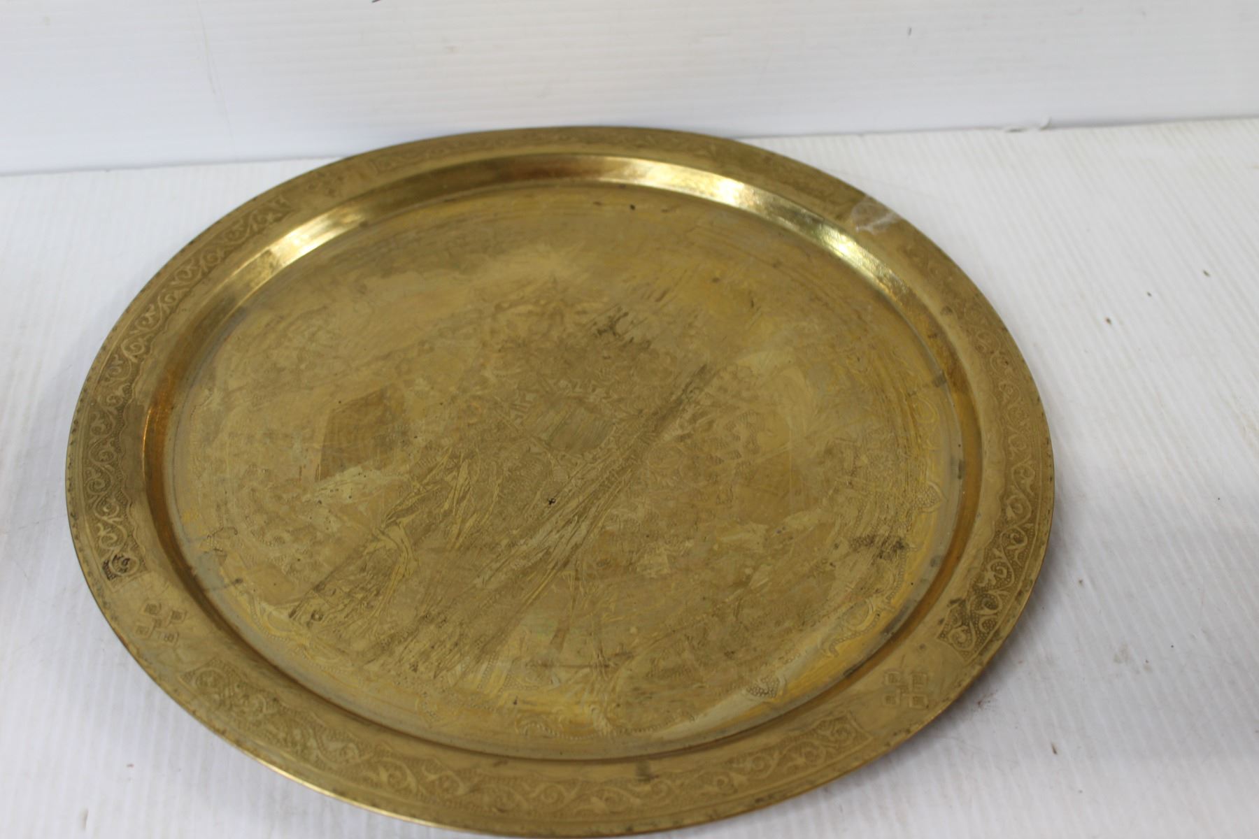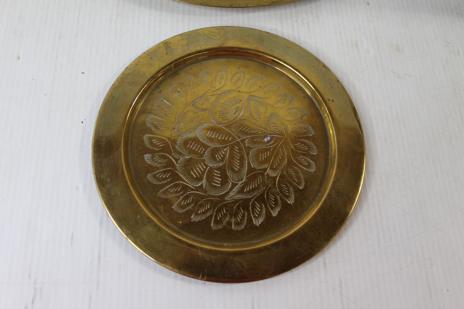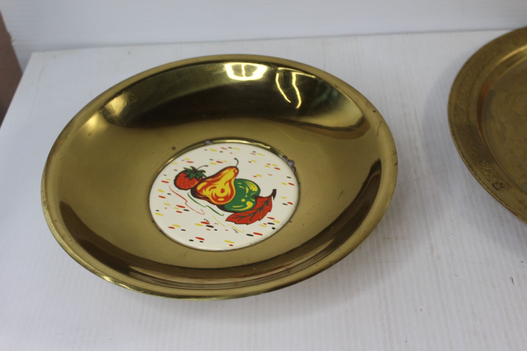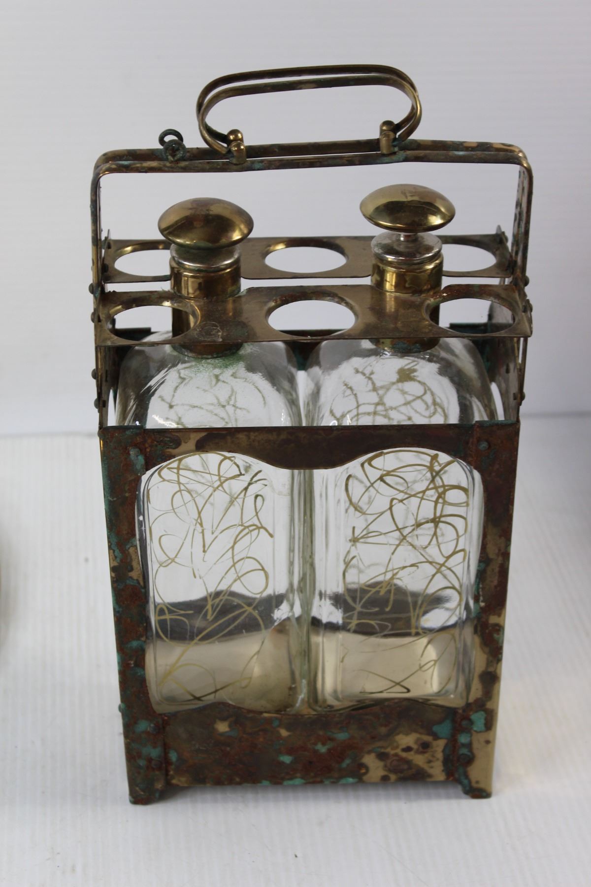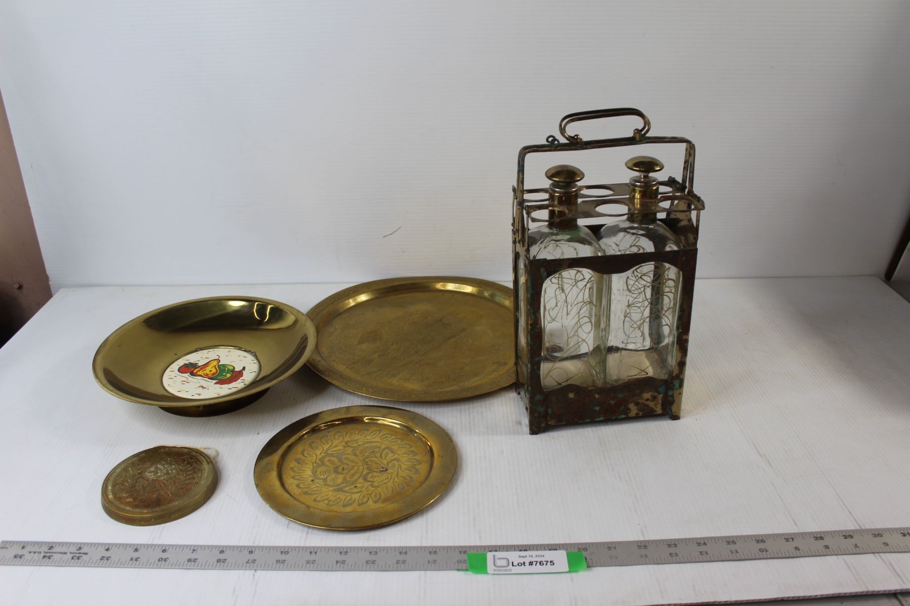 (2) Glass Liquor Bottles and Holder, (4) Brass Dishes/Trays
