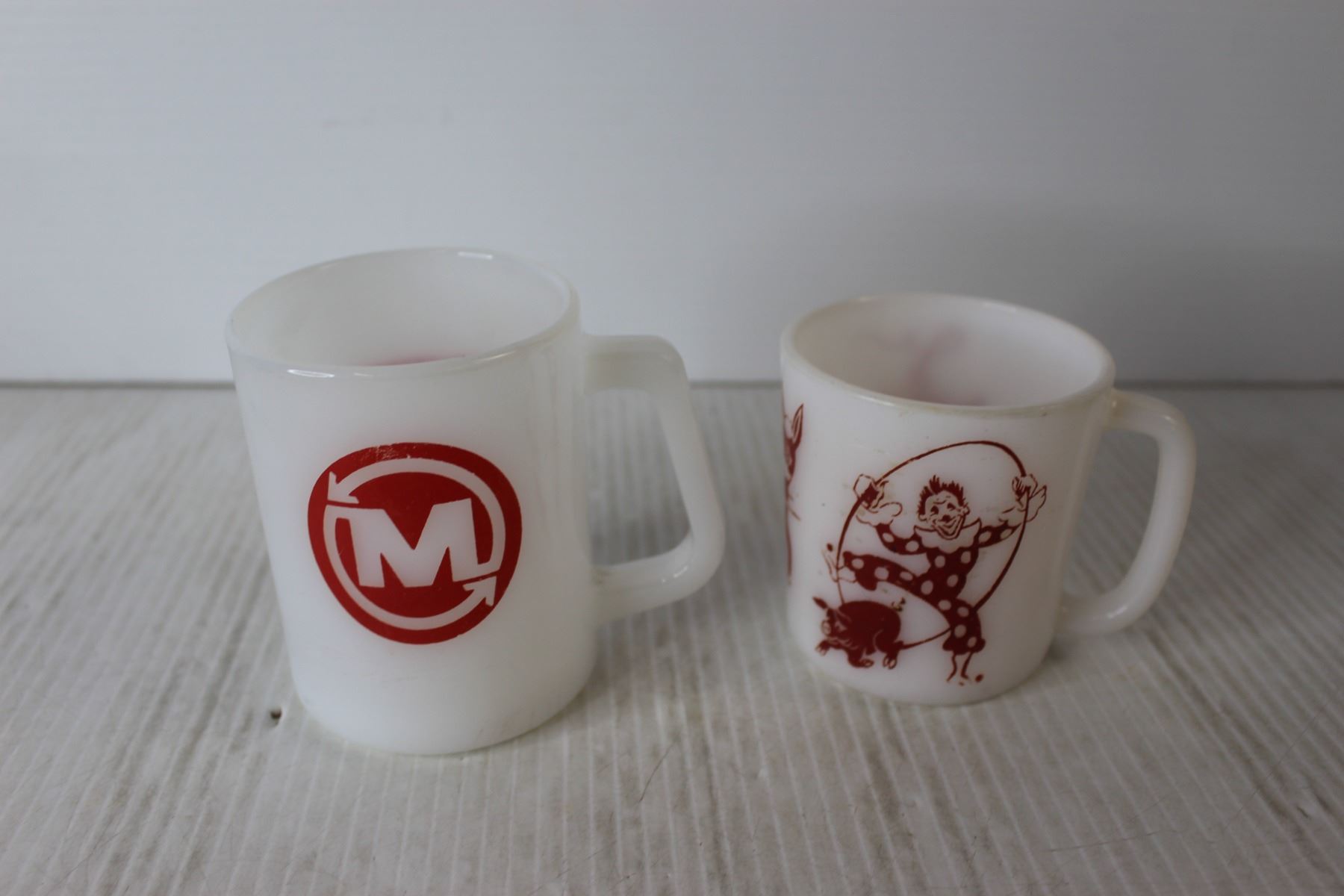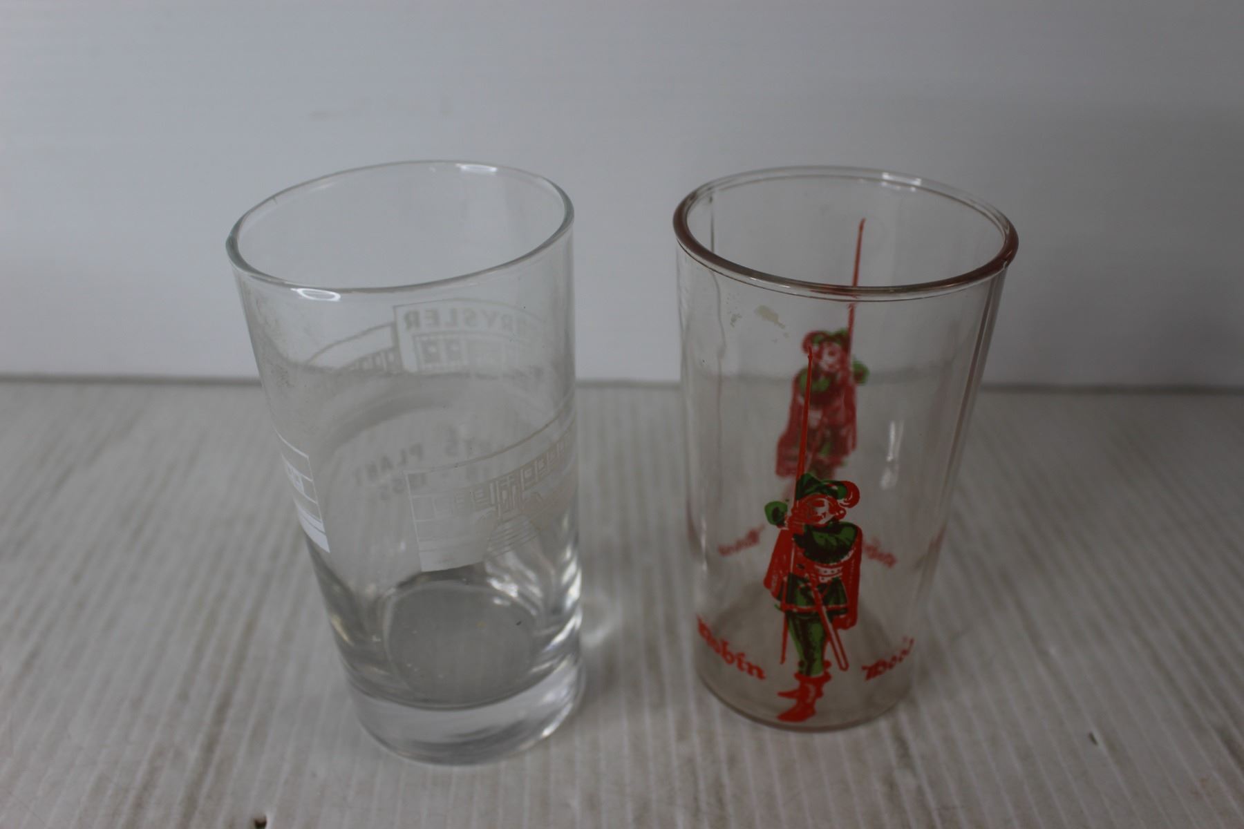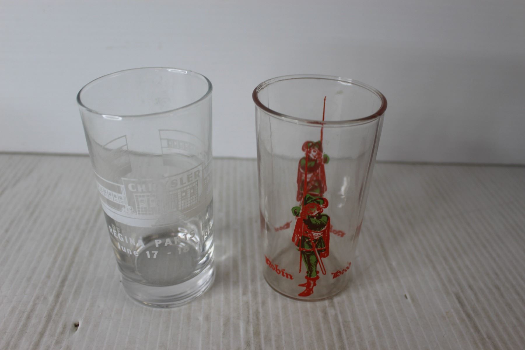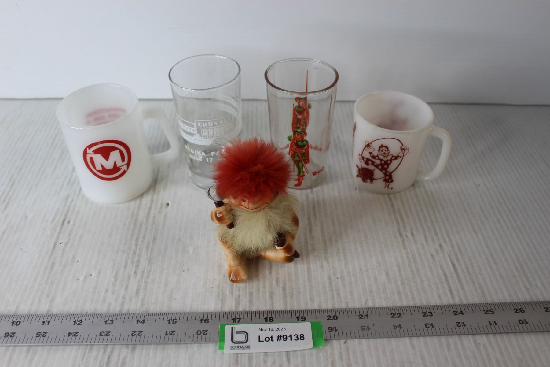 (2) Glasses - Robin Hood, Chrysler Regina Parts Plane, (2) Mugs - Clown, Morris, Caveman Ornament
