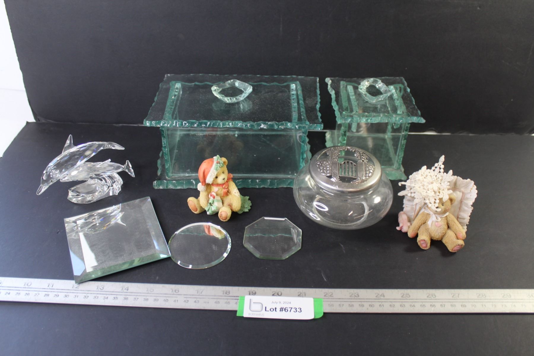 (2) Green Glass Containers w/Lids - (2) Bear Ornaments - Round Glass Dish w/Metal Lid - (3) Pieces of Mirror Stands? - Crystal Dolphins