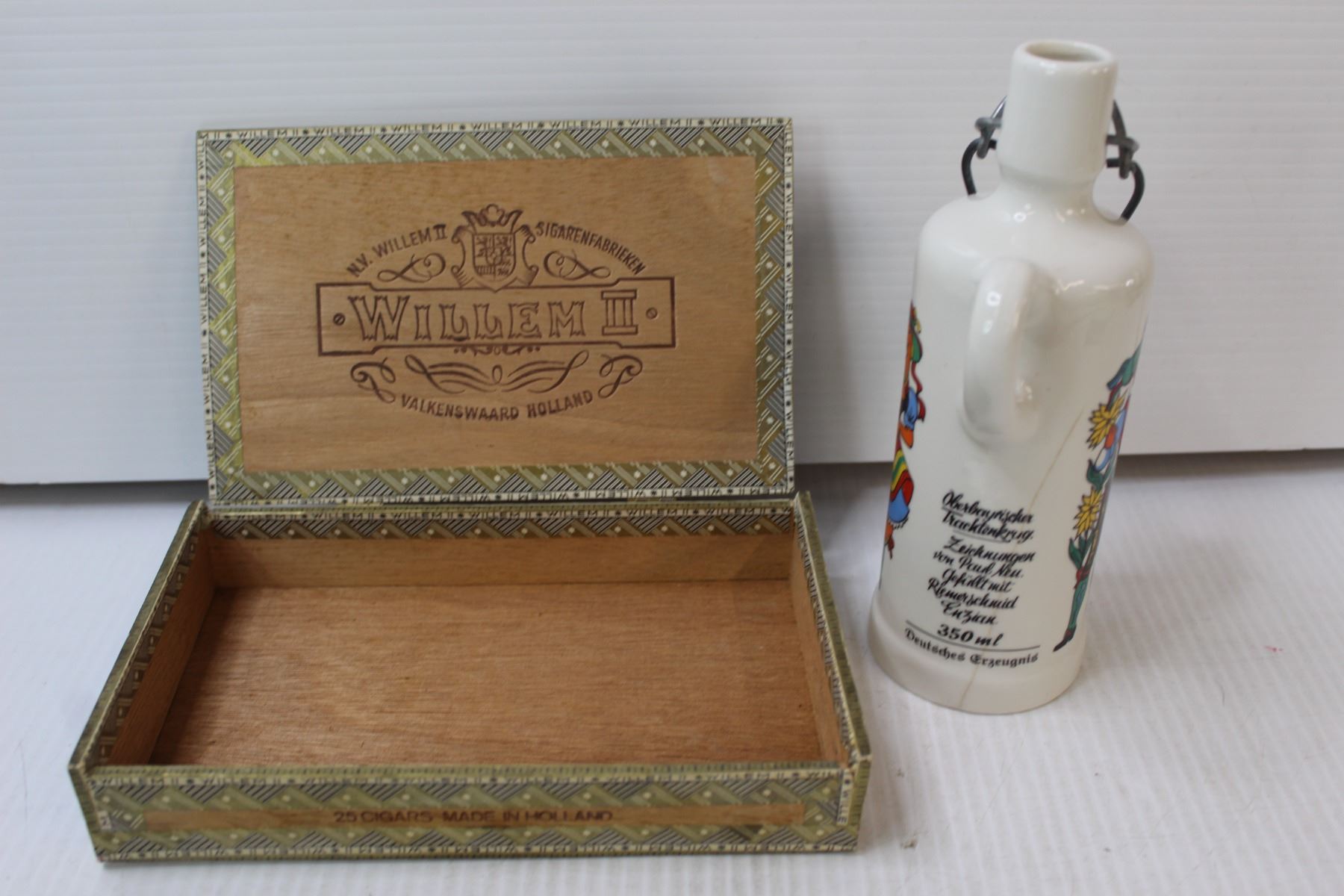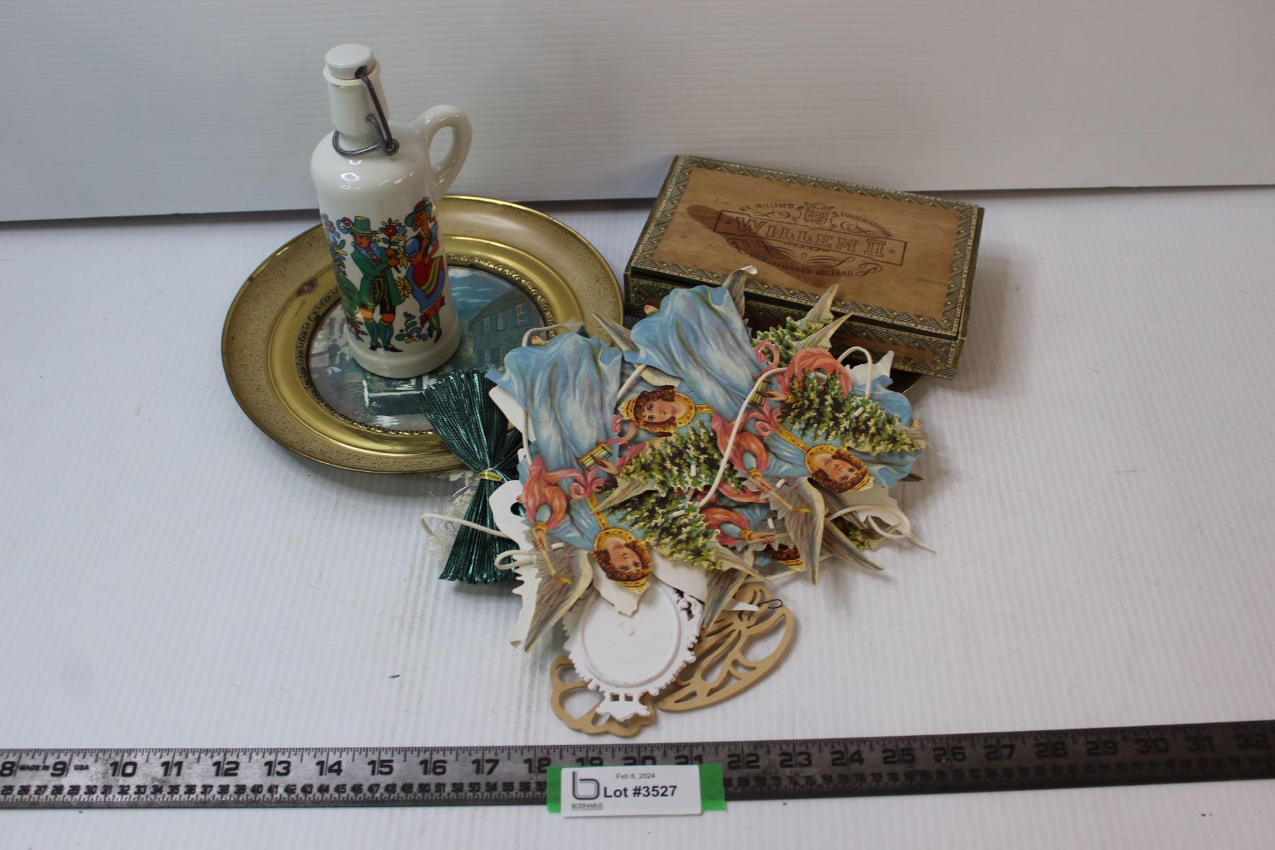 (2) Hanging Brass Plates, Cigar Box, Collector Liquor Bottle, Paper Angel Garland, Christmas Decorat