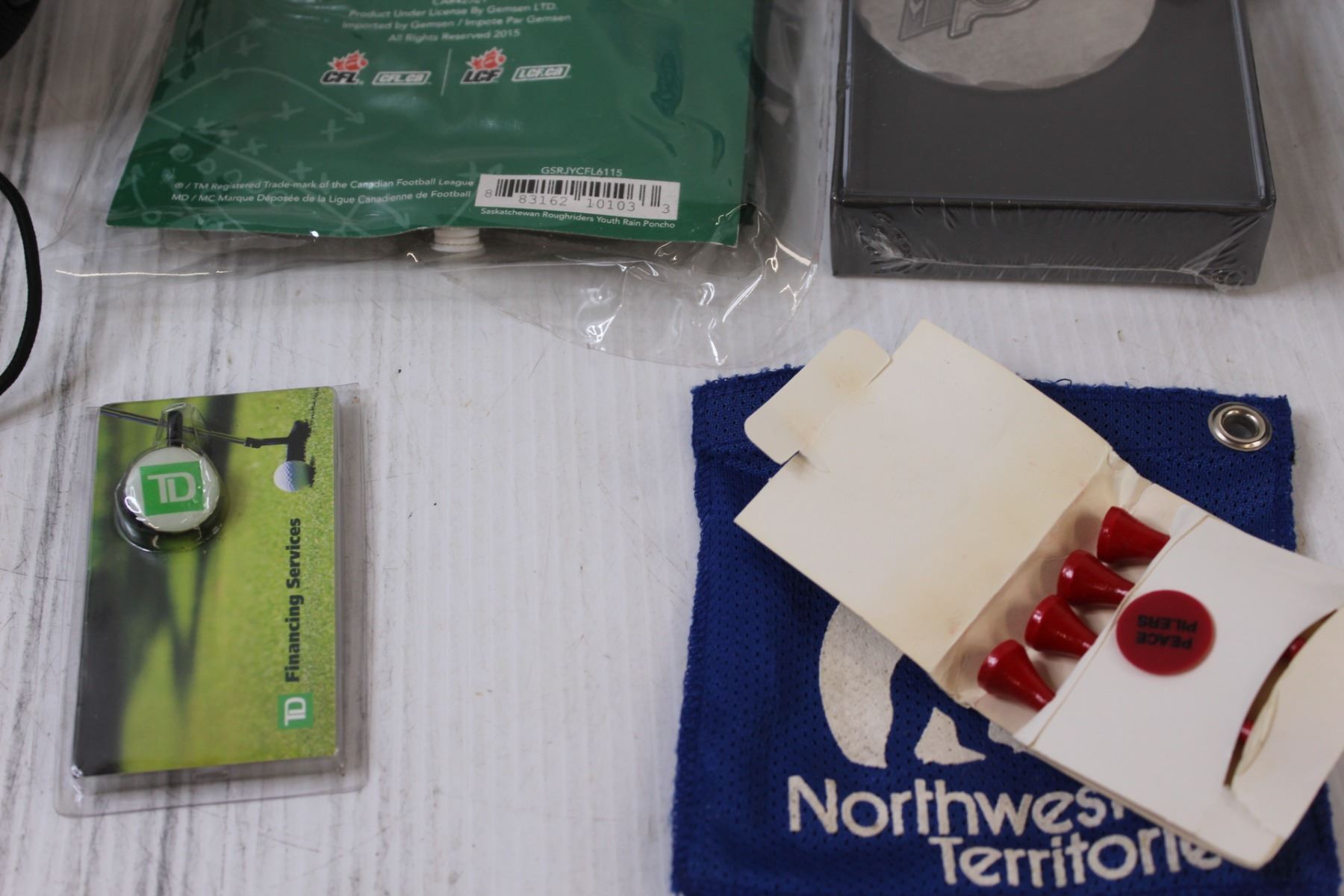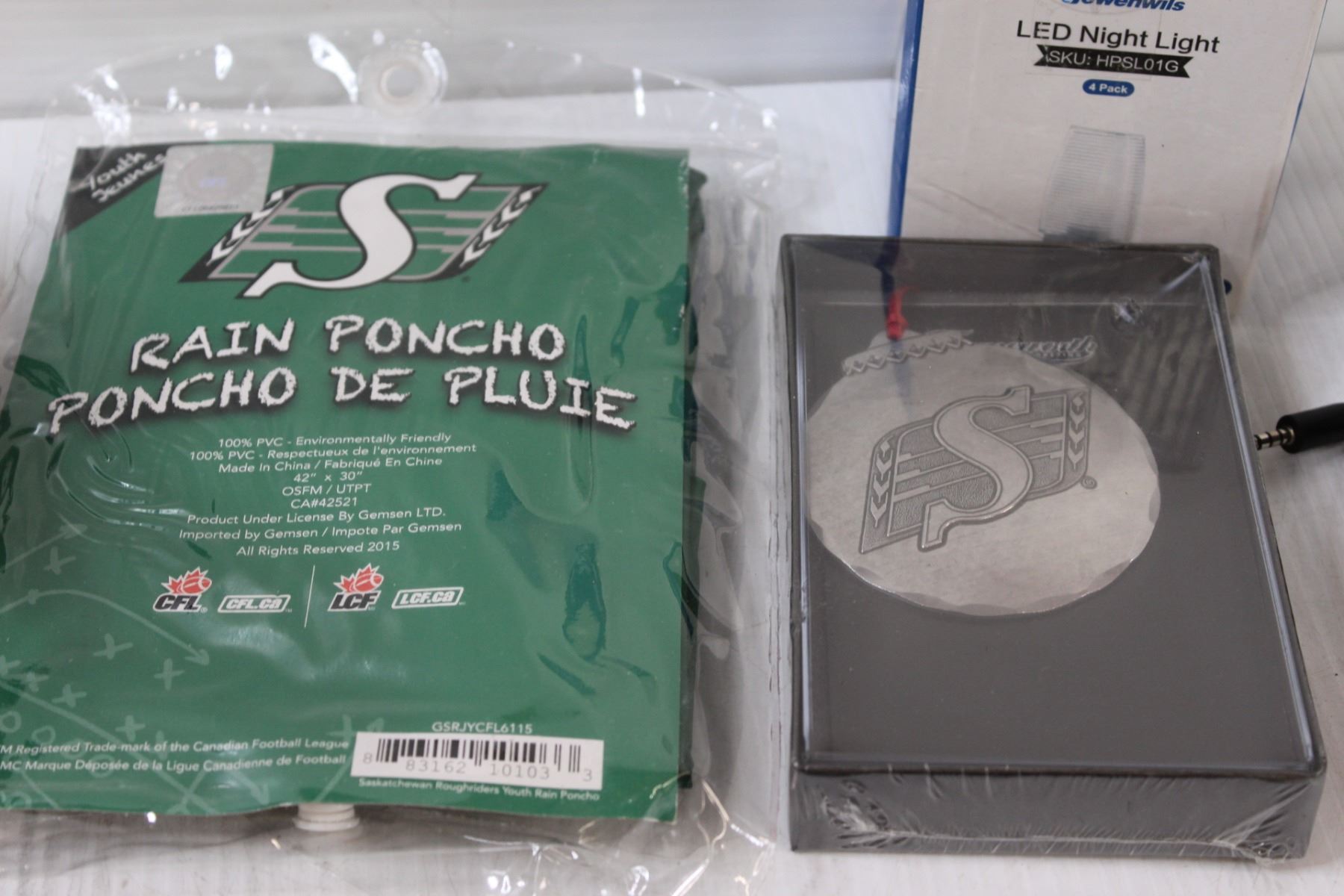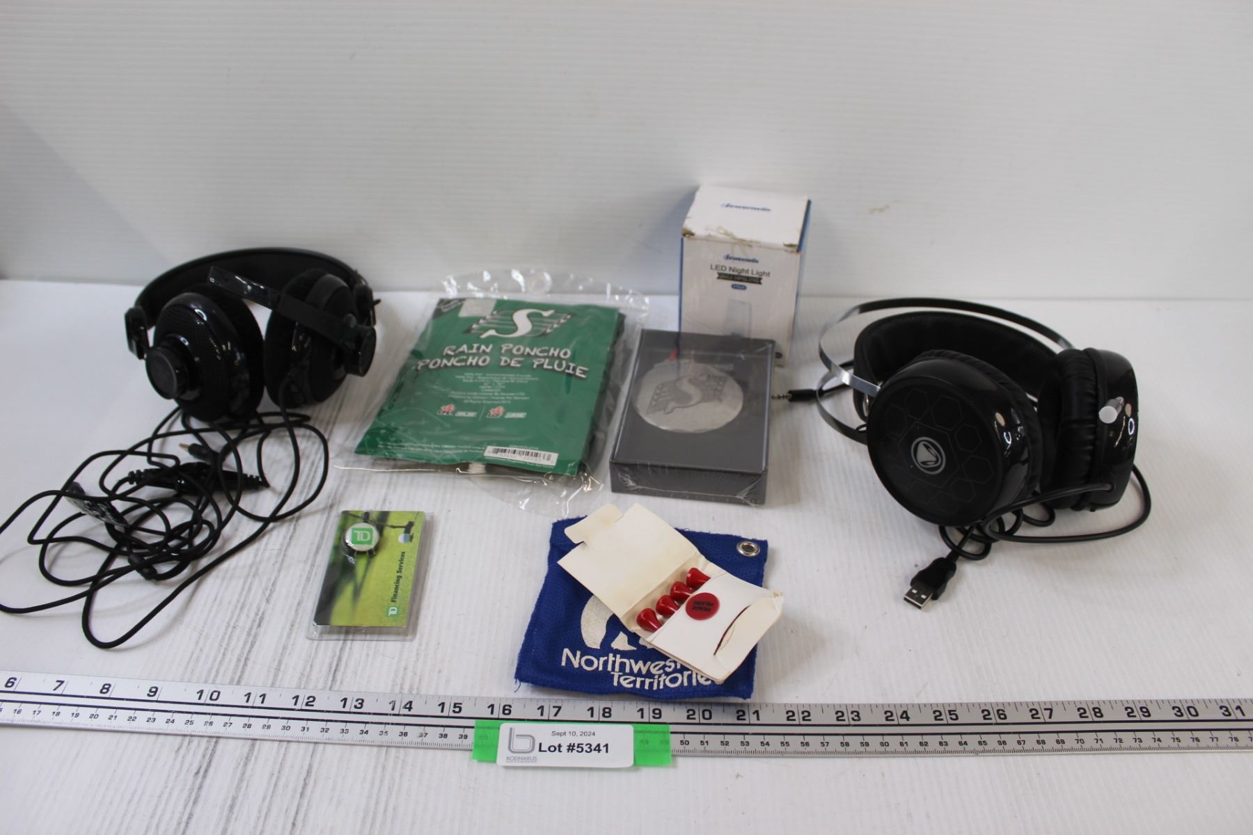 (2) Headphones w/Mic, Golf Tees, (4) Nightlights, Roughriders Rain Poncho
