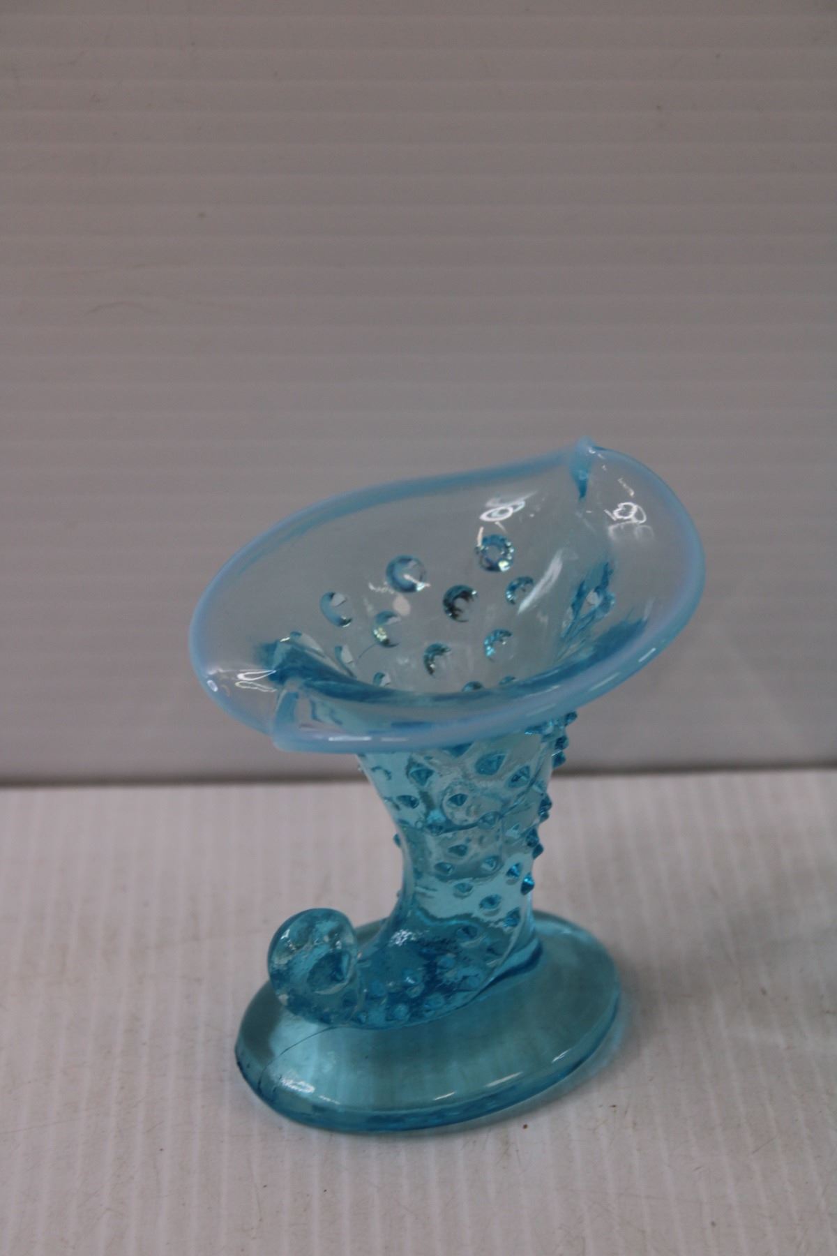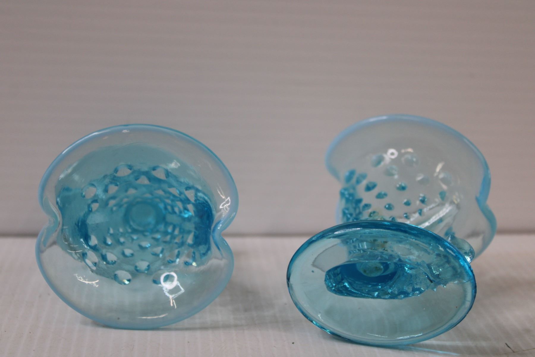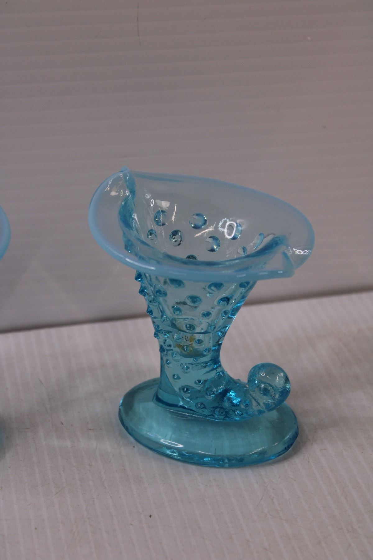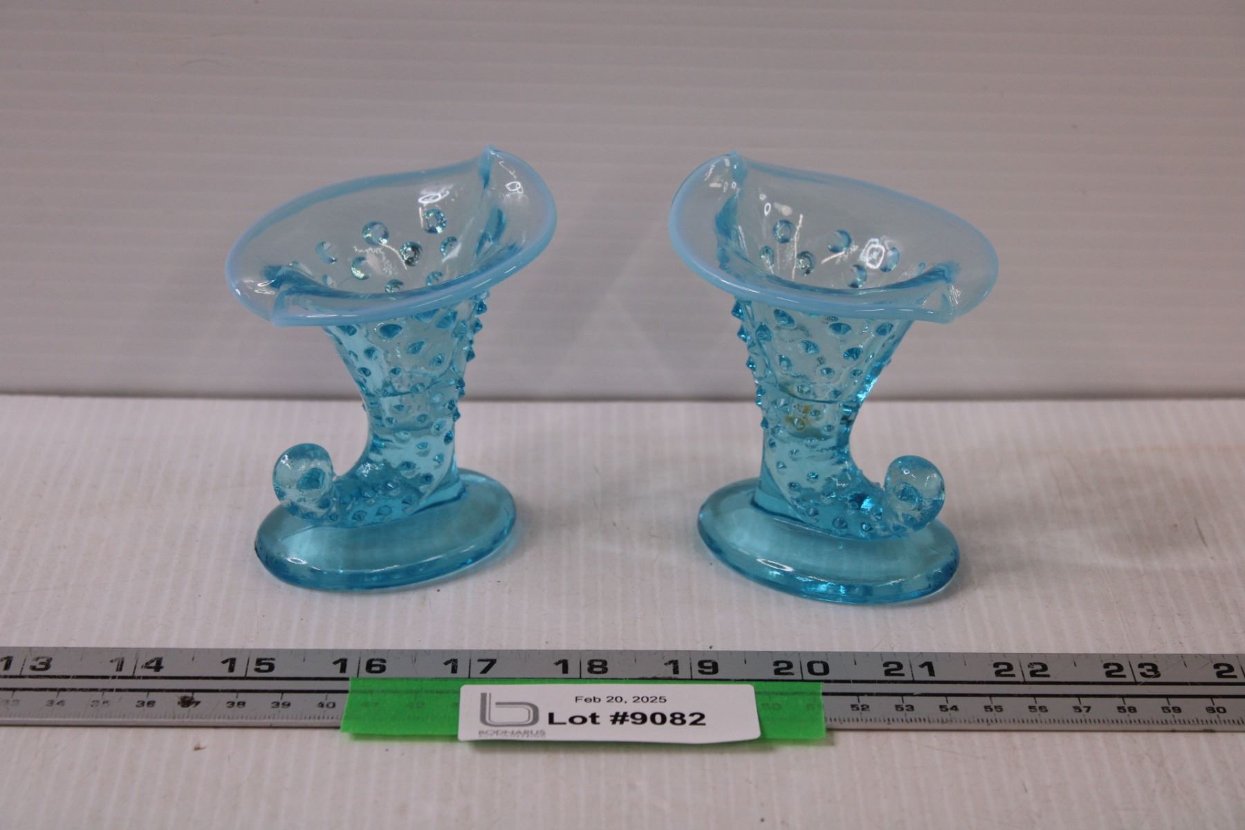 (2) Hobnail Blue Art Glass Cornucopia - 4" Tall