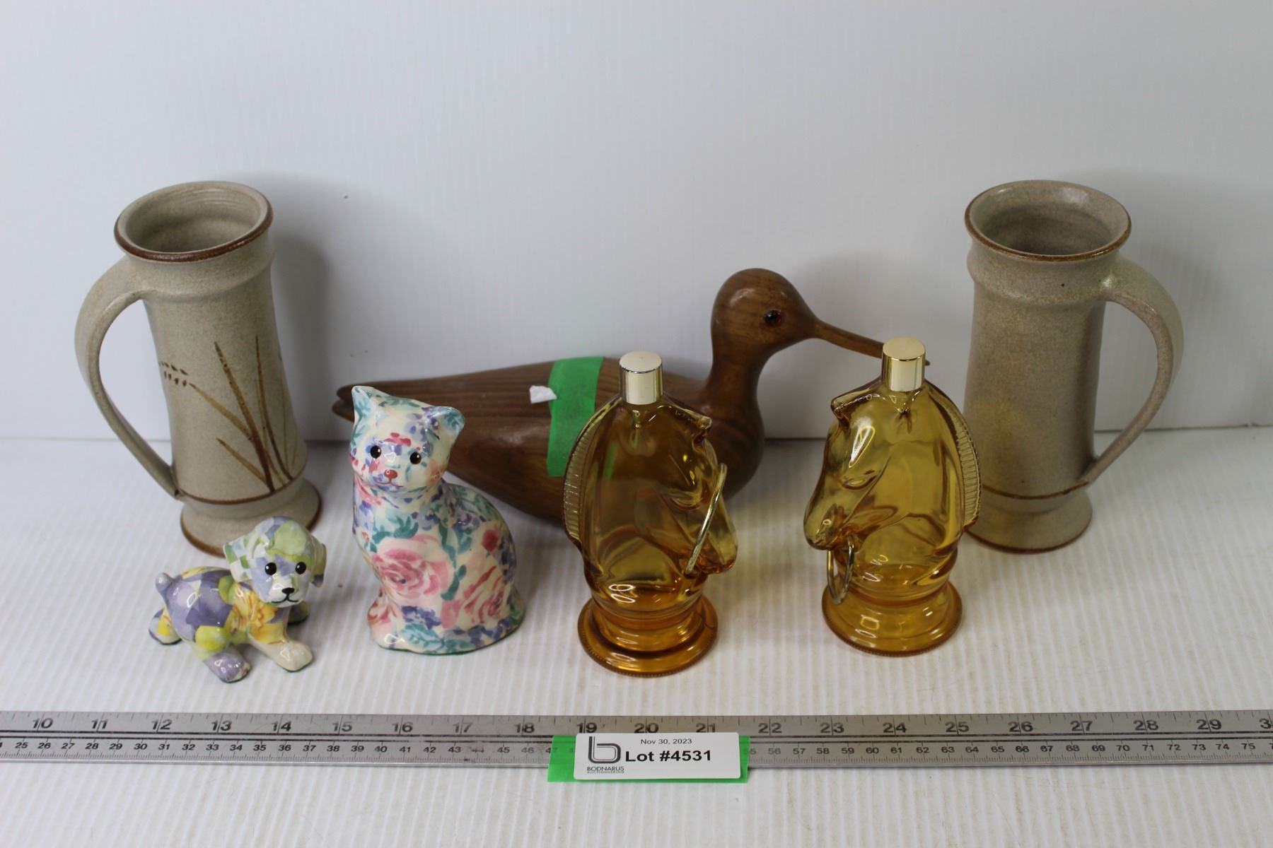 (2) Horse Perfume Bottles - Wooden Bird - Tall Cups - Ceramic Cat & Dog Ornaments
