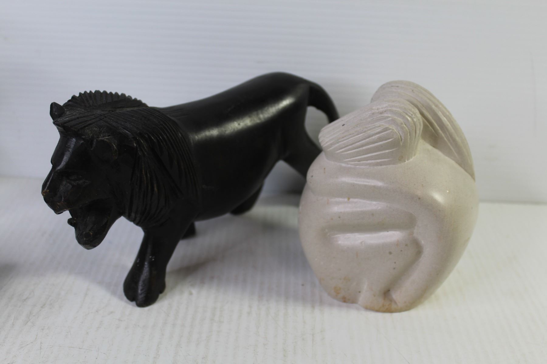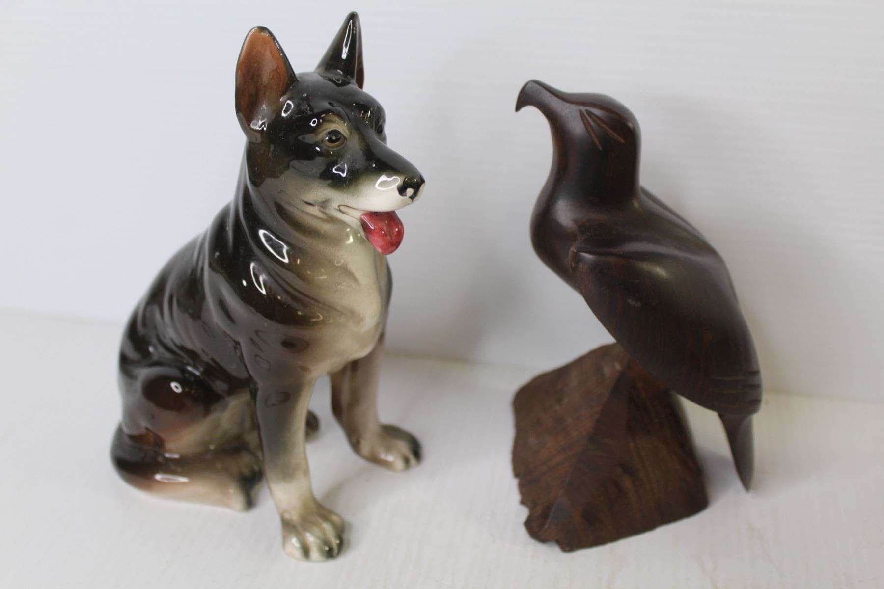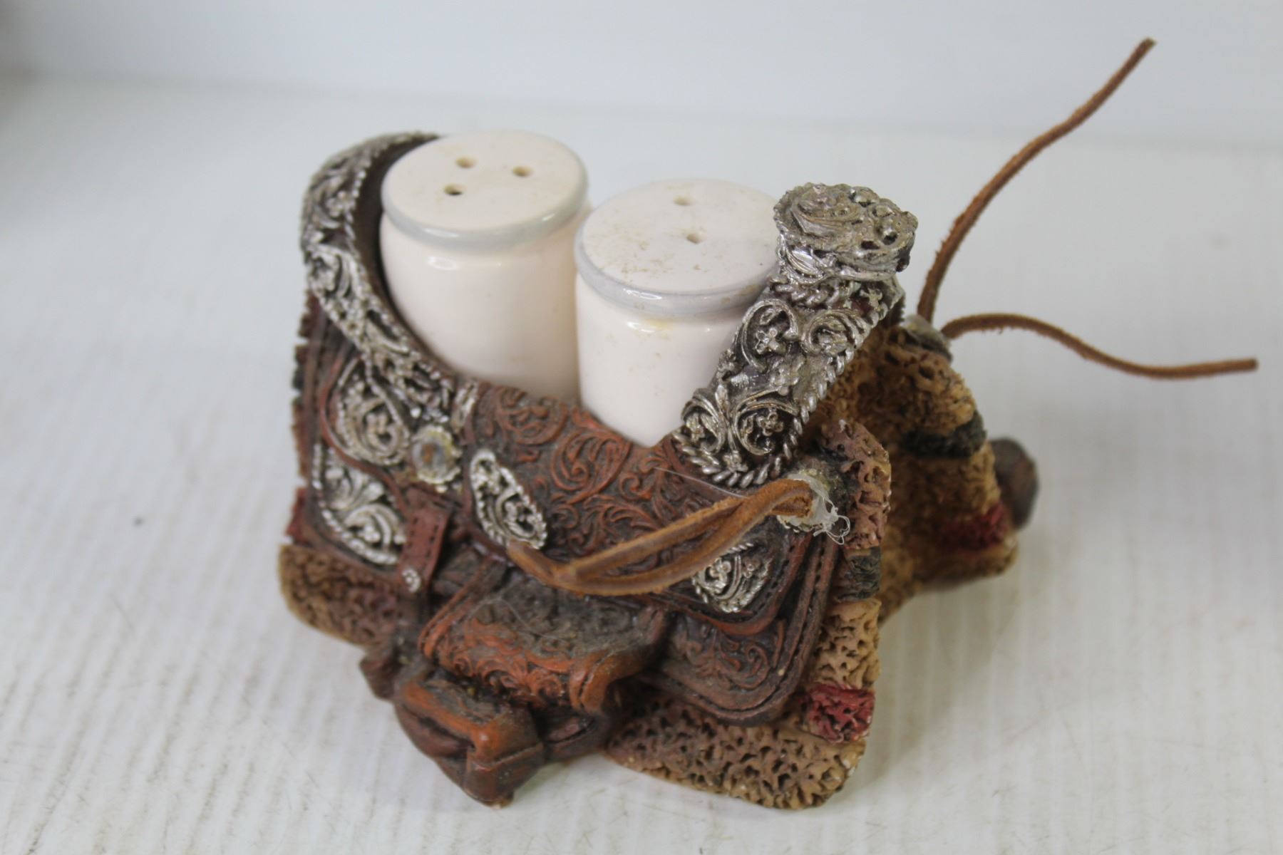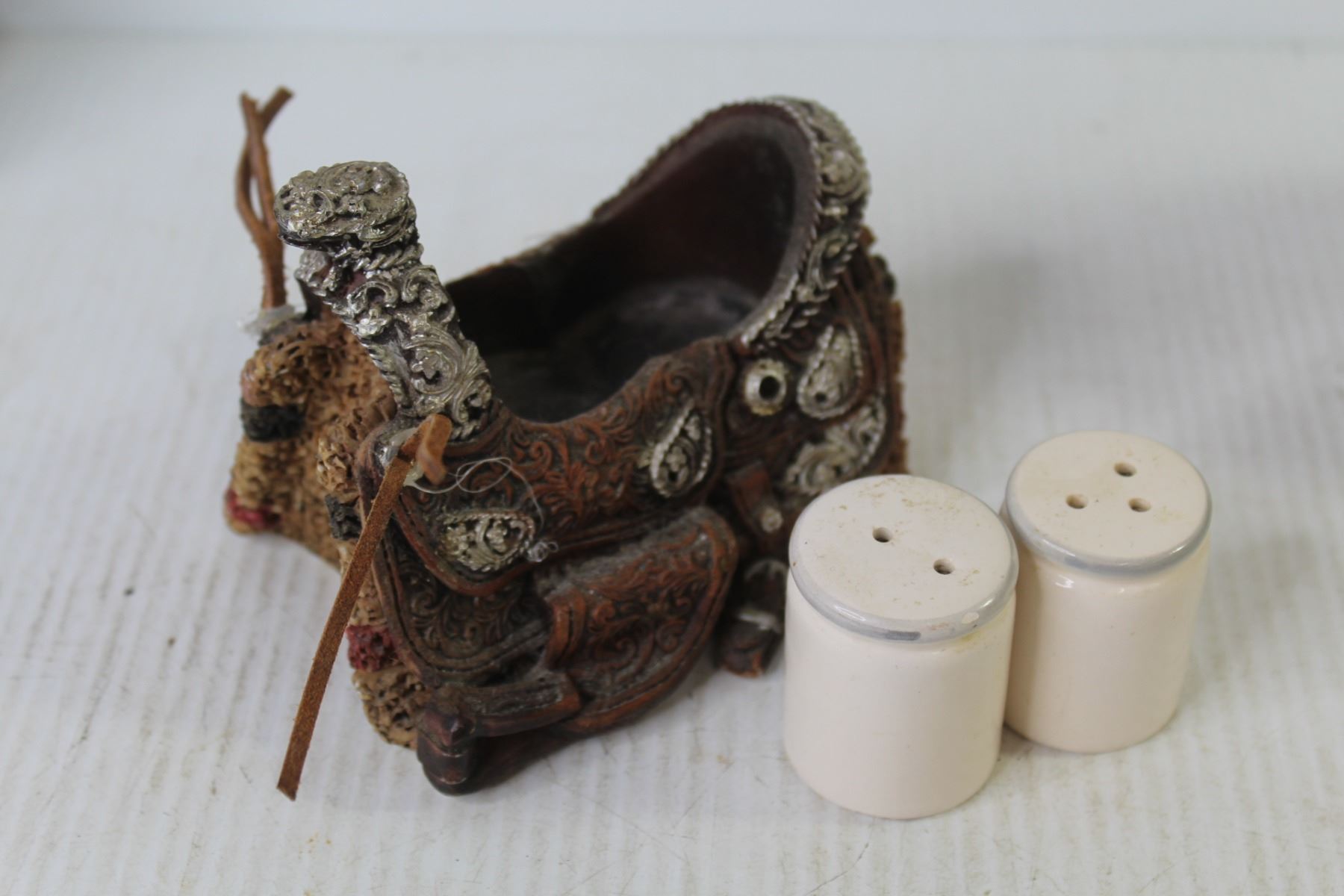 (2) Iron Wood Carvings - Ceramic Dog - Stone Type Carving - Saddle Salt & Pepper Shakers