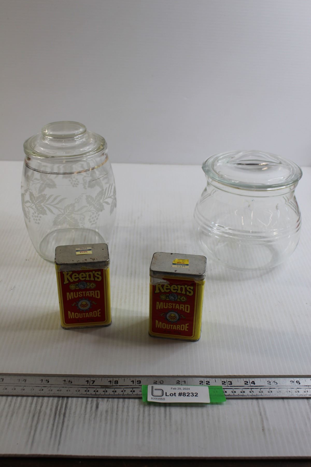 (2) Keen's Mustard Tins, (2) Glass Jars