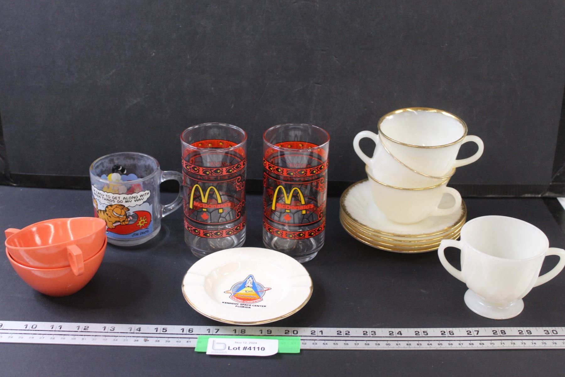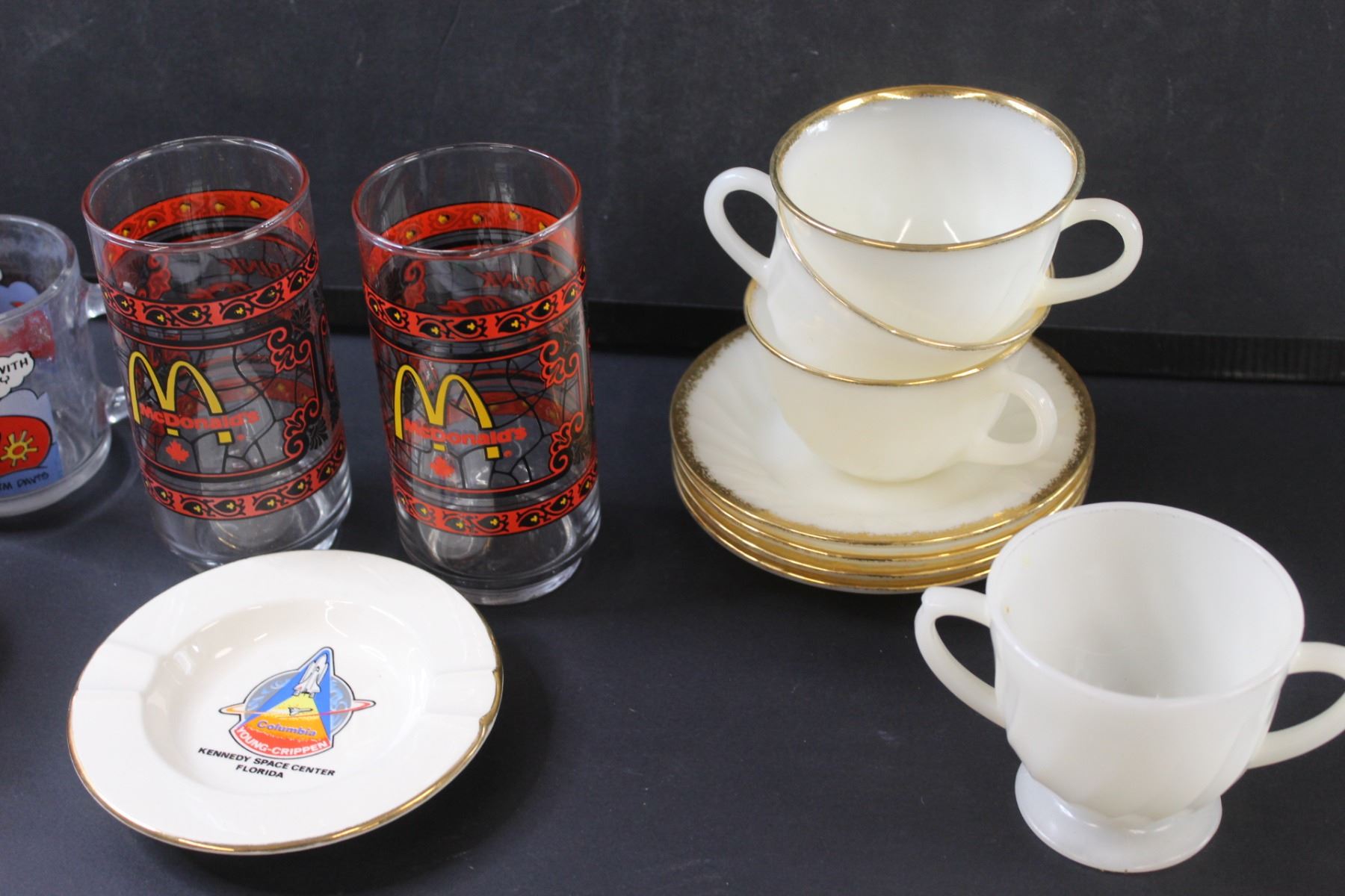 (2) McDonalds Glasses, Garfield Glass, (2) Aztec Melamine Cups, Fire King Teacup Set, Fire King Sugar Bowl, Kennedy Space Station Ashtray