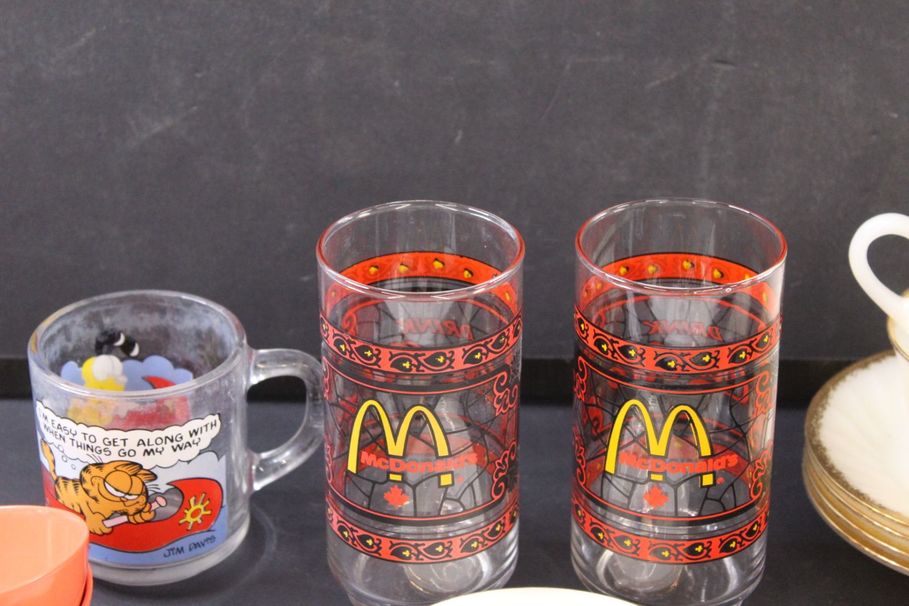 (2) McDonalds Glasses, Garfield Glass, (2) Aztec Melamine Cups, Fire King Teacup Set, Fire King Suga