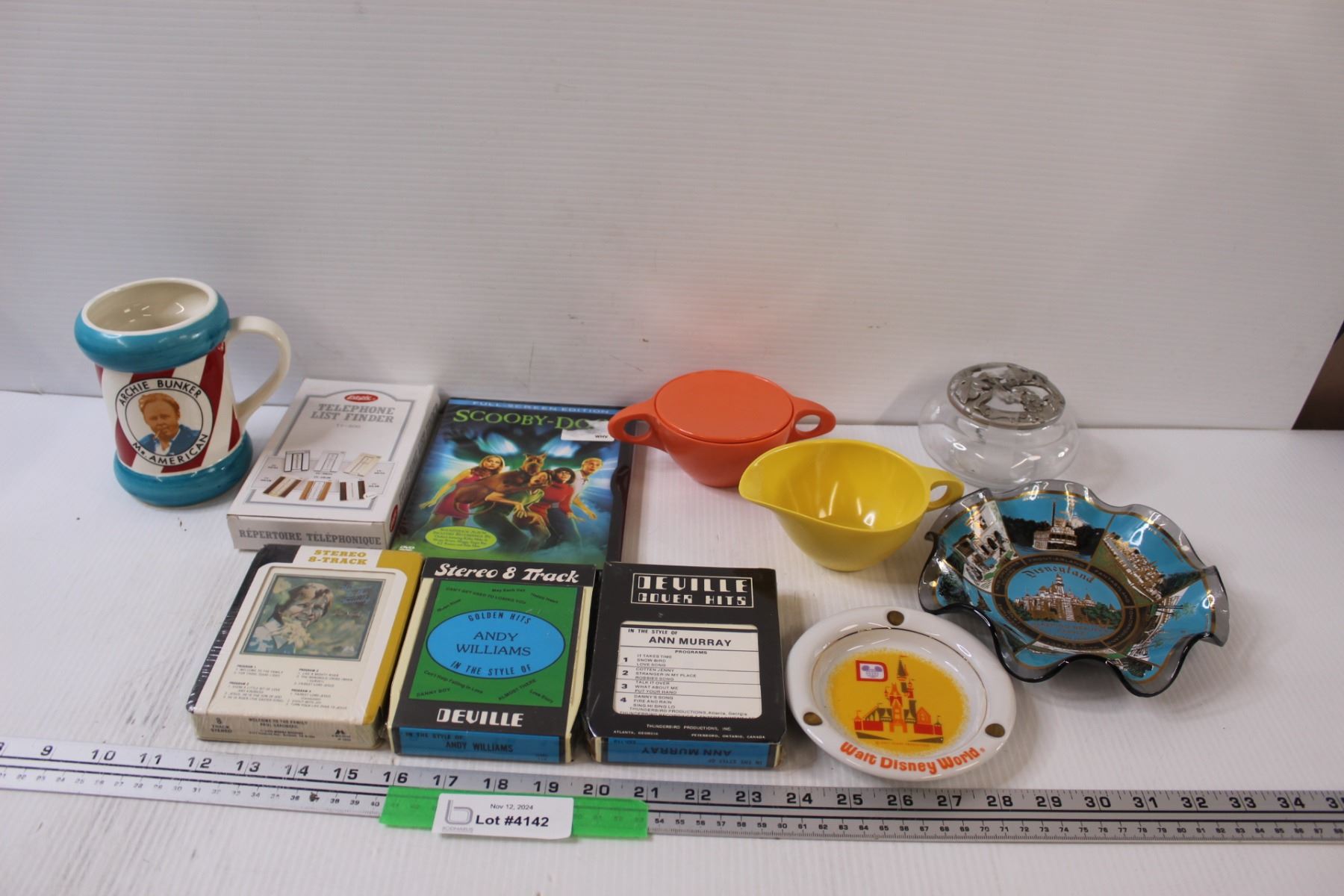 (2) Melamine Sugar & Creamer Set, (3) Eight Tracks, Disneyland Ashtrays, Scooby Doo DVD, Misc.