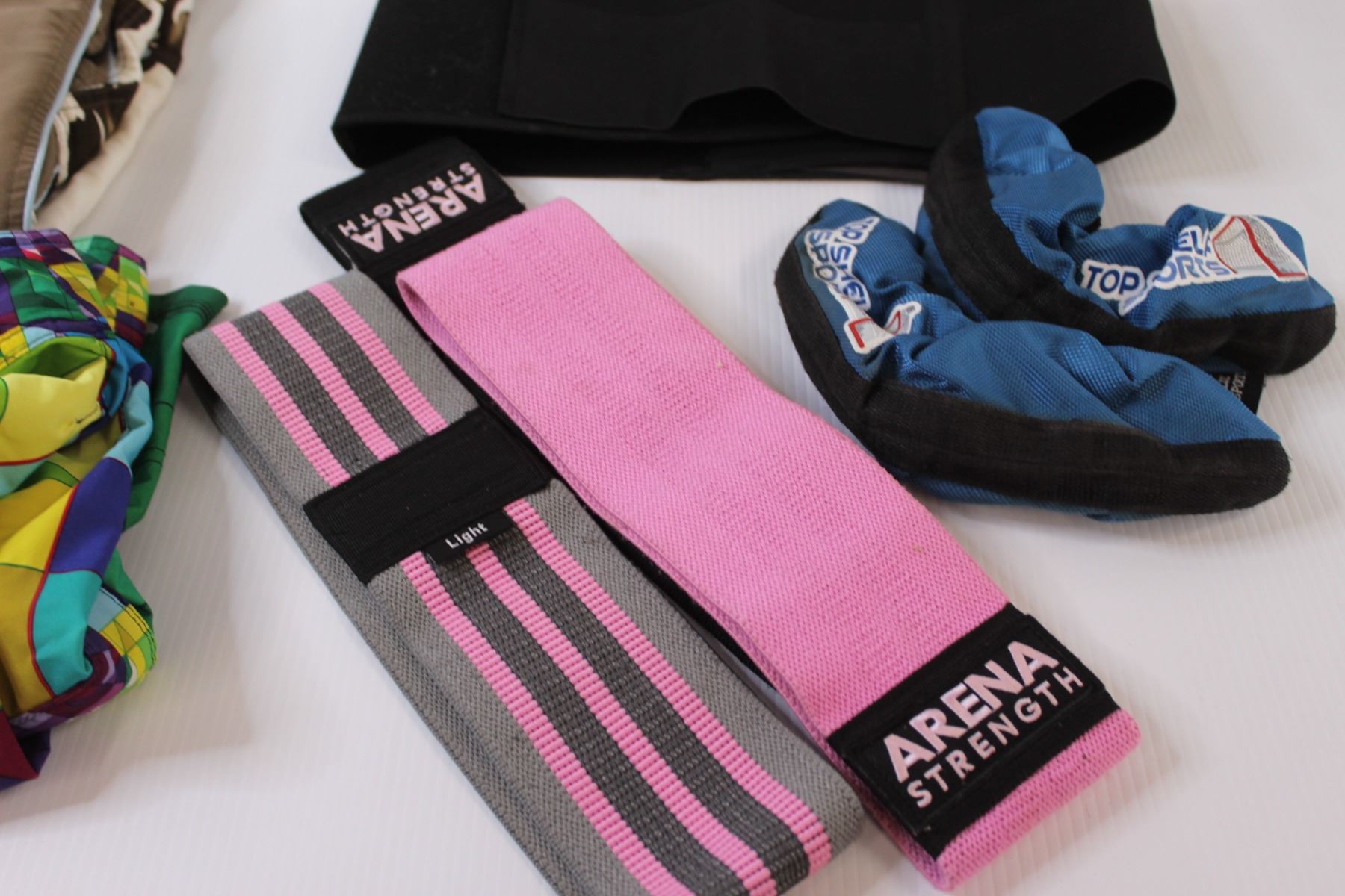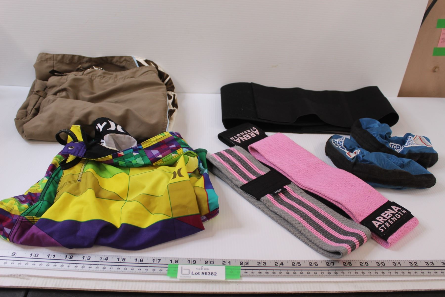 (2) Men's Swim Shorts (Size 36), (3) Exercise Belts, Hockey Skate Blade Protectors, Back Brace