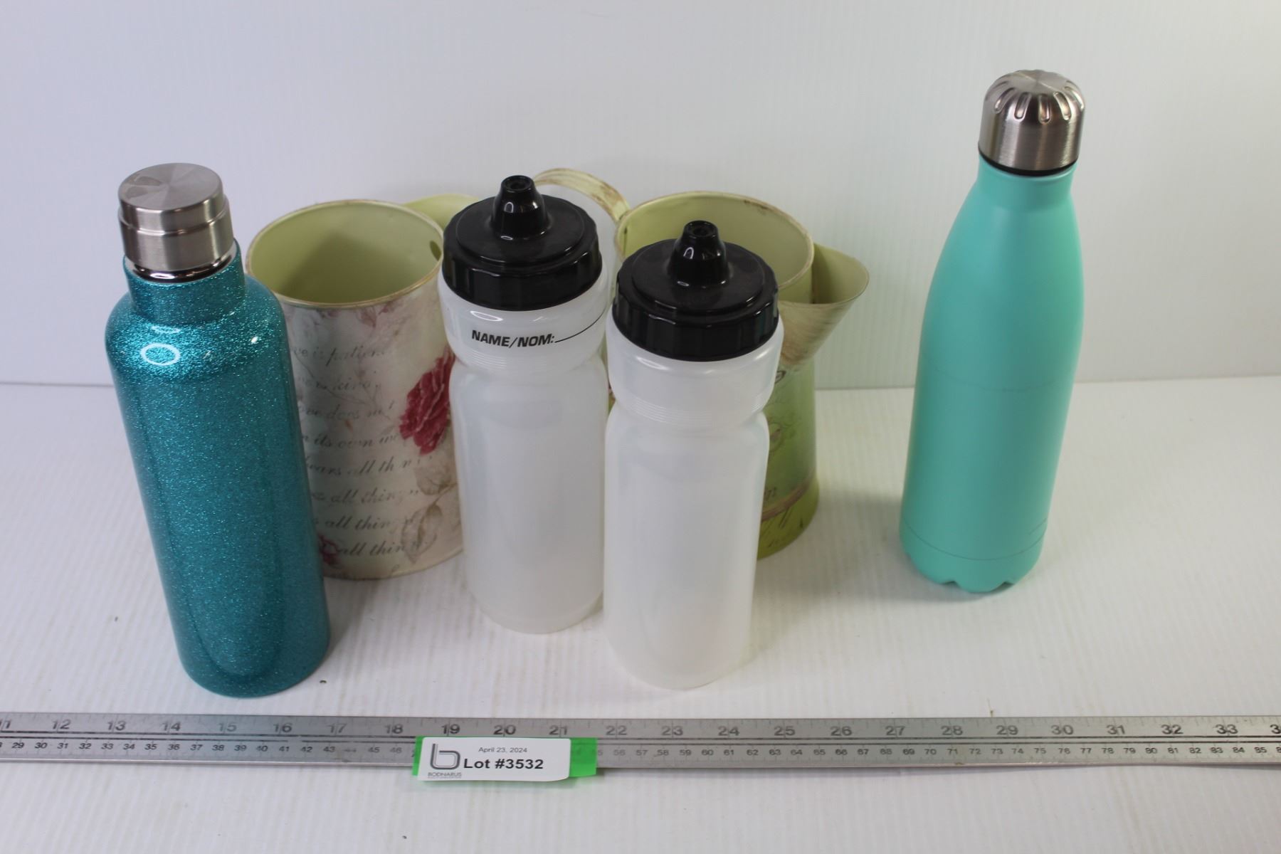 (2) Metal Watering Cans, (2) Plastic Water Bottles, (2) Insulated Bottles