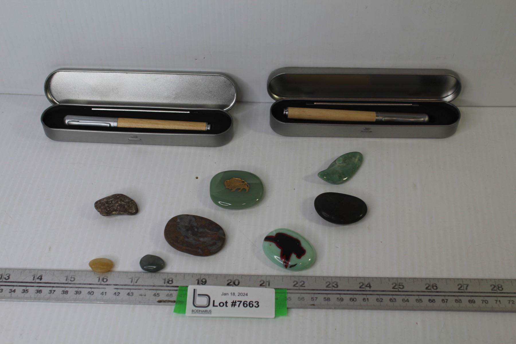 (2) Metal & Wood Pens in Cases - Polished Stones