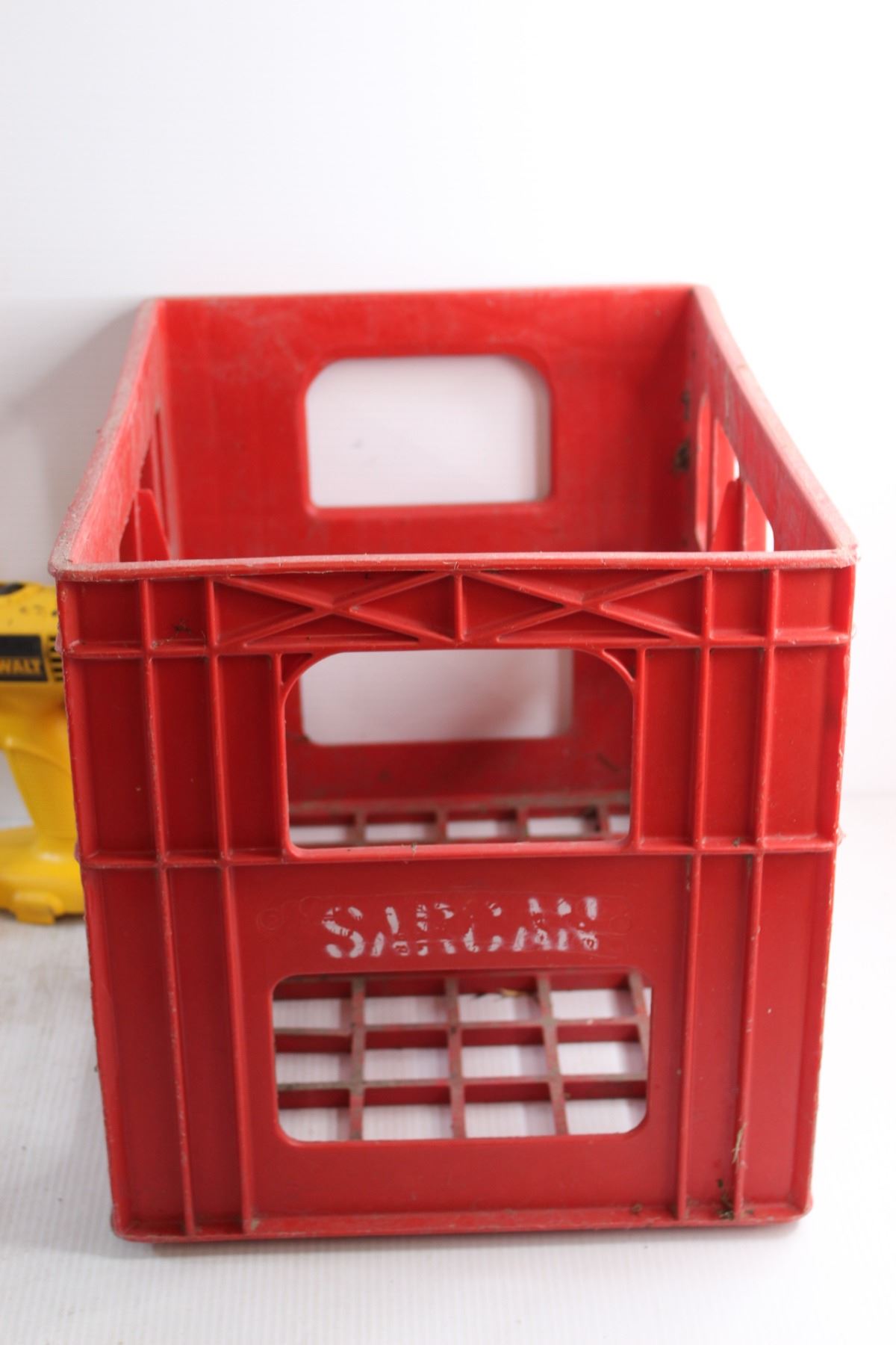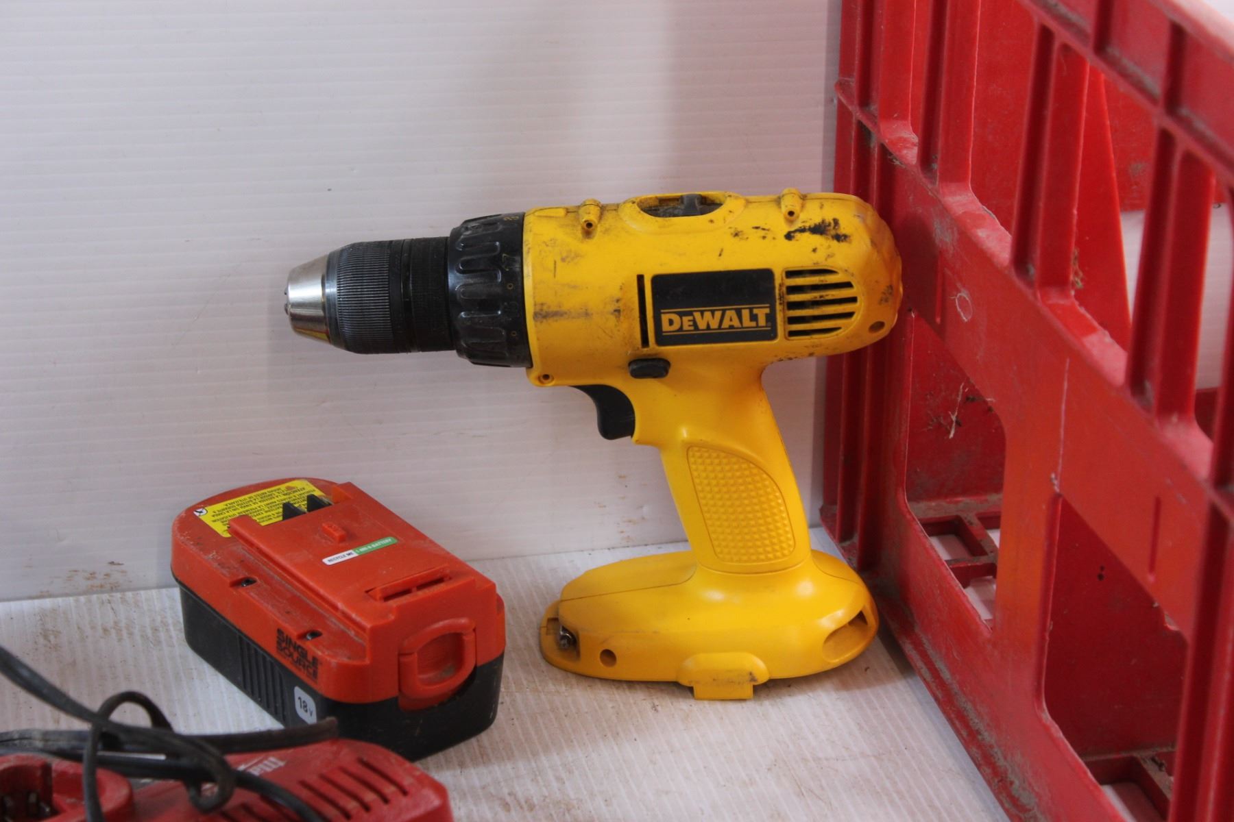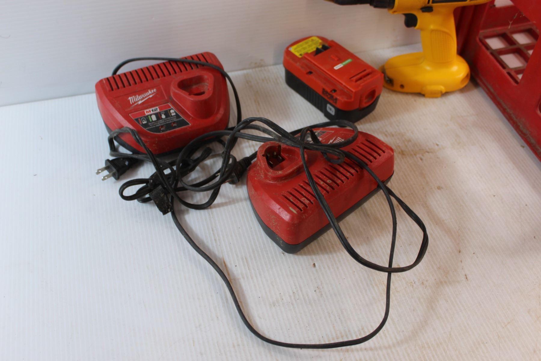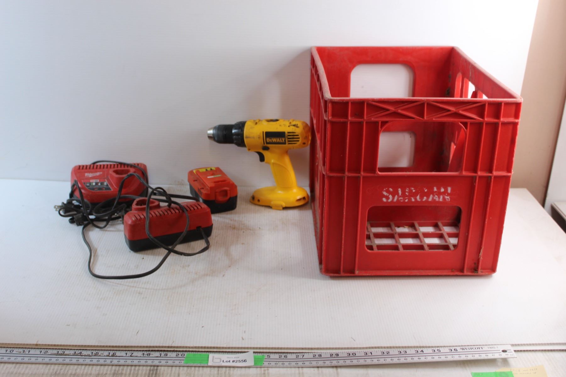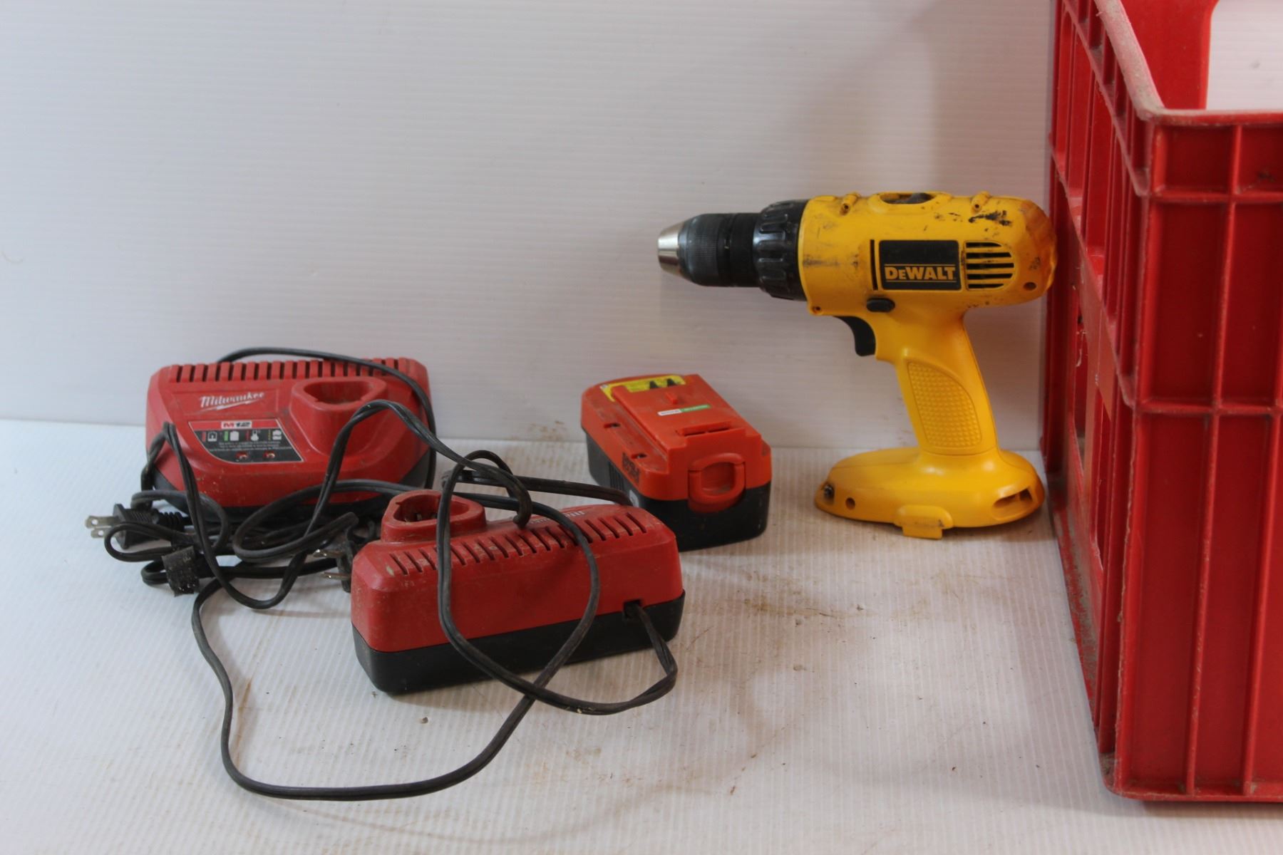 (2) Milwaukee Chargers, DeWalt Cordless Drill, 18V Drill Battery and Crate - As Is