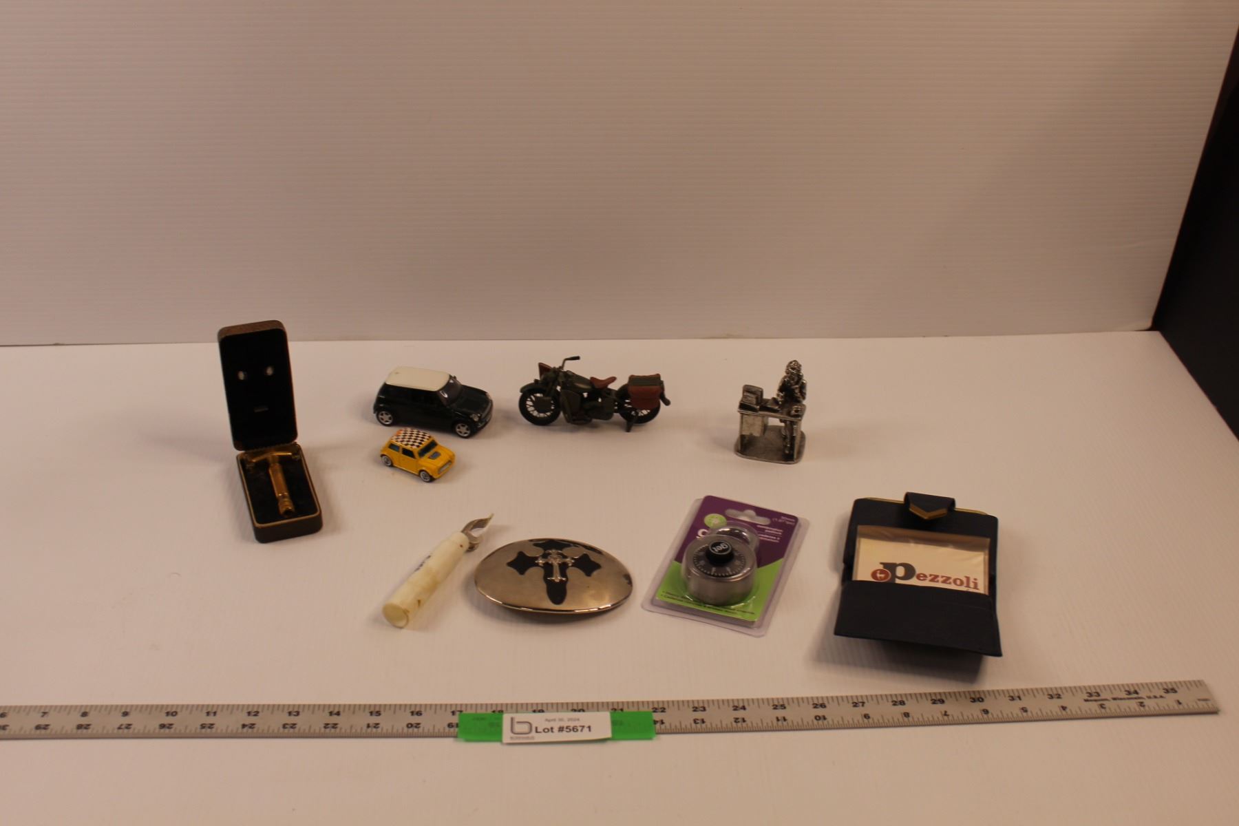 (2) Mini Cooper Die Cast Cars (2000 Hot Wheels 1:64 Scale w/Removable Body & Maisto 1:36 Scale), Maisto WWII Harley-Davidson , Pewter Desk Decor., New Pezzoli Ladies Wallet, Vintage Razor w/Case, Cross Belt Buckle, Paint Can Opener & New in Package Combo. Lock