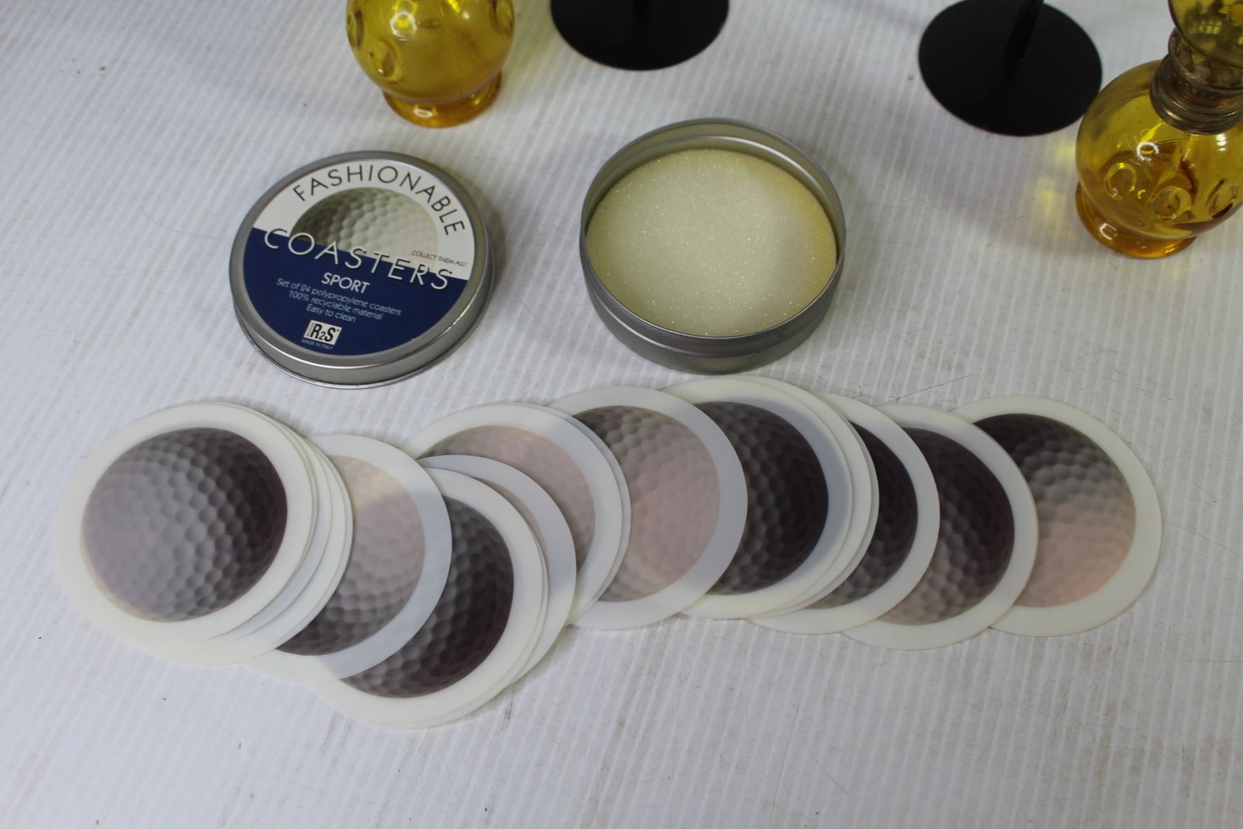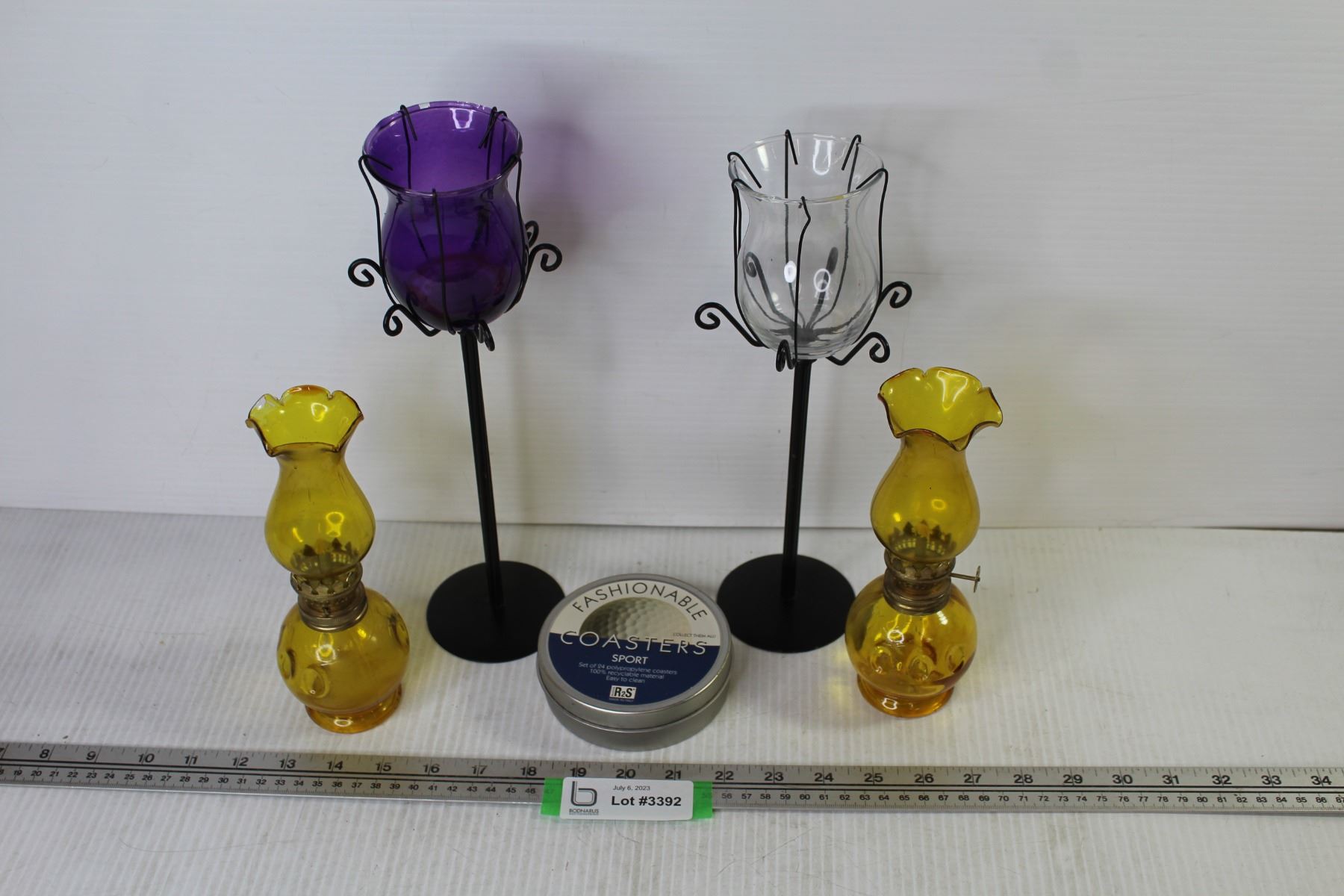 (2) Miniature Oil Lamps - (2) Candle Holders - Sports Tin Coasters