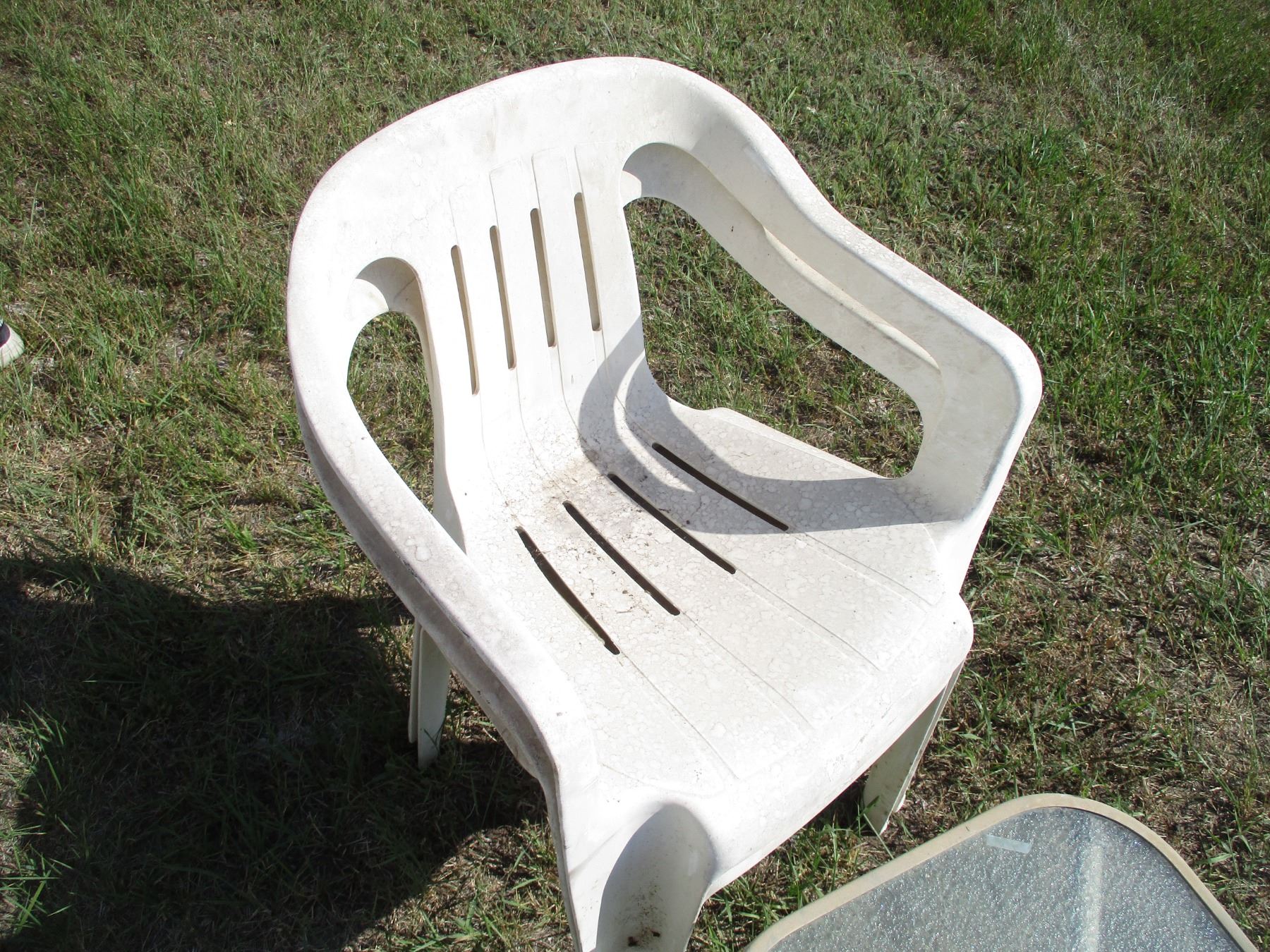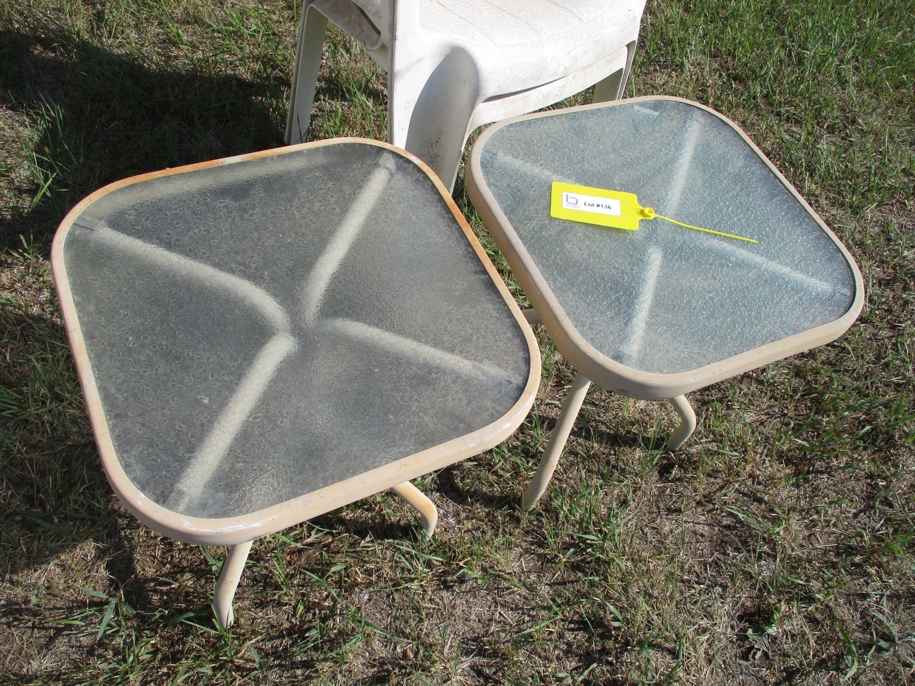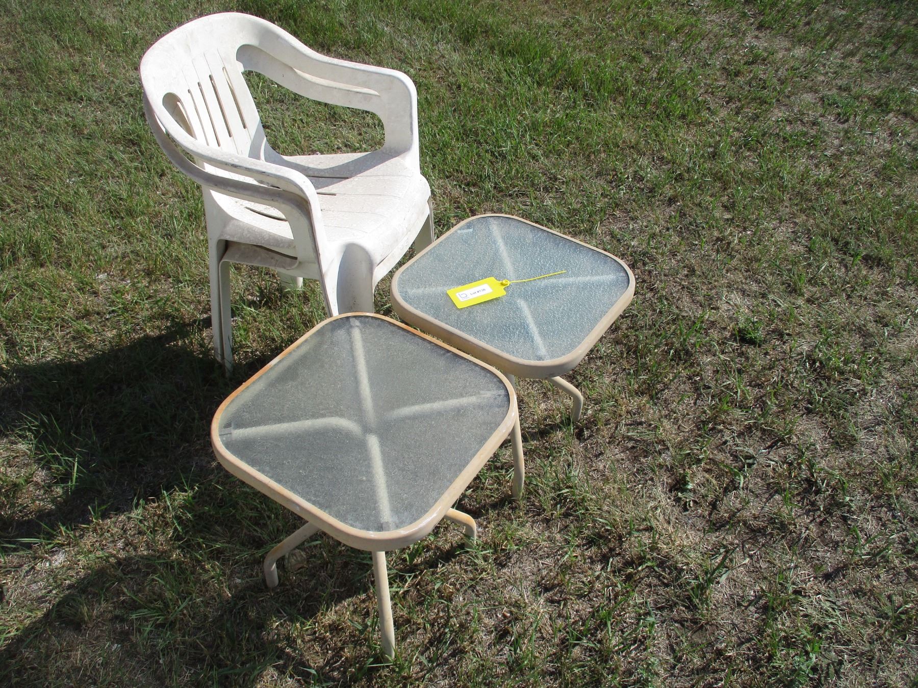 (2) Outdoor Glass Table (16x16"), (2) Plastic Lawn Chairs