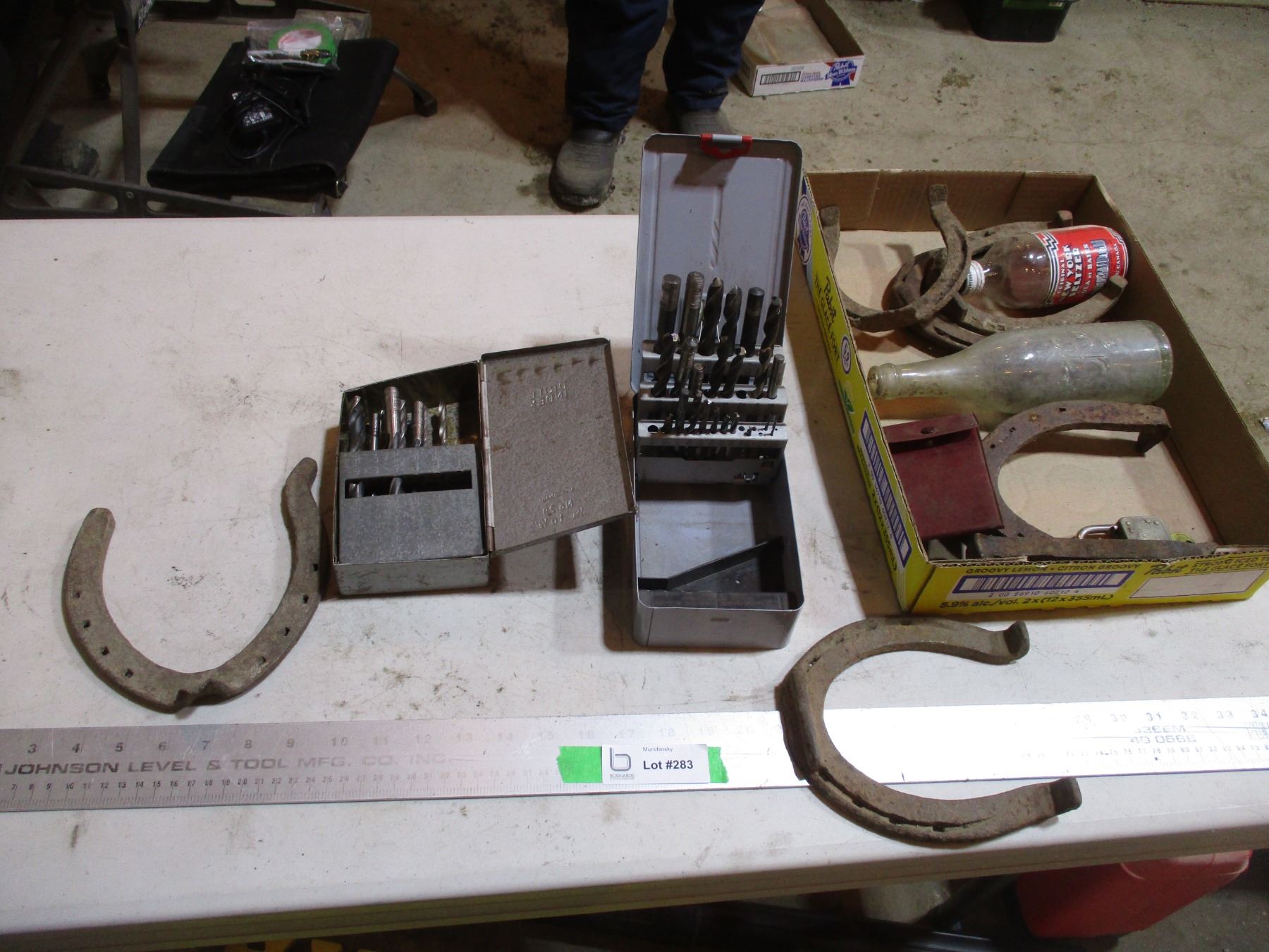 (2) Partial Drill Bit Sets, Horseshoes, Collectible Bottles, Miscellaneous