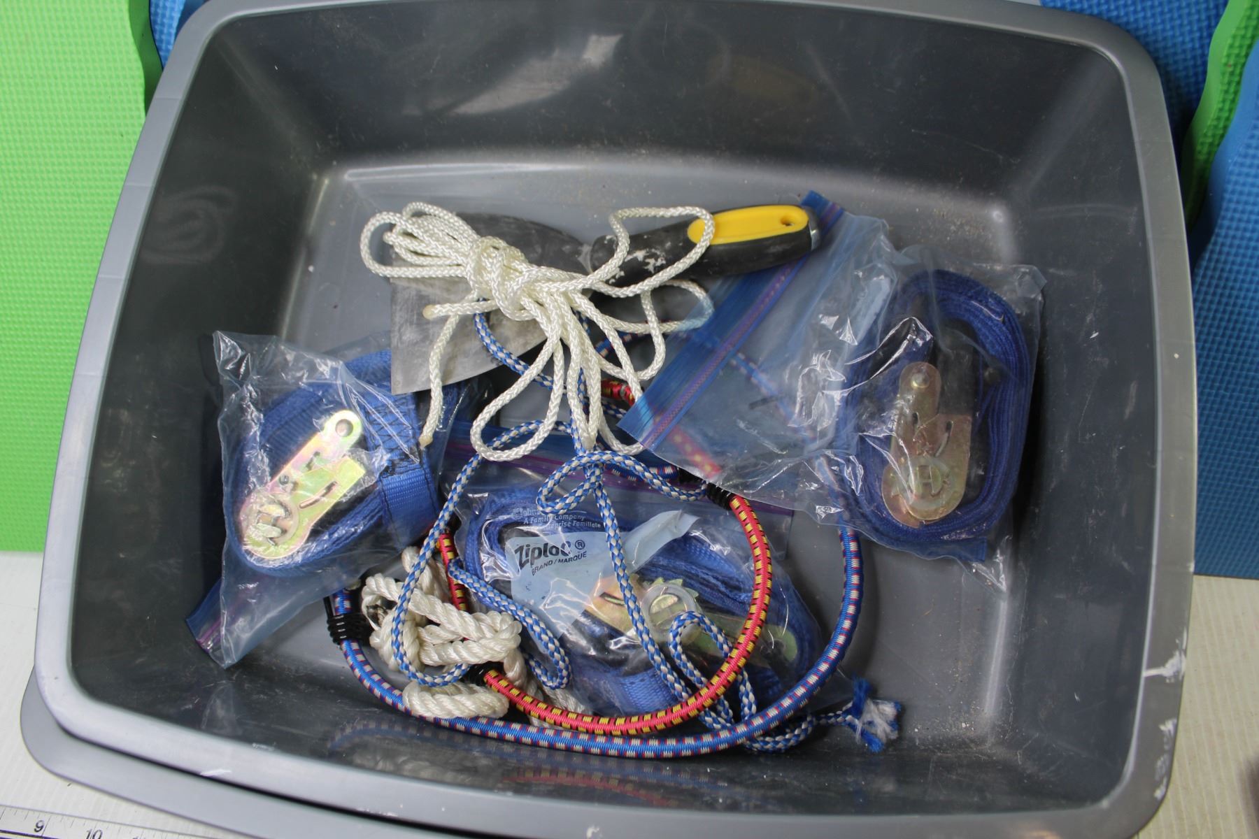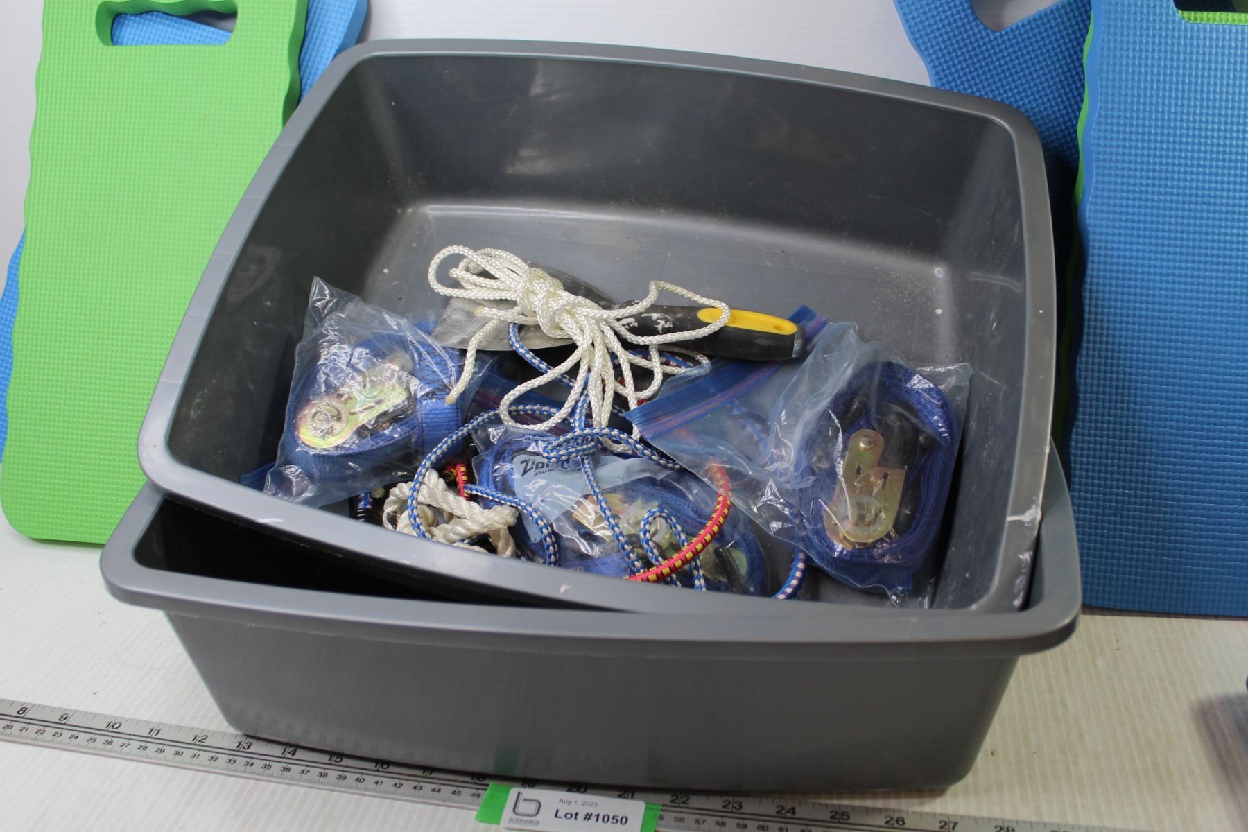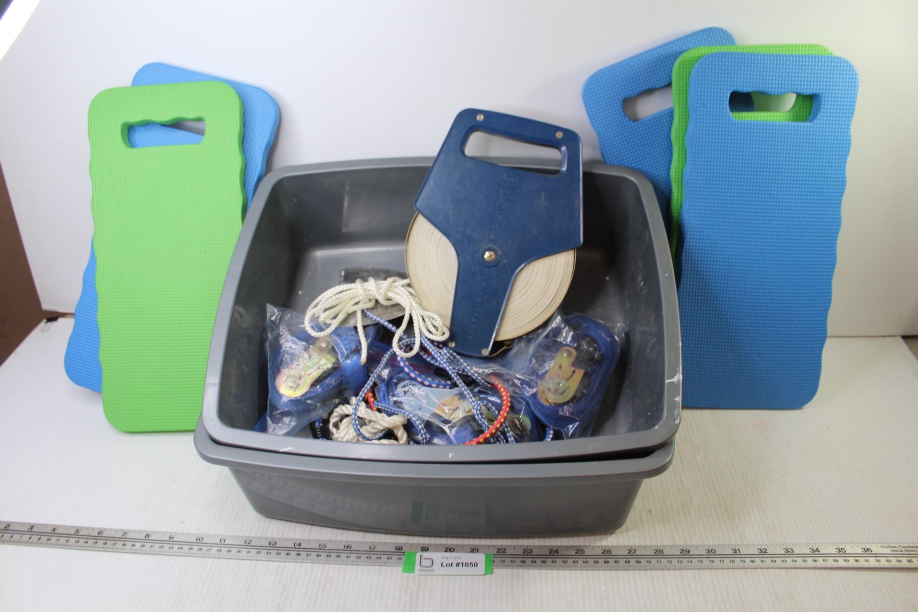 (2) Plastic Containers - Elson 50m Cloth Tape - (5) Knee Pads - Ratchet Straps