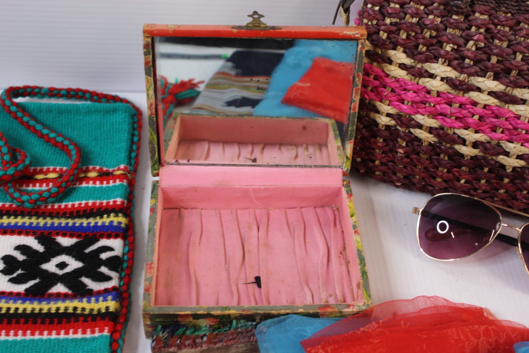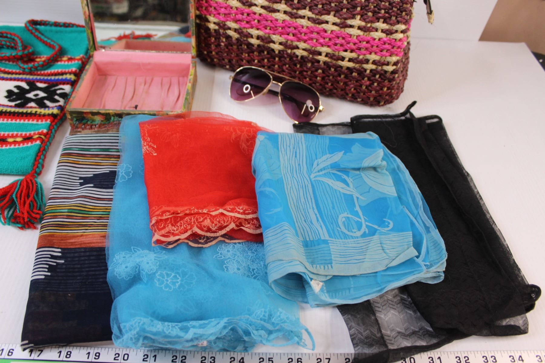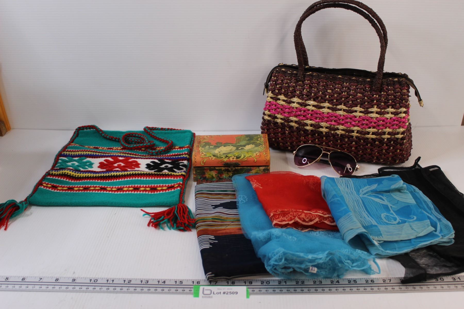 (2) Purses, Sunglasses, (5) Scarves, Swan Keepsake Box