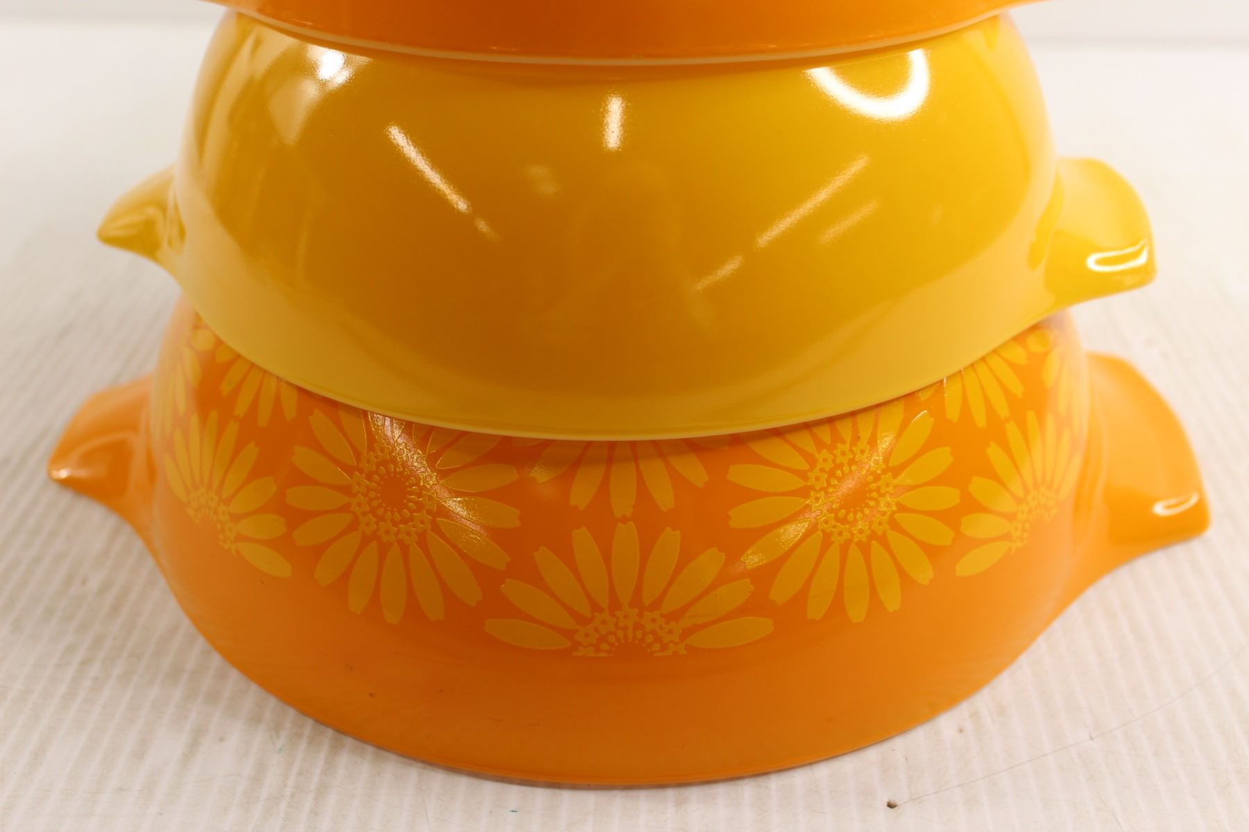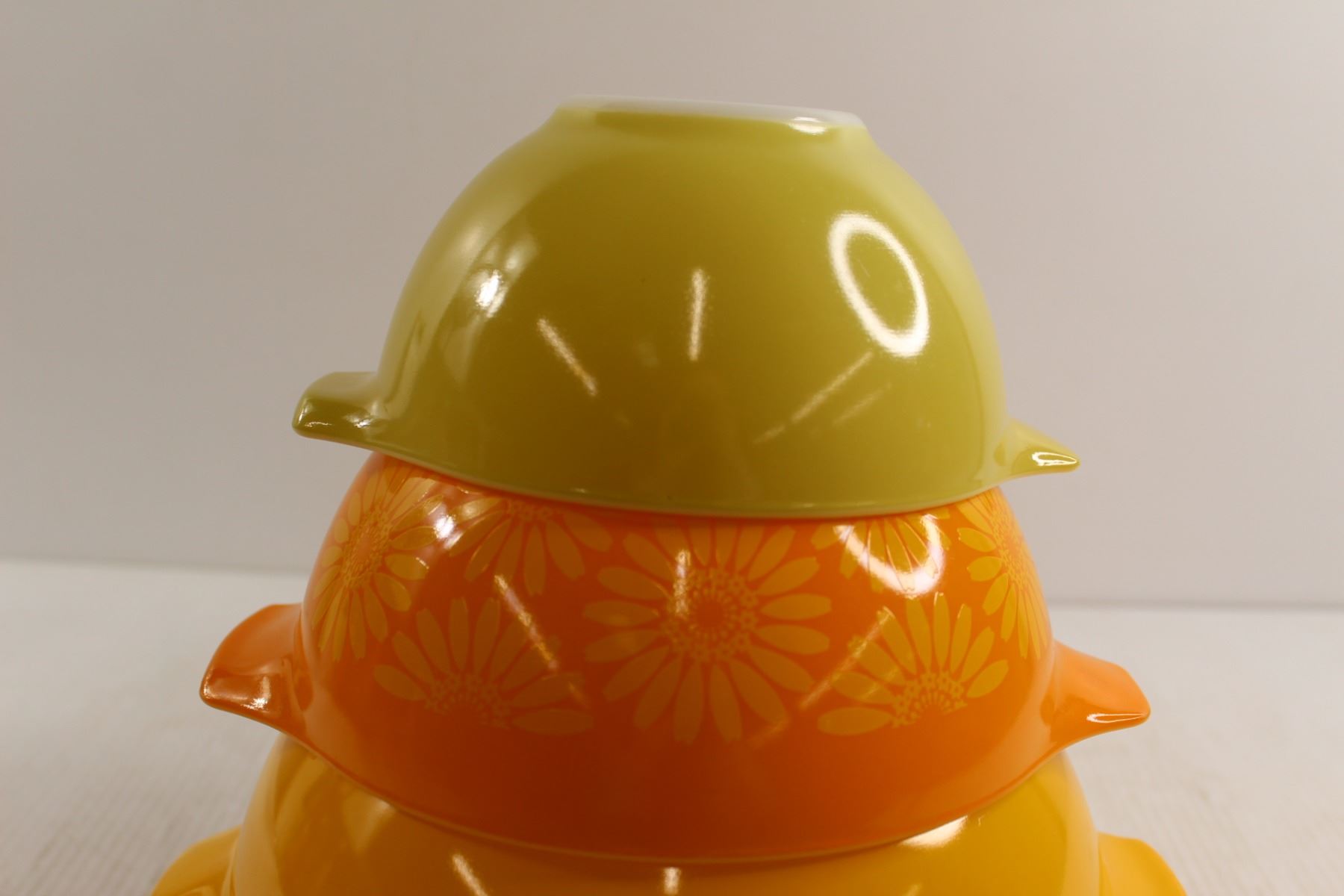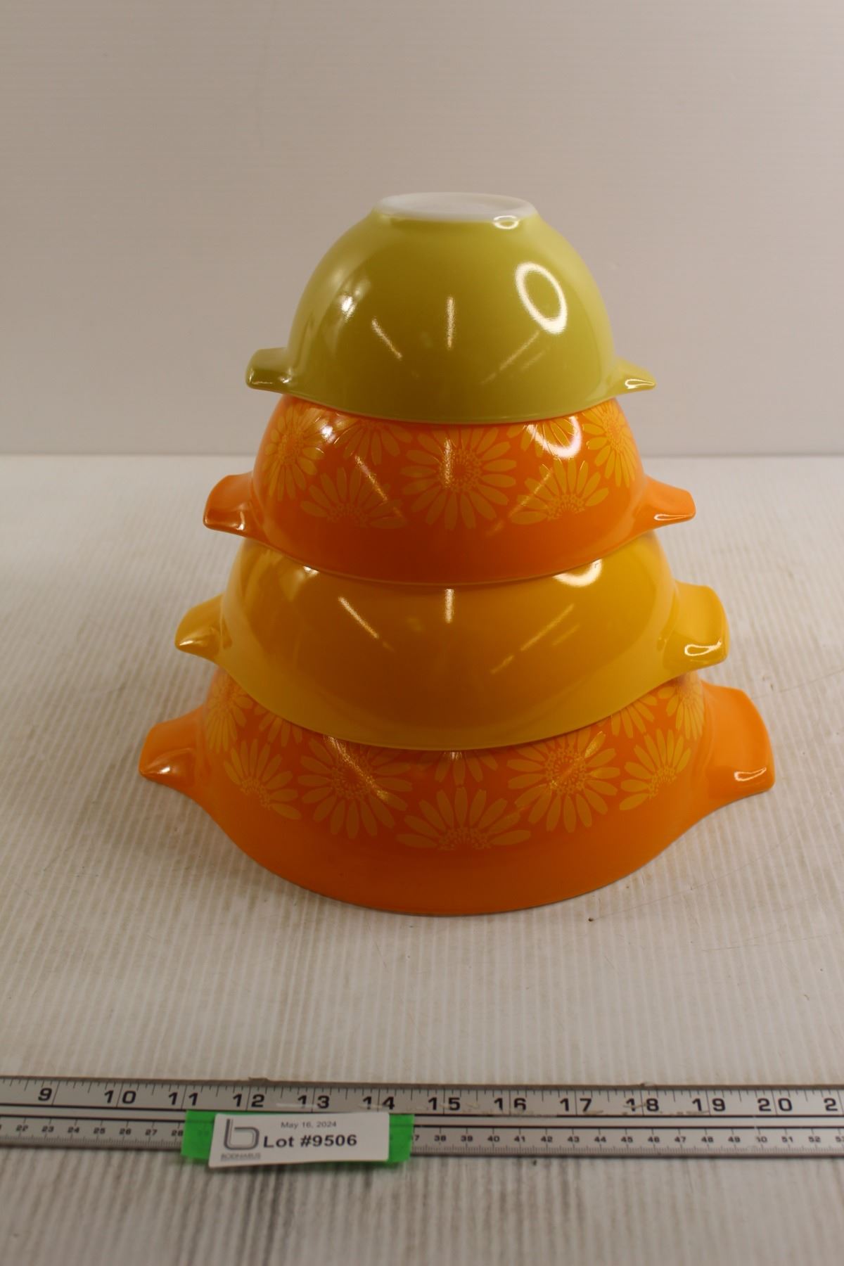 (2) Pyrex Sunflower Daisy Nesting Cinderella Mixing Bowls, (2) Yellow/Orange Pyrex Bowls