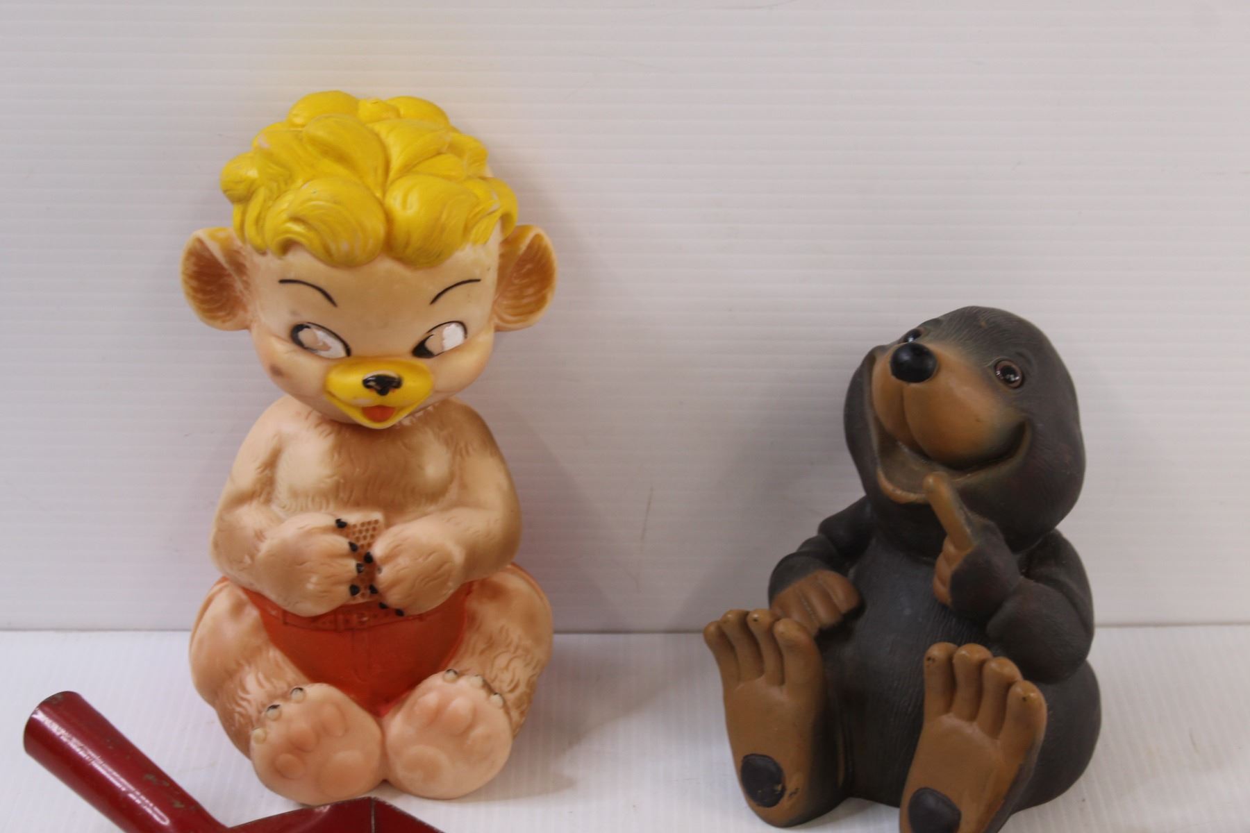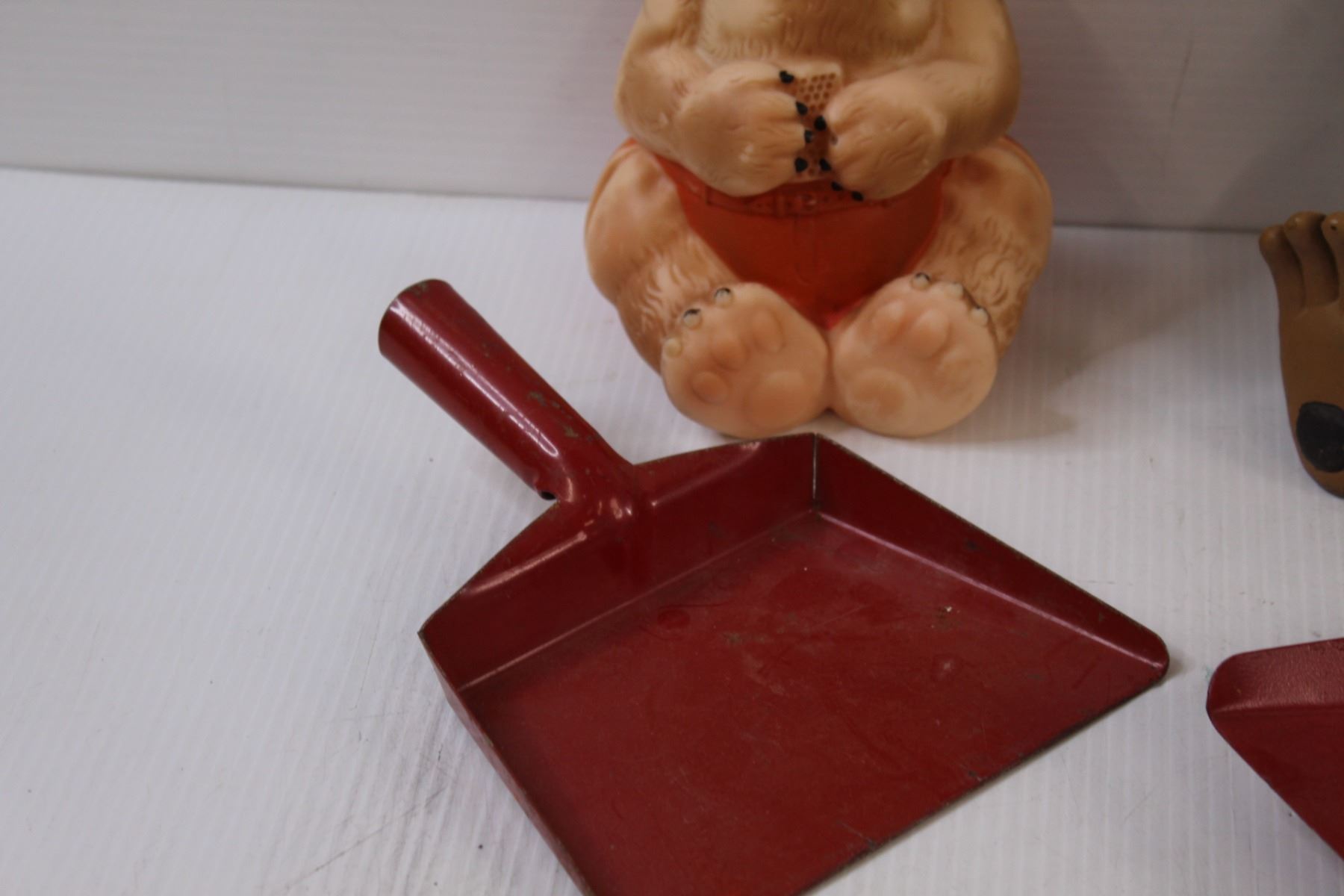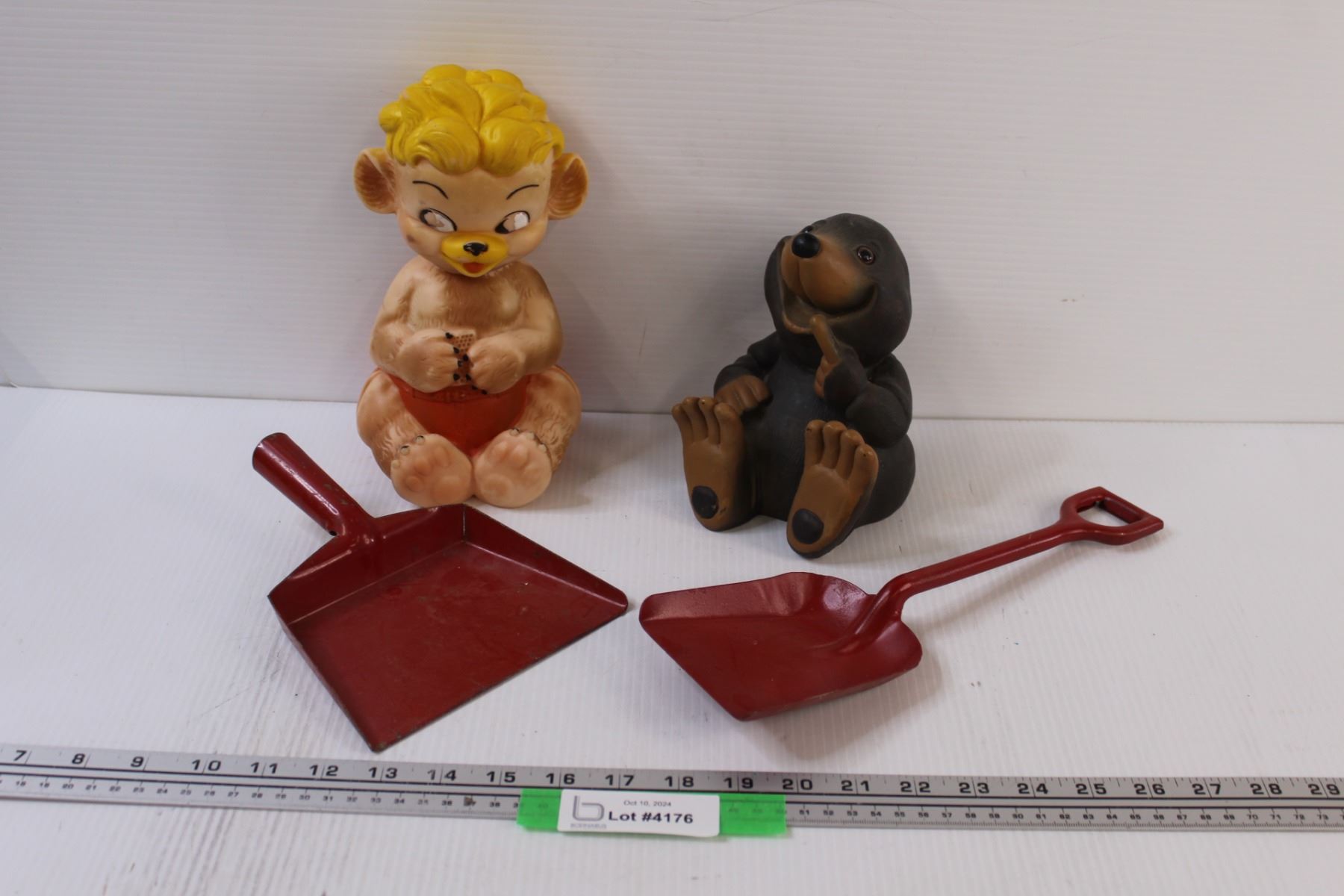 (2) Retro Children's Toys: Squeak Toys & (2) Metal Dust Pan/Shovels