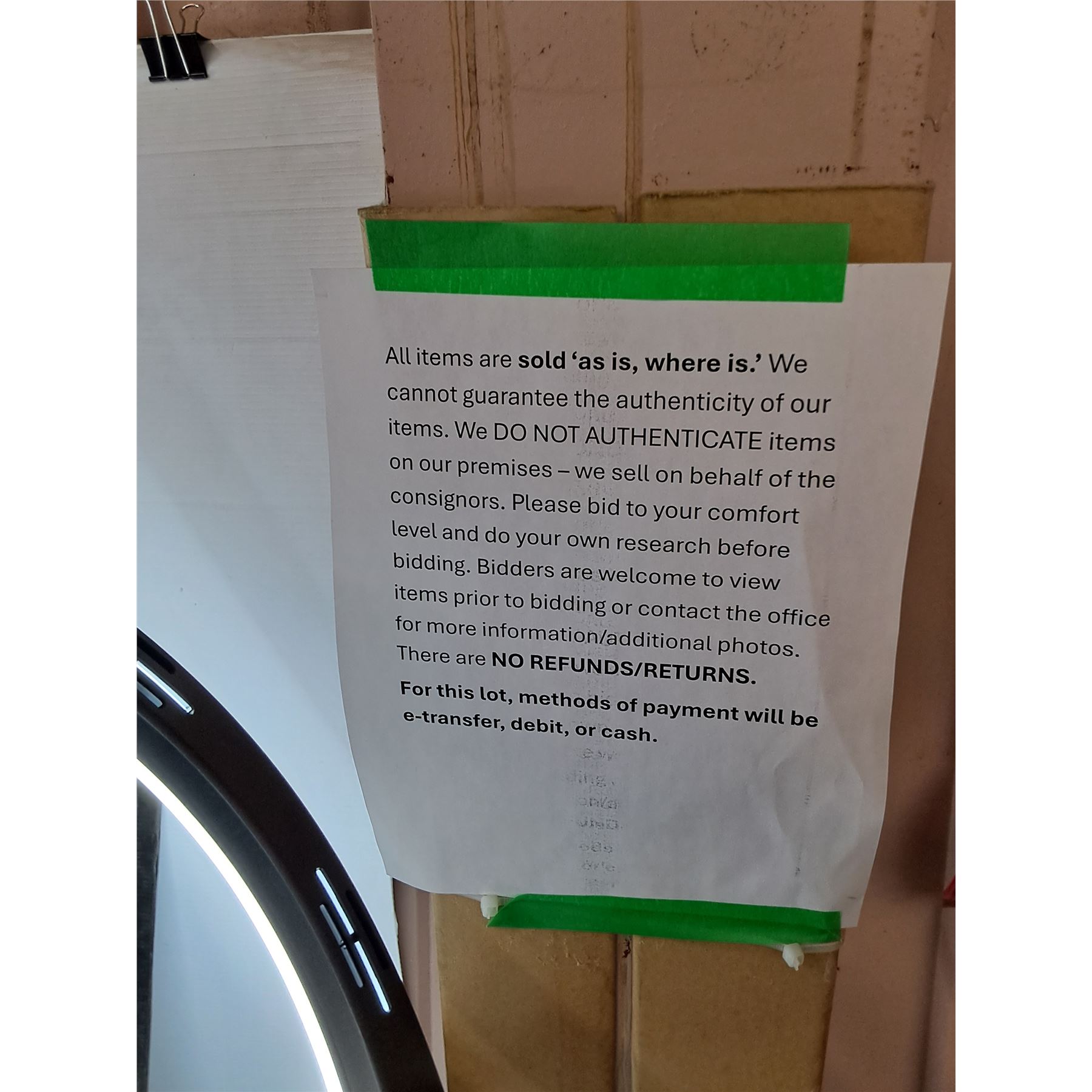 Payment Methods – Credit Card (Visa, Mastercard), Debit, Cash, Certified Cheque, Bank Draft, Approved Personal Or Company Cheque. Bodnarus Auctioneering holds the right to hold purchases until payment is cleared if prior arrangements haven't been made. Purchases become the sole responsibility of the purchaser immediately after bidding ceases.