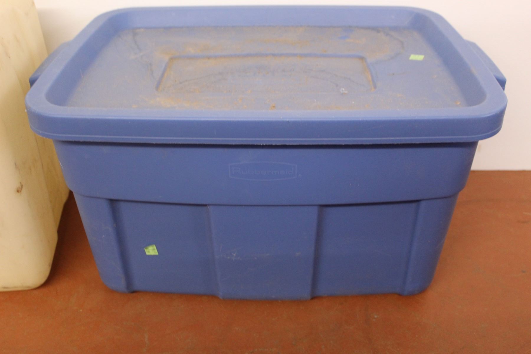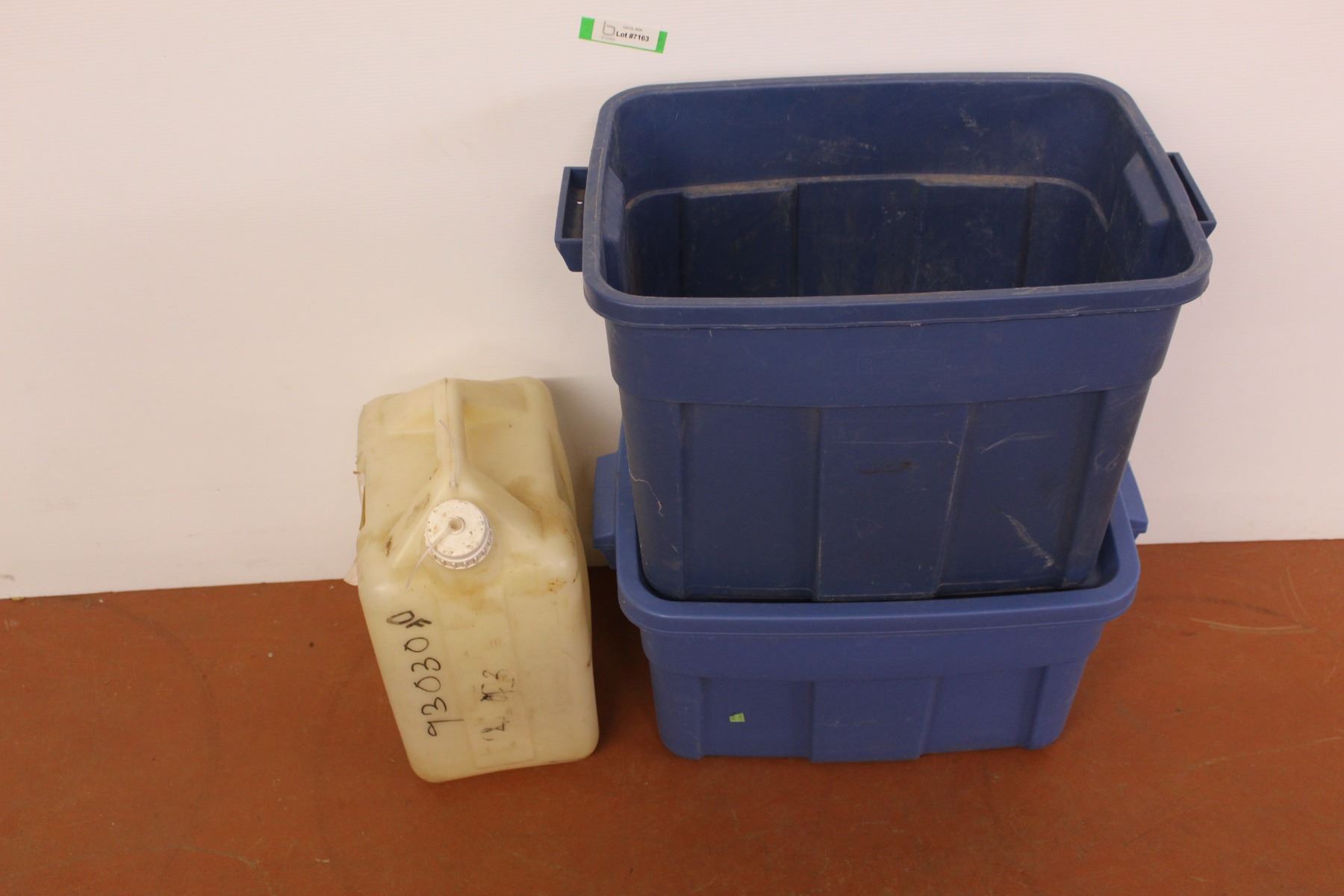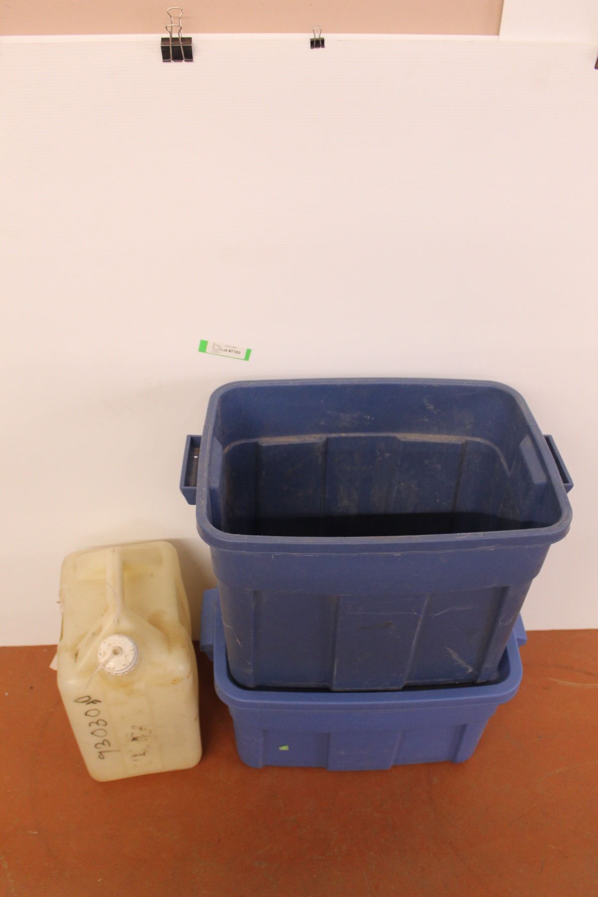 *(2) Rubbermaid Tubs (1) Missing Lid, Large Water Jug