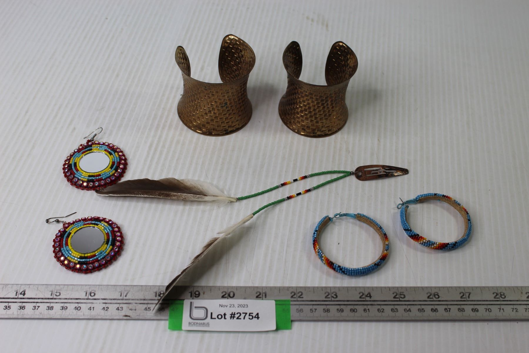 (2) Sets Beaded Earrings - Metal Cuff Bracelets - Feather & Beaded Hair Clip