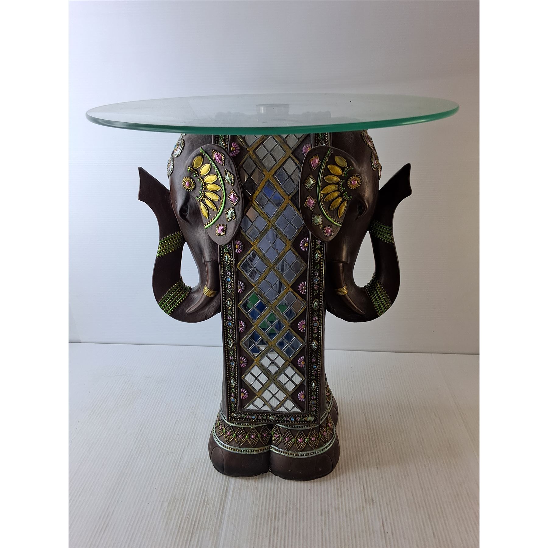 *2 Sided Metal Elephant Table with Glass Top 23  Tall 18.75  Wide