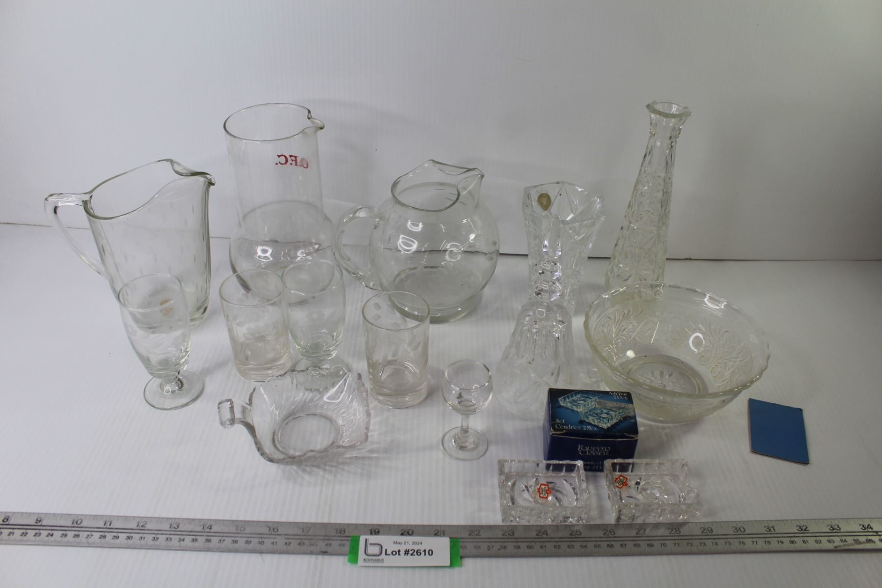 (2) Small Crystal Ashtrays - Glass Pitchers - Glass Vases - Glasses - Crystal Bell