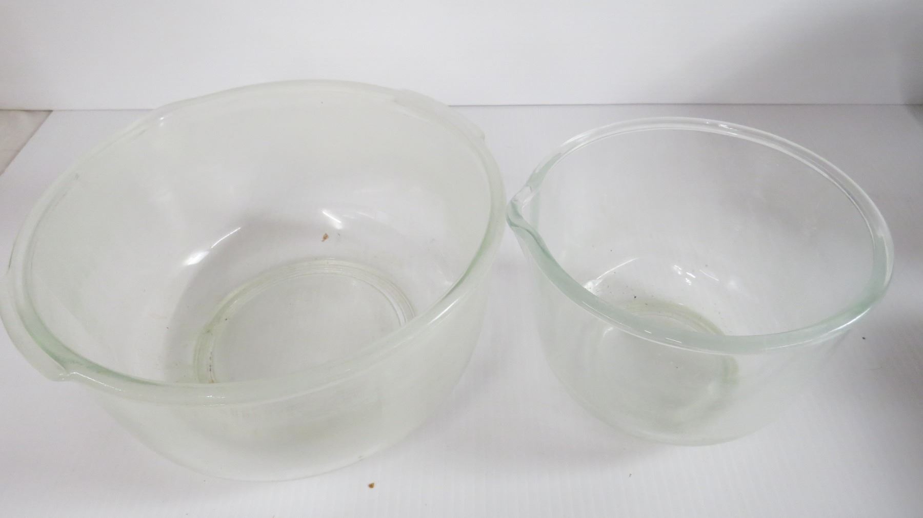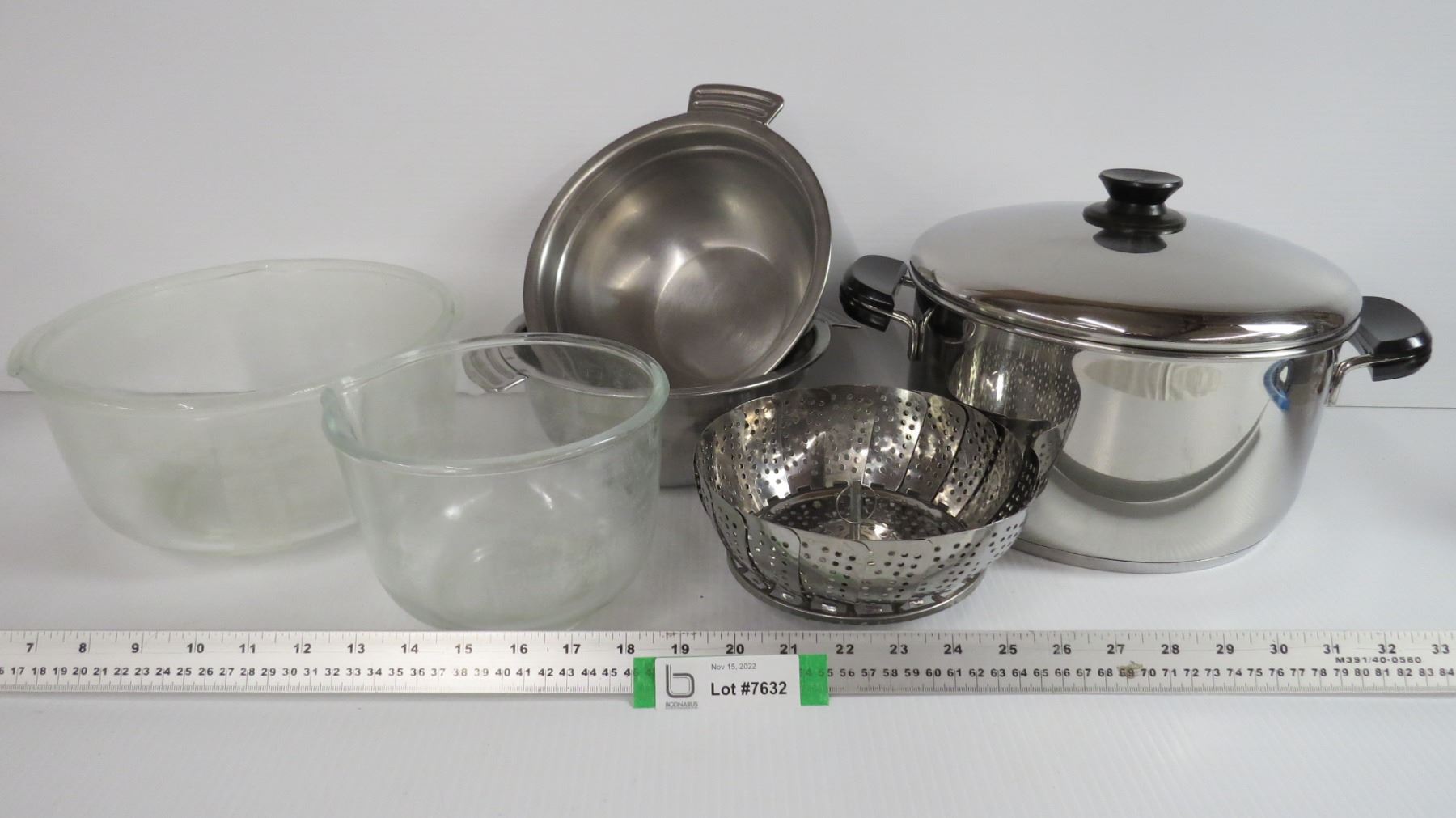(2) Sunbeam Glasbake Bowls (worn) - Large Pot & Lid - Strainer - (2) Pans
