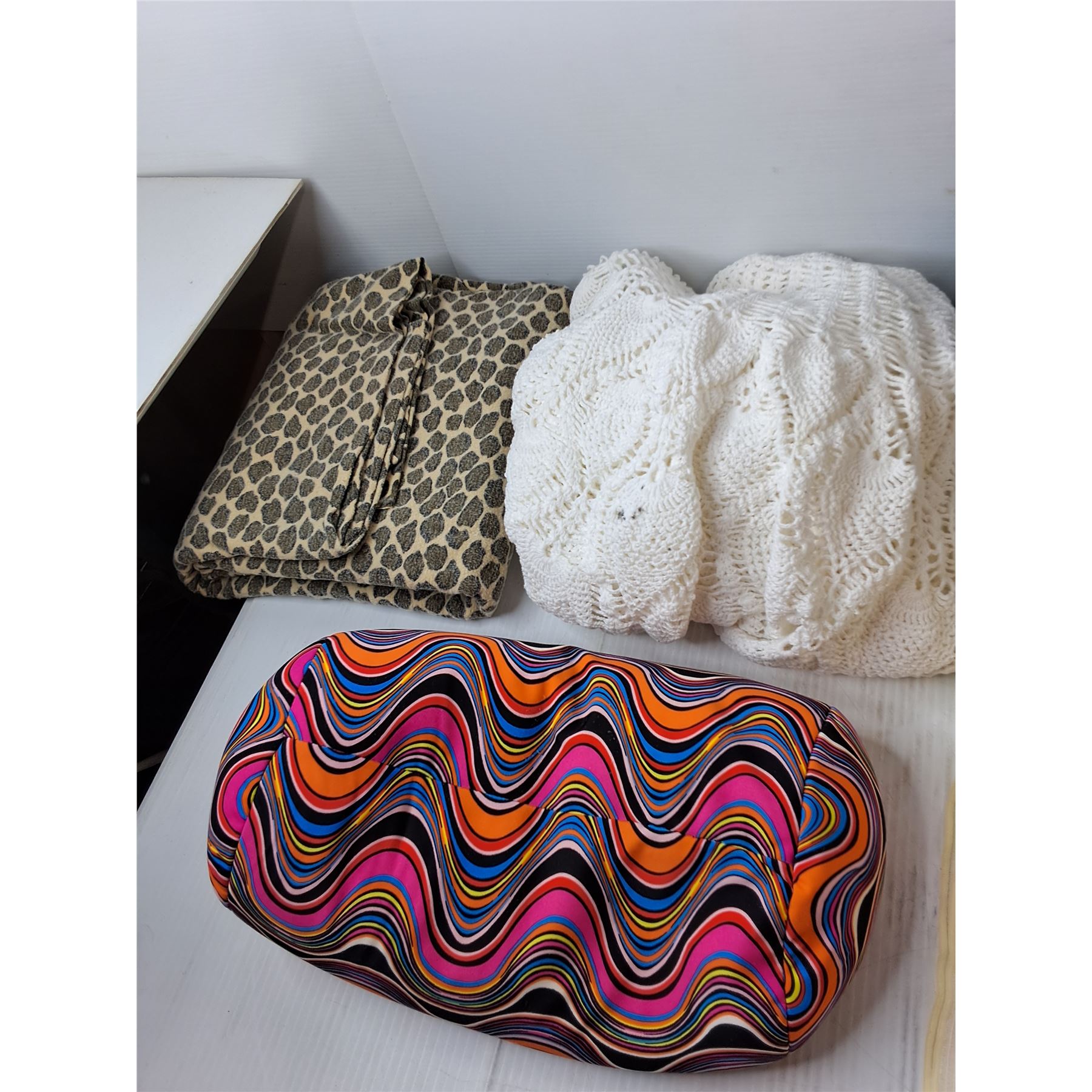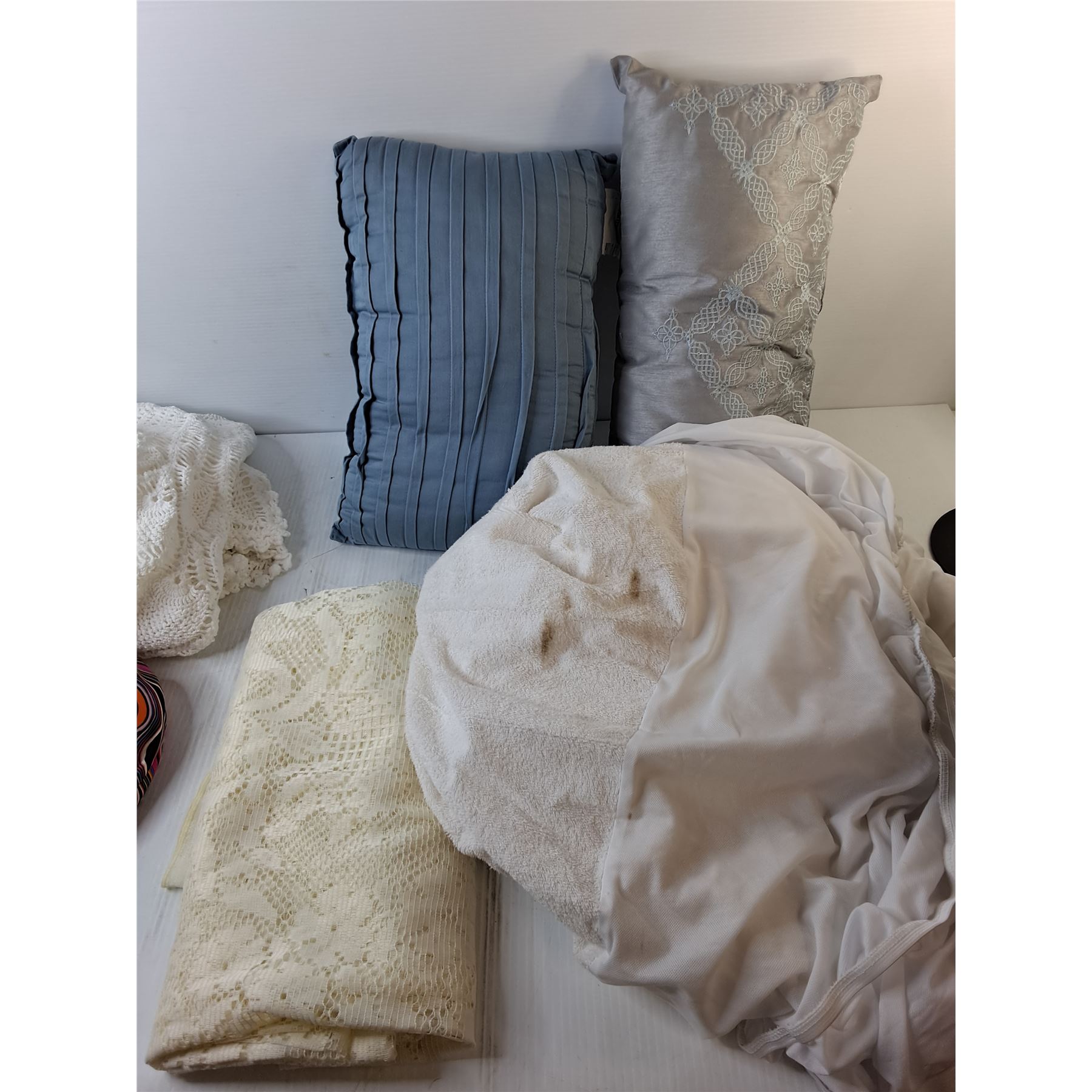 (2) Throw Pillows, Mattress Protector Approx. Twin, Doily Table Cover. Some Staining