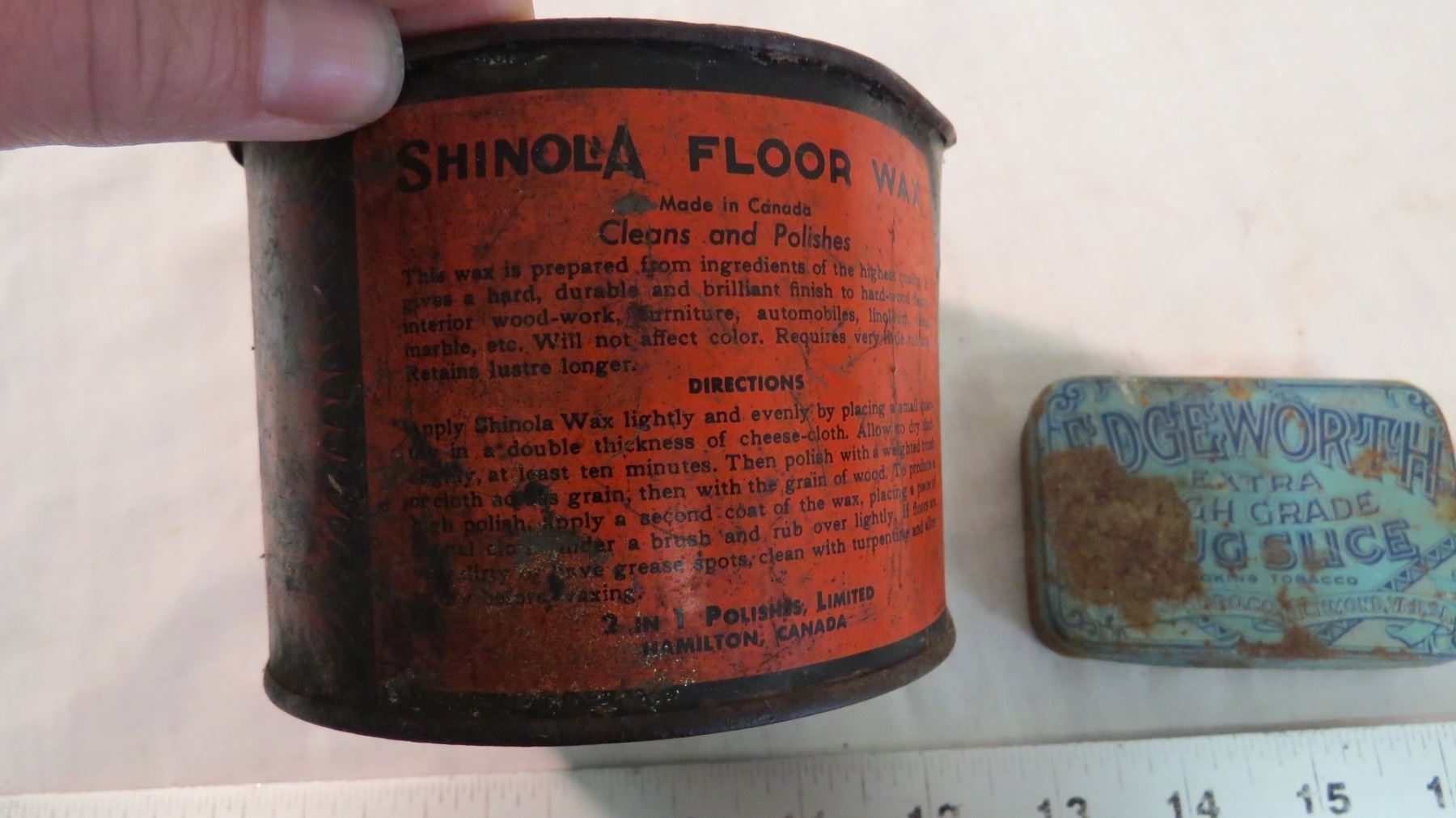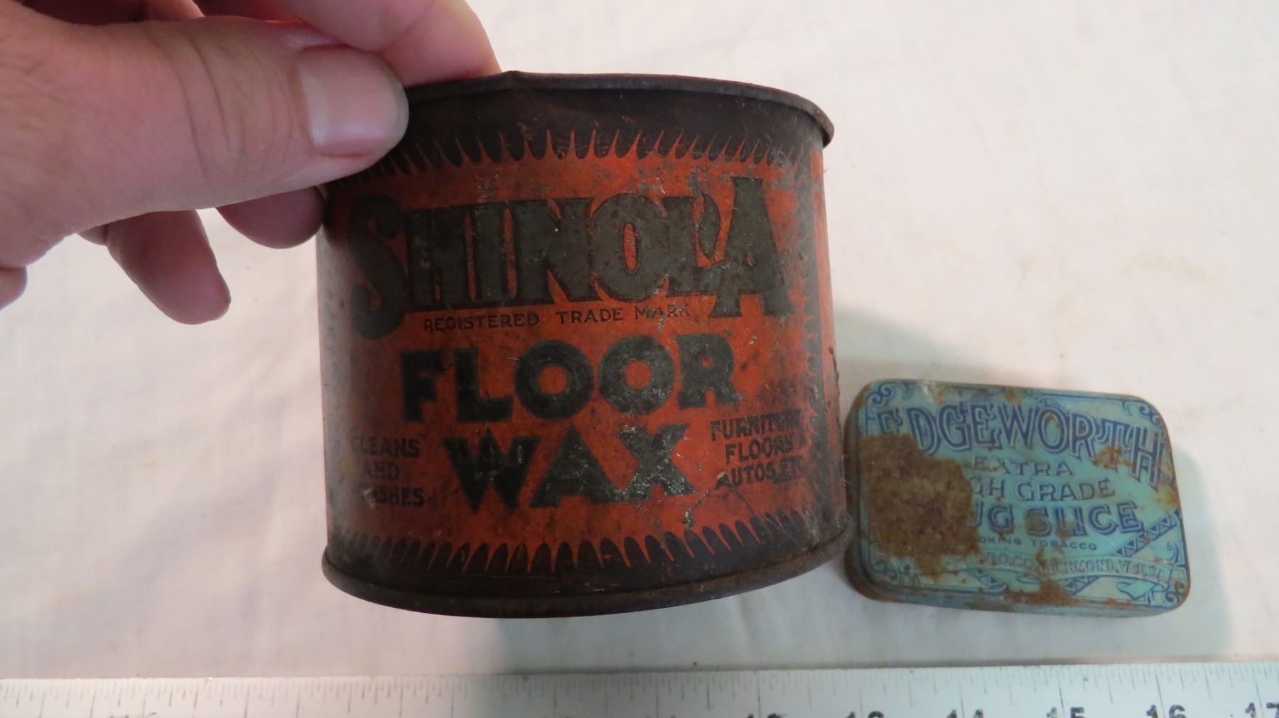(2) Tins Shinola Floor wax, Edgeworth tin