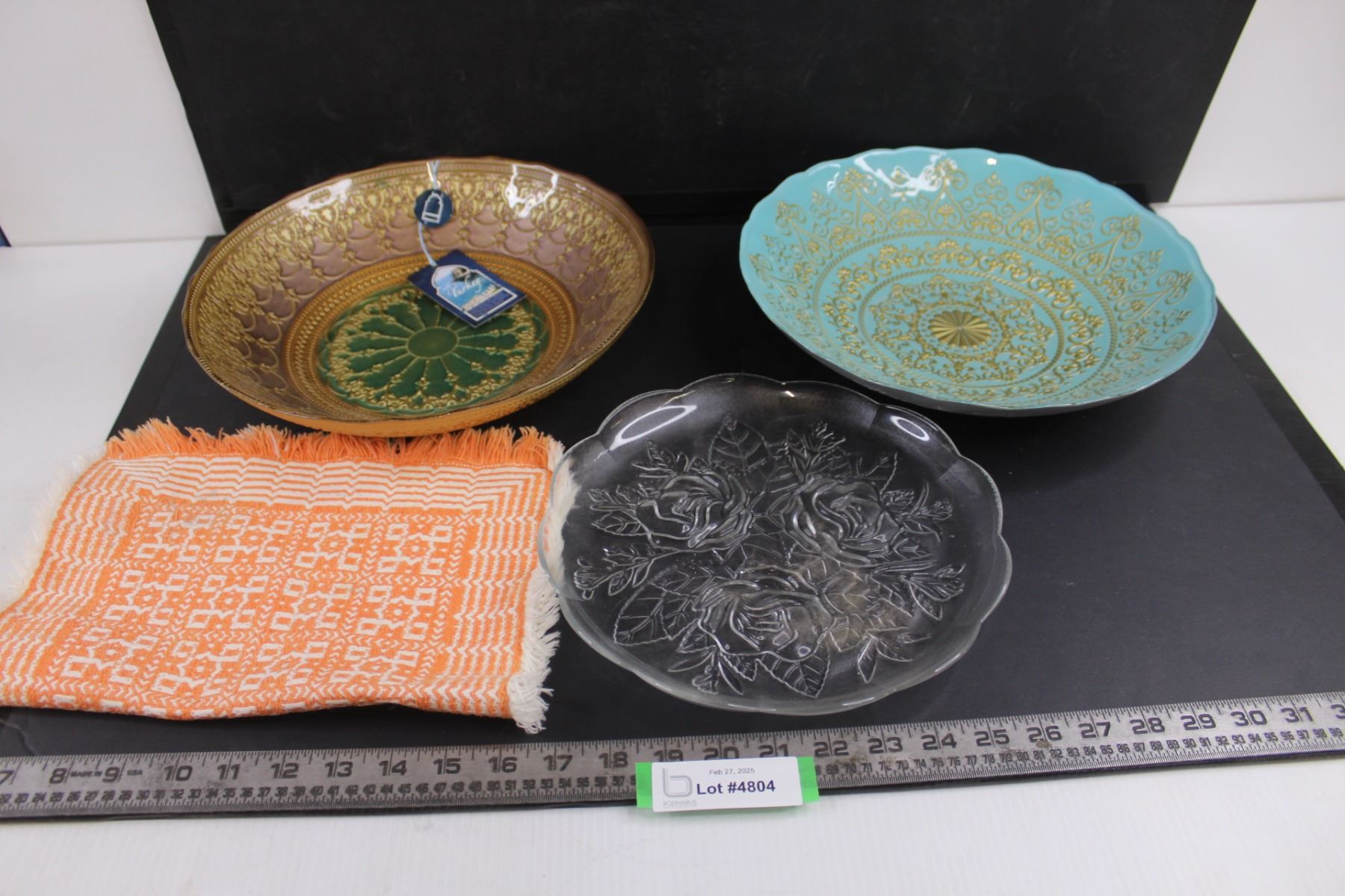 (2) Turkish Presentation Dishes 12" Dia, Rose Moulded Glass Plate 9.5" Dia, Indian Cotton Placemat 15" x 12"