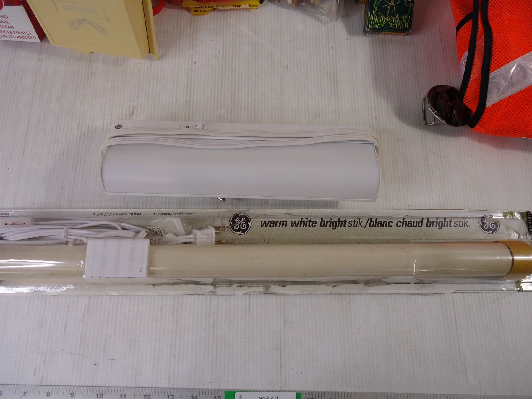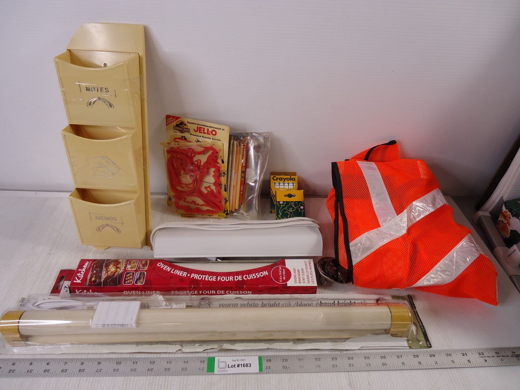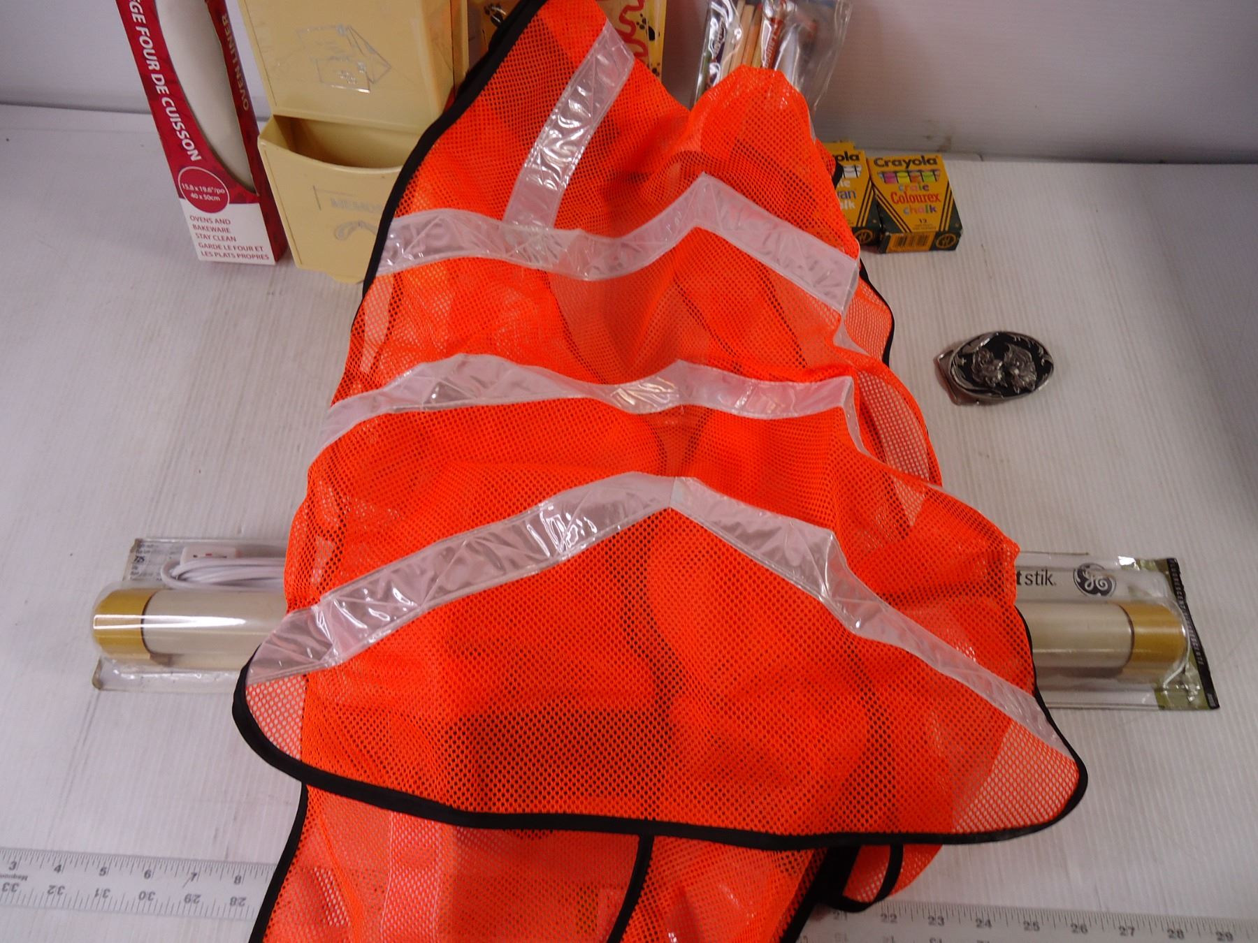 (2) Under cabinet lights, kitchen items, crayons, safety vest and oven liners