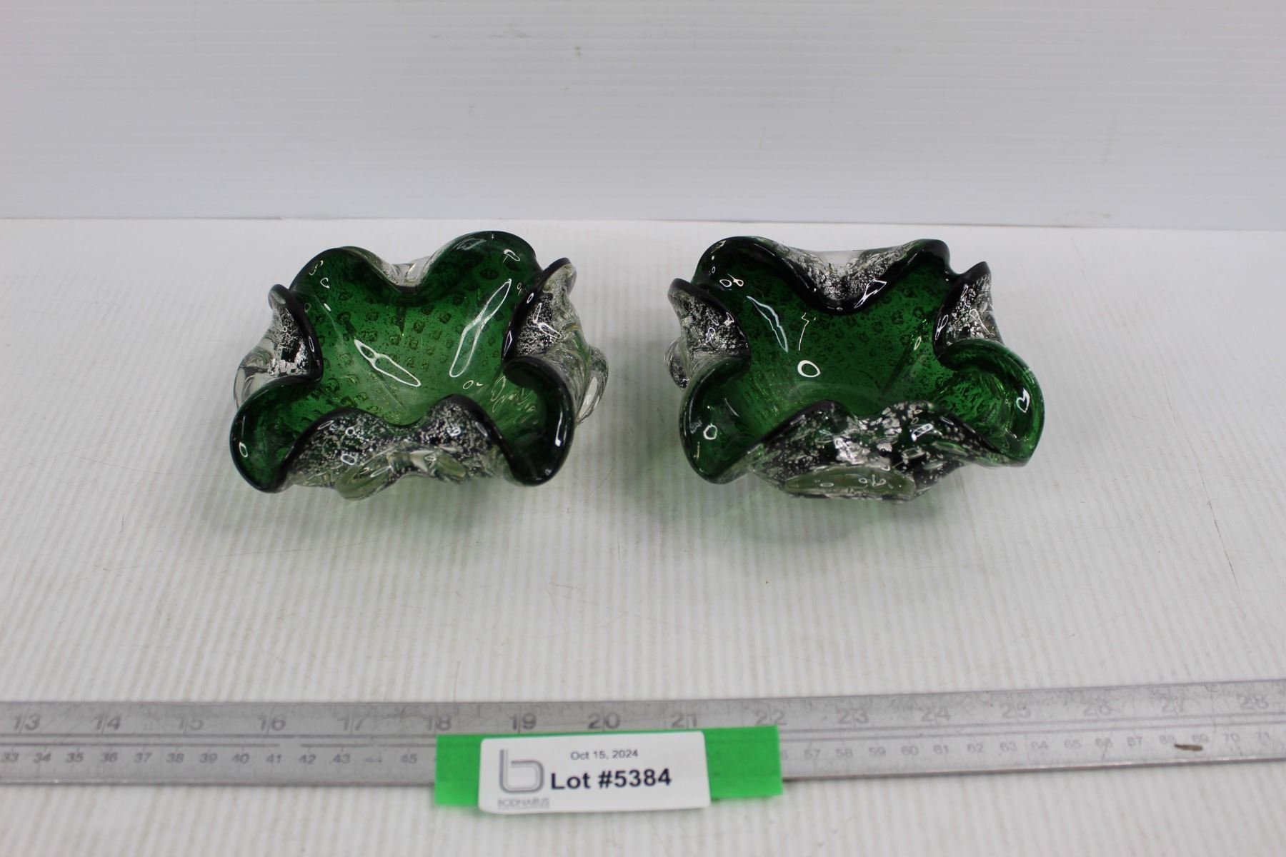 (2) Vintage Art Glass Style Ashtrays Murano Green w/ Silver and Gold Aventurine