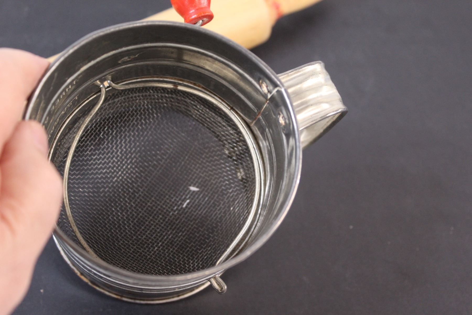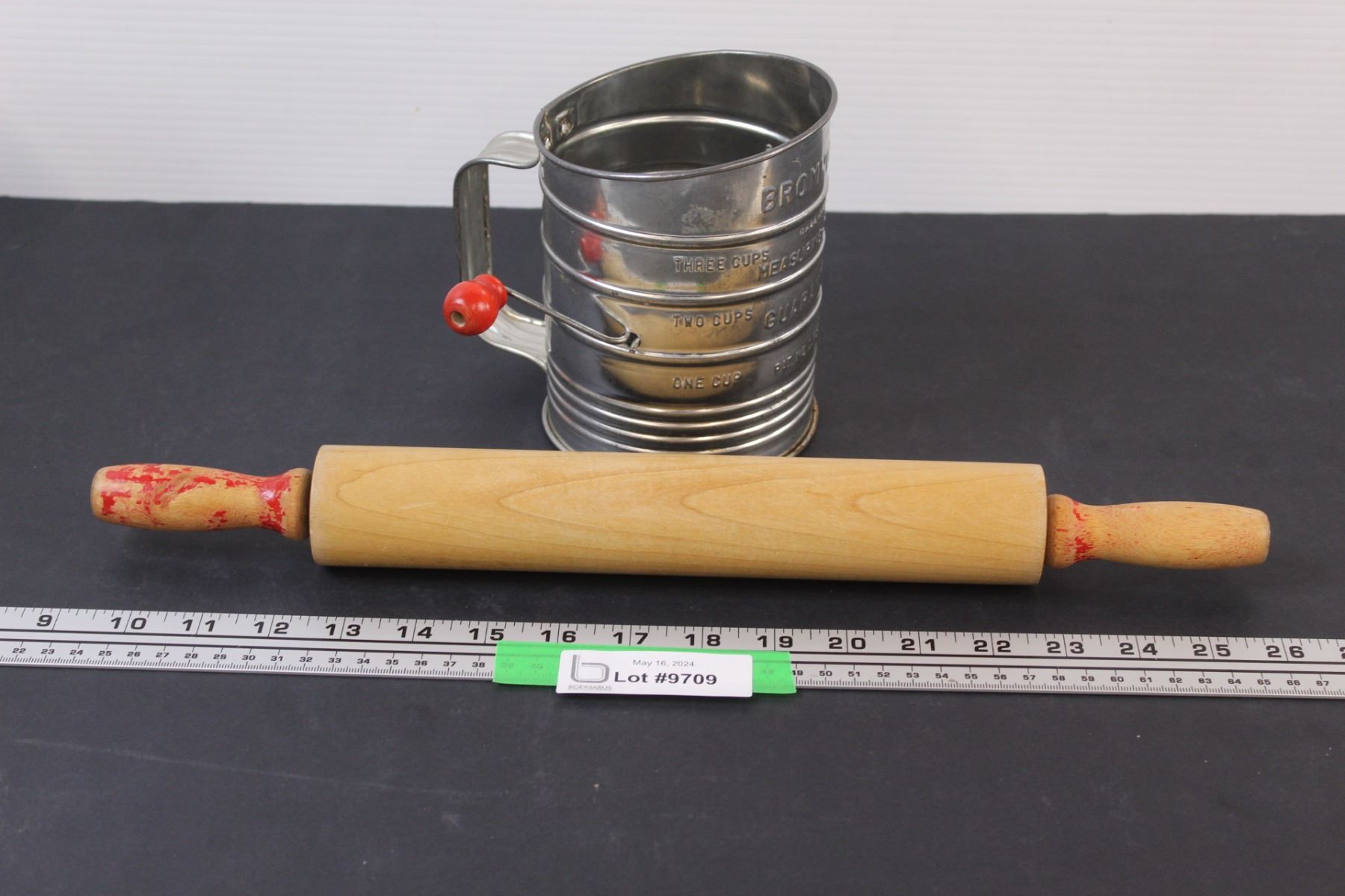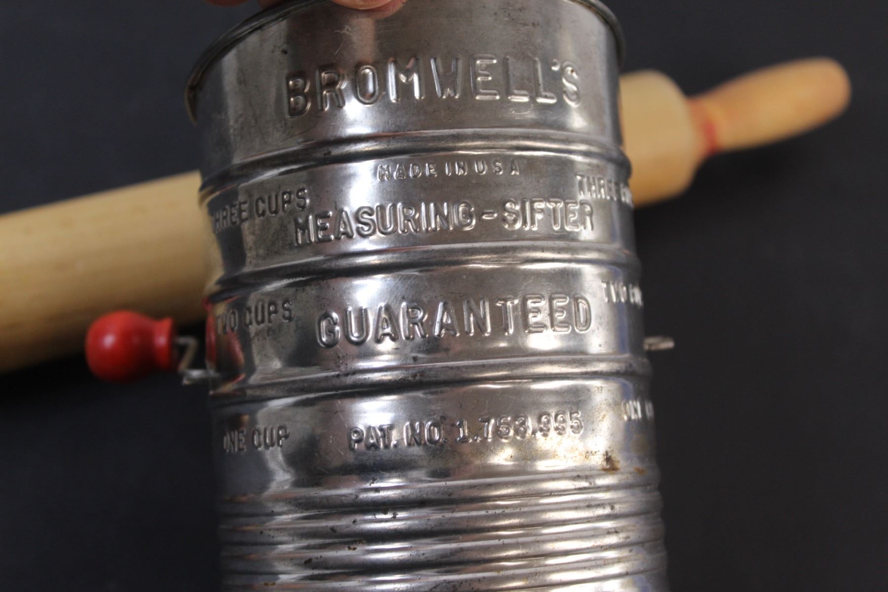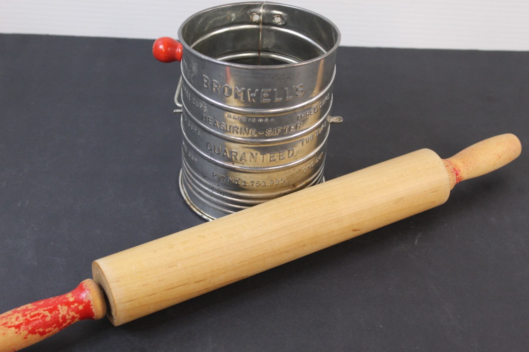 (2) Vintage Bromwell's Measuring Cup Flour Sifter & Vintage Wooden Rolling Pin