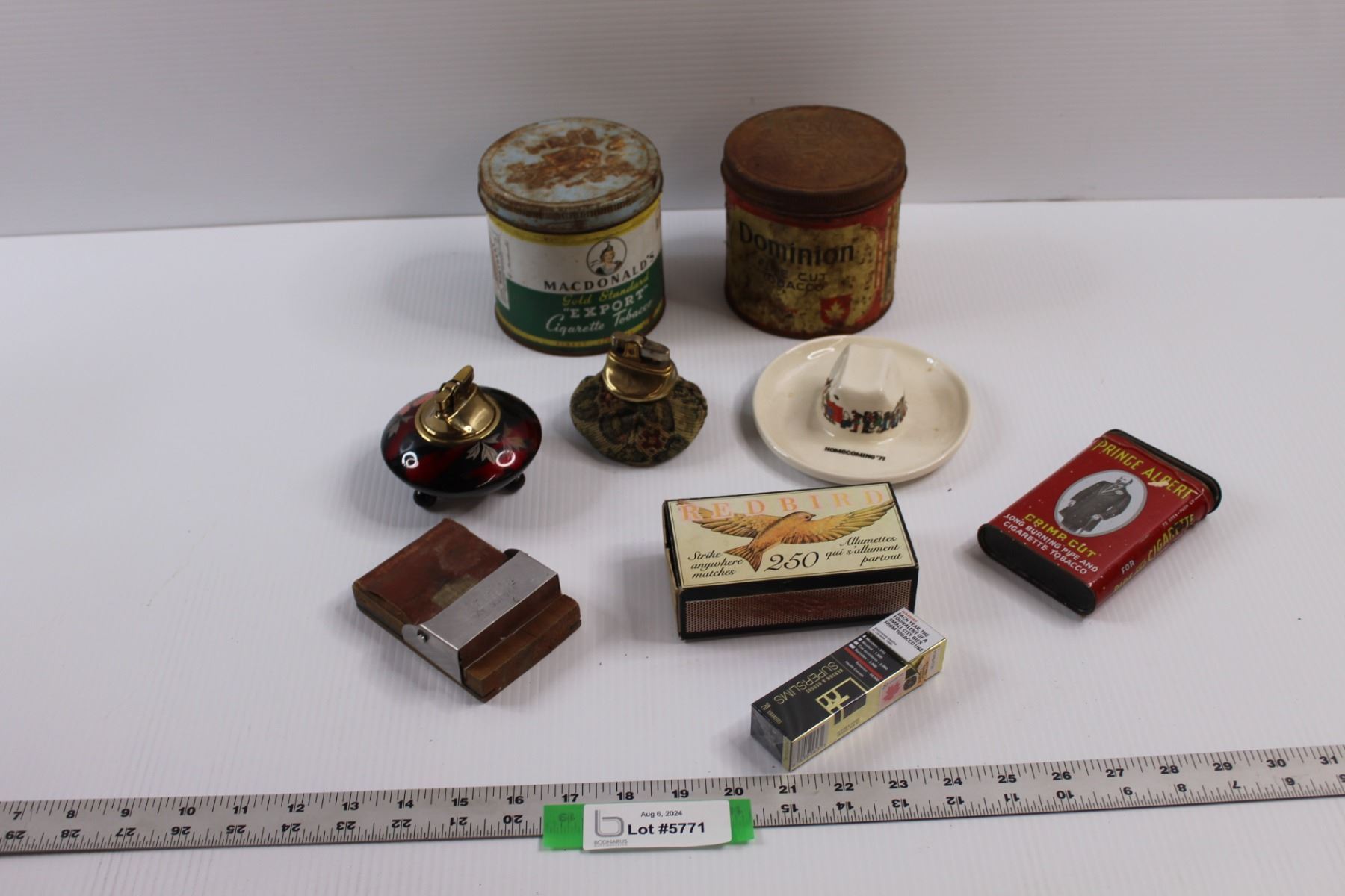 (2) Vintage Desk Lighters, (2) Vintage Tobacco Tins, Vintage Cigarette Roller, Prince Albert Tobacco
