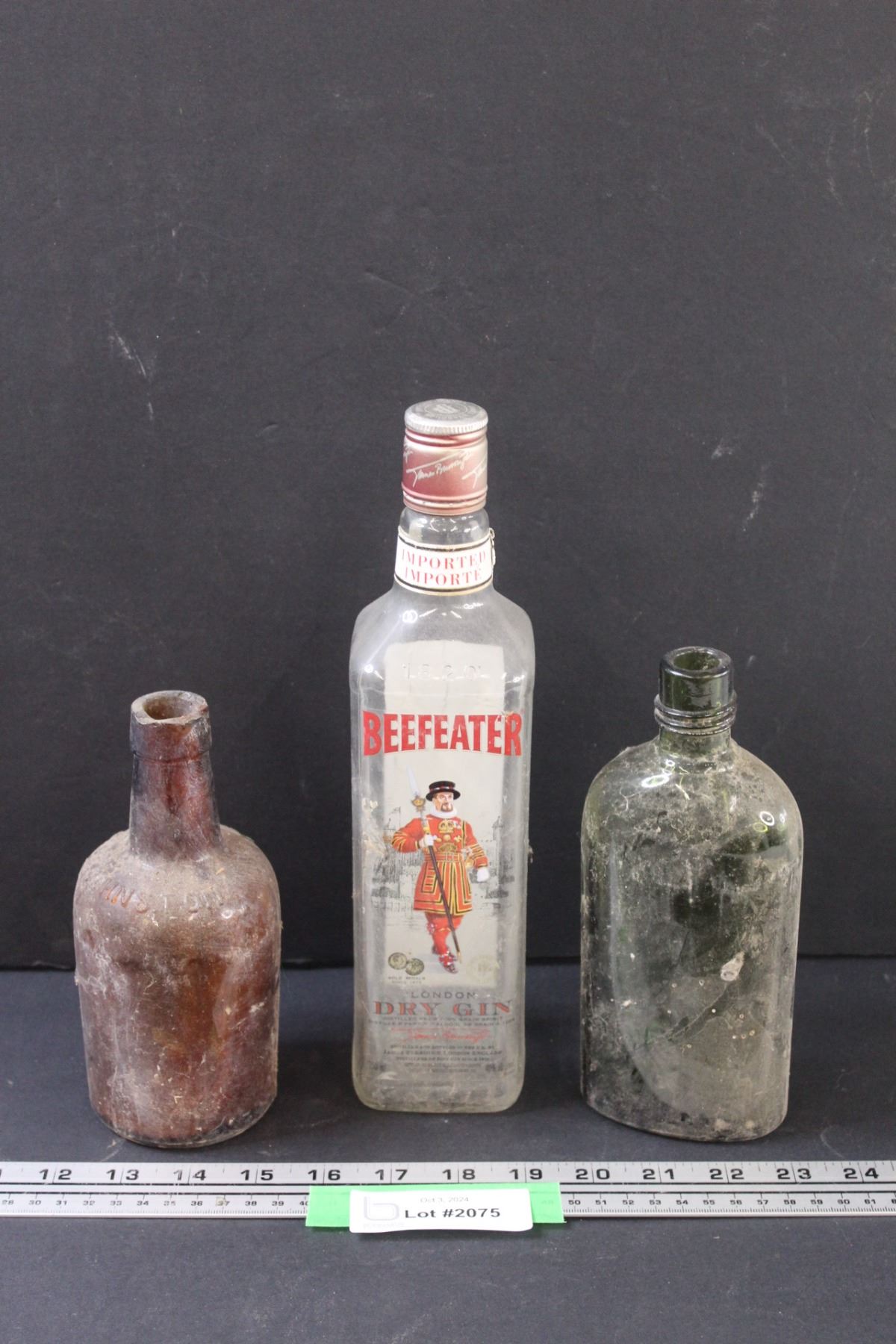 (2) Vintage Glass Bottles (Green & Brown) & Beefeater Gin Bottle
