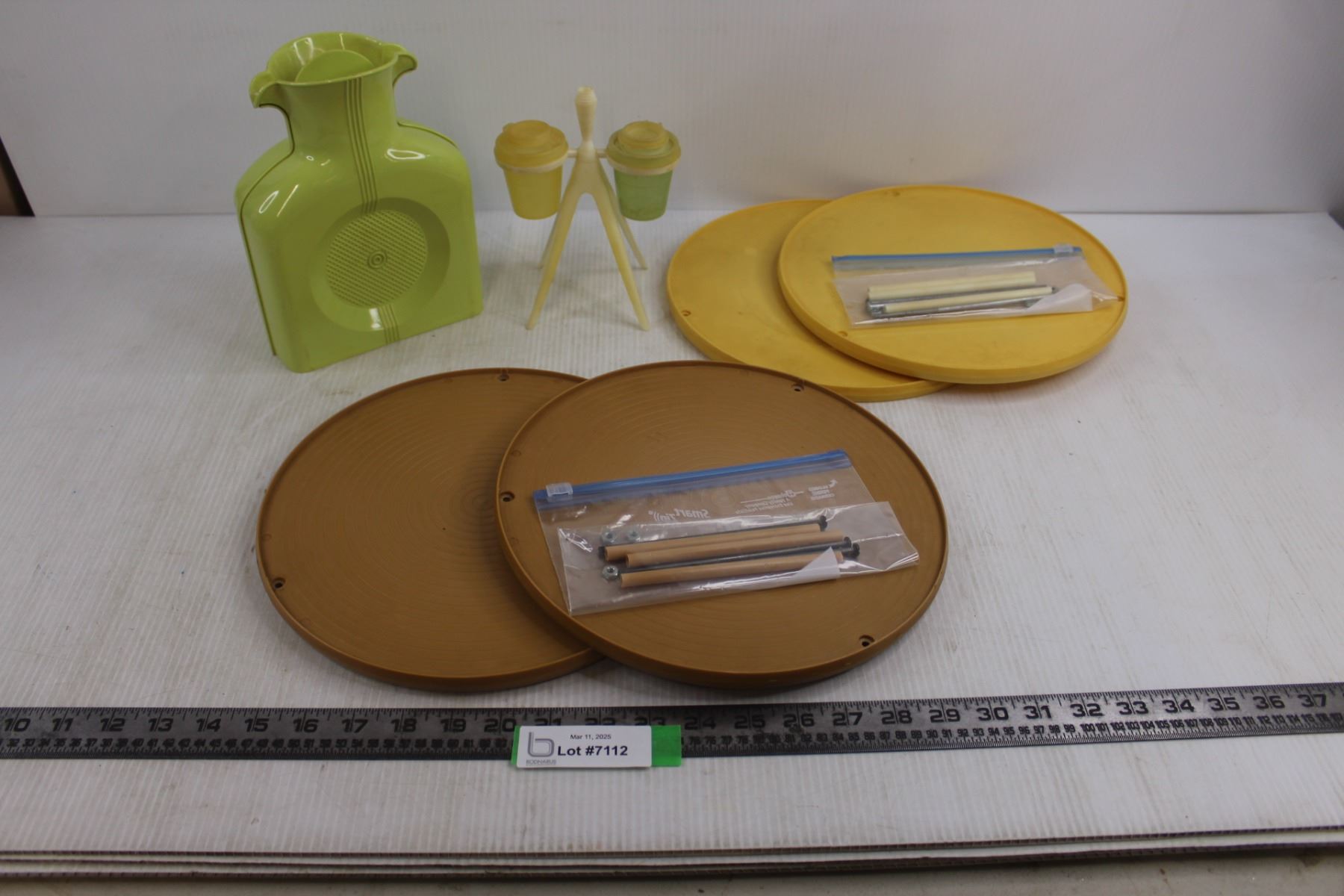 (2) Vintage Kitchen Carousels 10.5" Dia, Vintage Salt & Pepper Tree, Plastic Water Jug