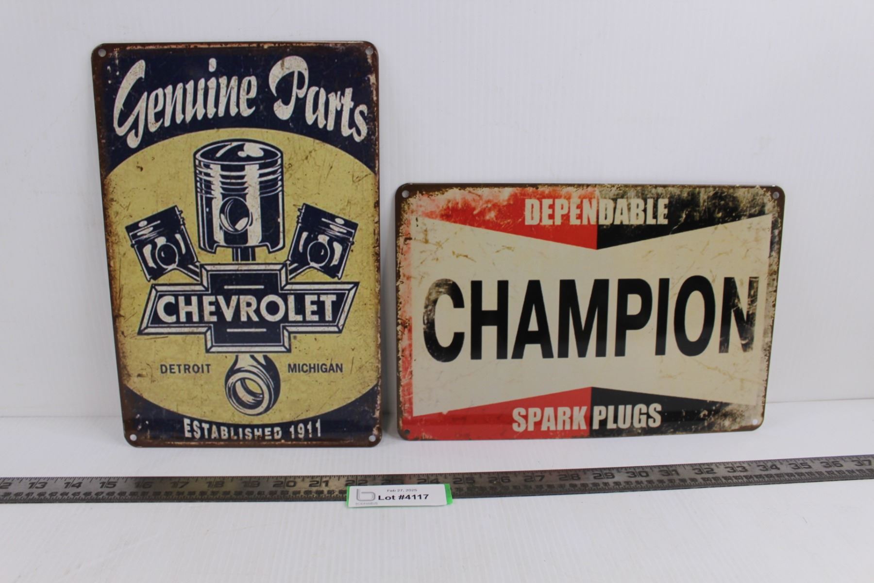 (2) Vintage Looking Metal Wall Art (Chevrolet Genuine Parts & Champion Spark Plugs) 12" x 8"