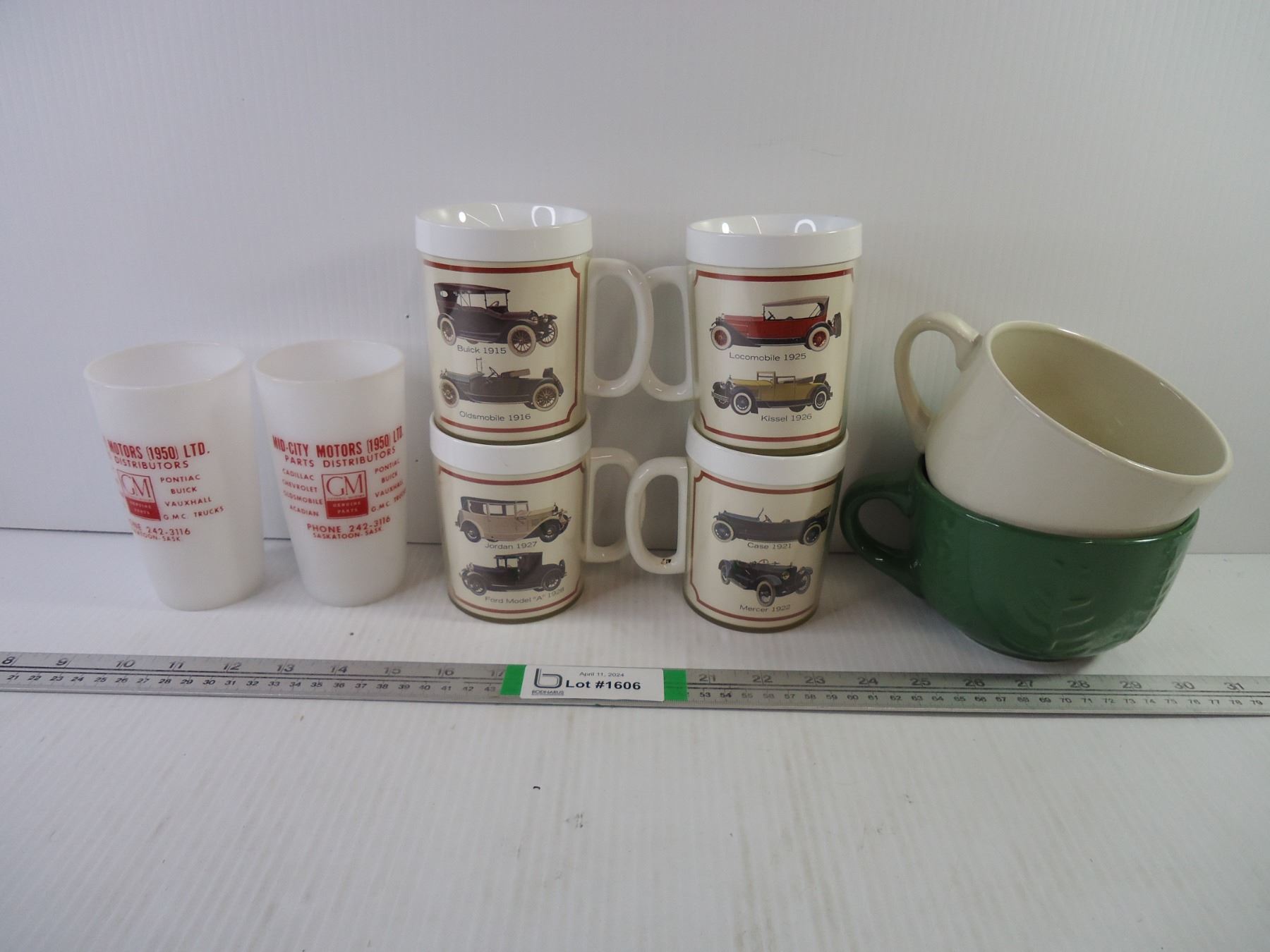 (2) Vintage Mid-City Motors Glasses,(4) Coffee Mugs and (2) Soup Bowls