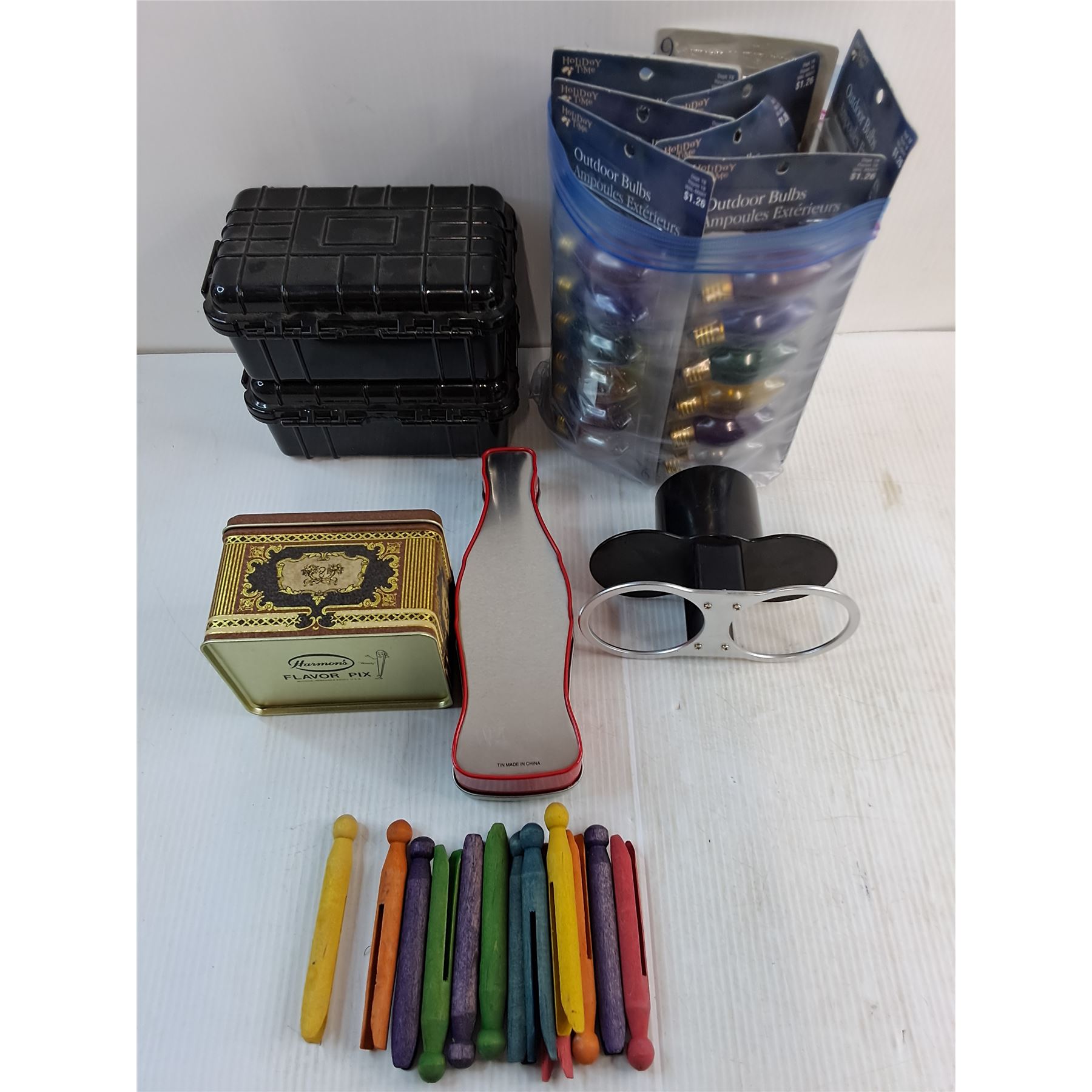 (2) Waterproof Mini Cases, (9) Sealed 6-Packs Outdoor Bulbs, Tins, Dual Drink Holder, Clothes Pins