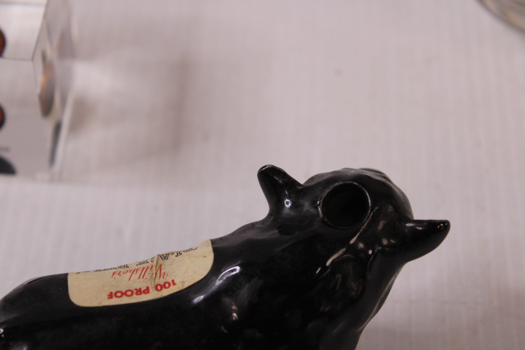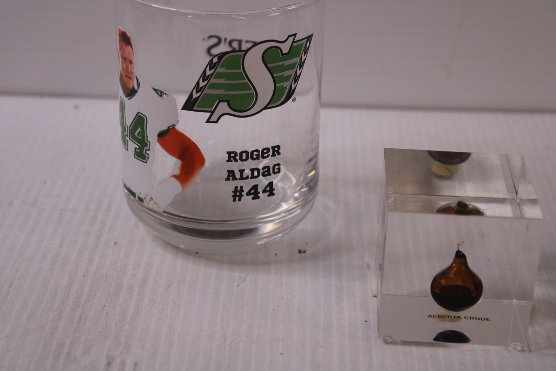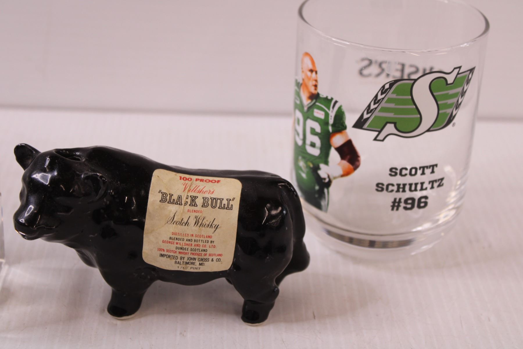 (2) Wieser's Whiskey Roughriders Glasses, "Black Bull" Whiskey Decanter, Albert Crude Oil Paper Weight