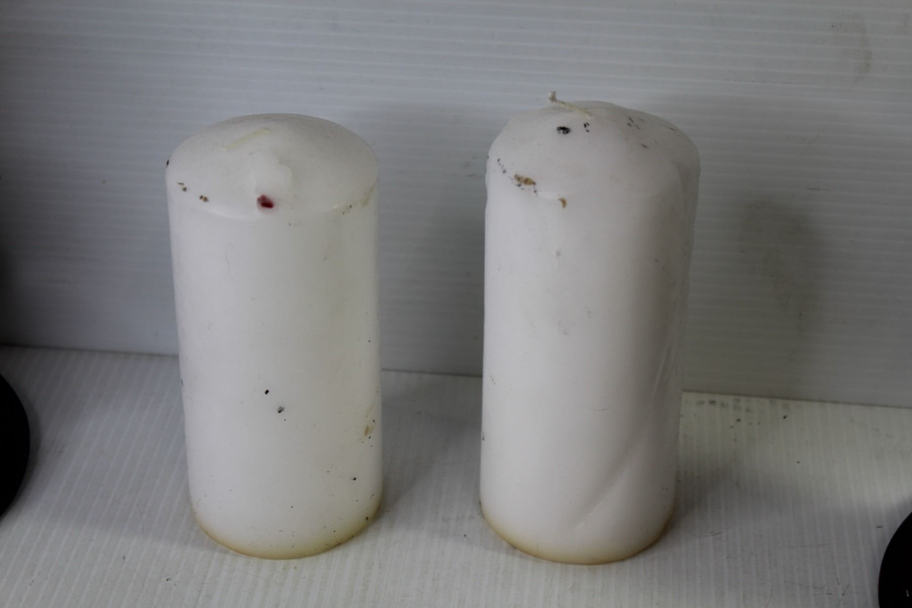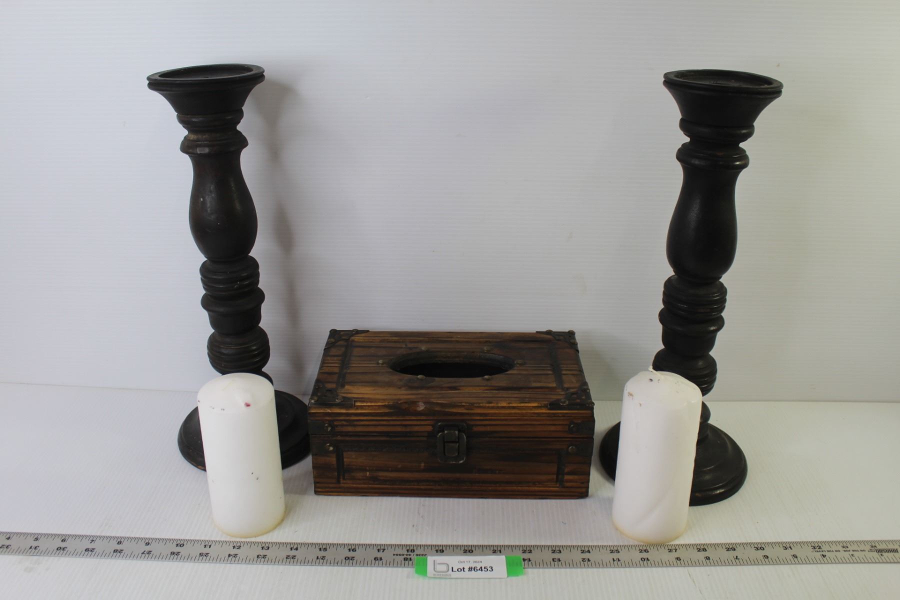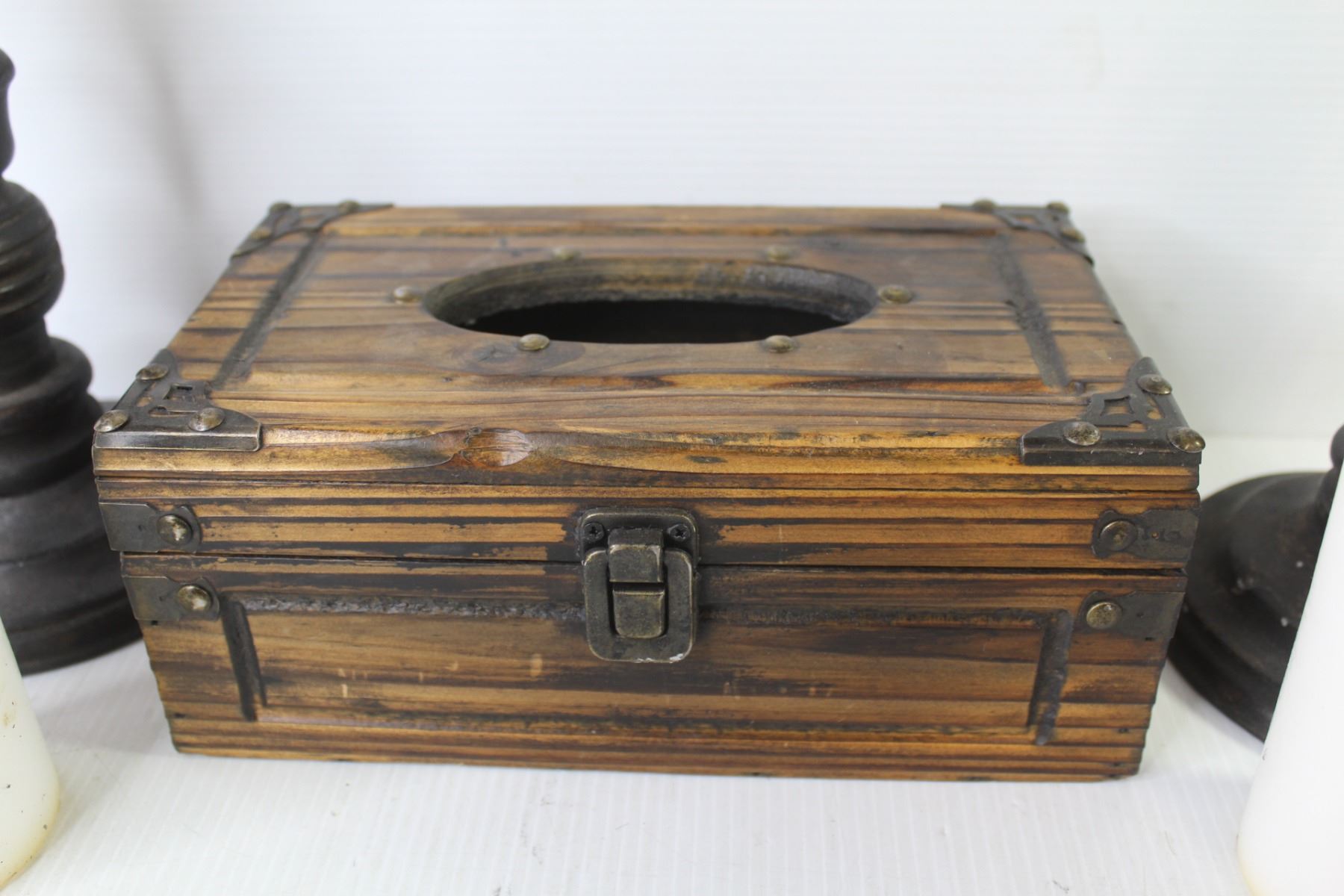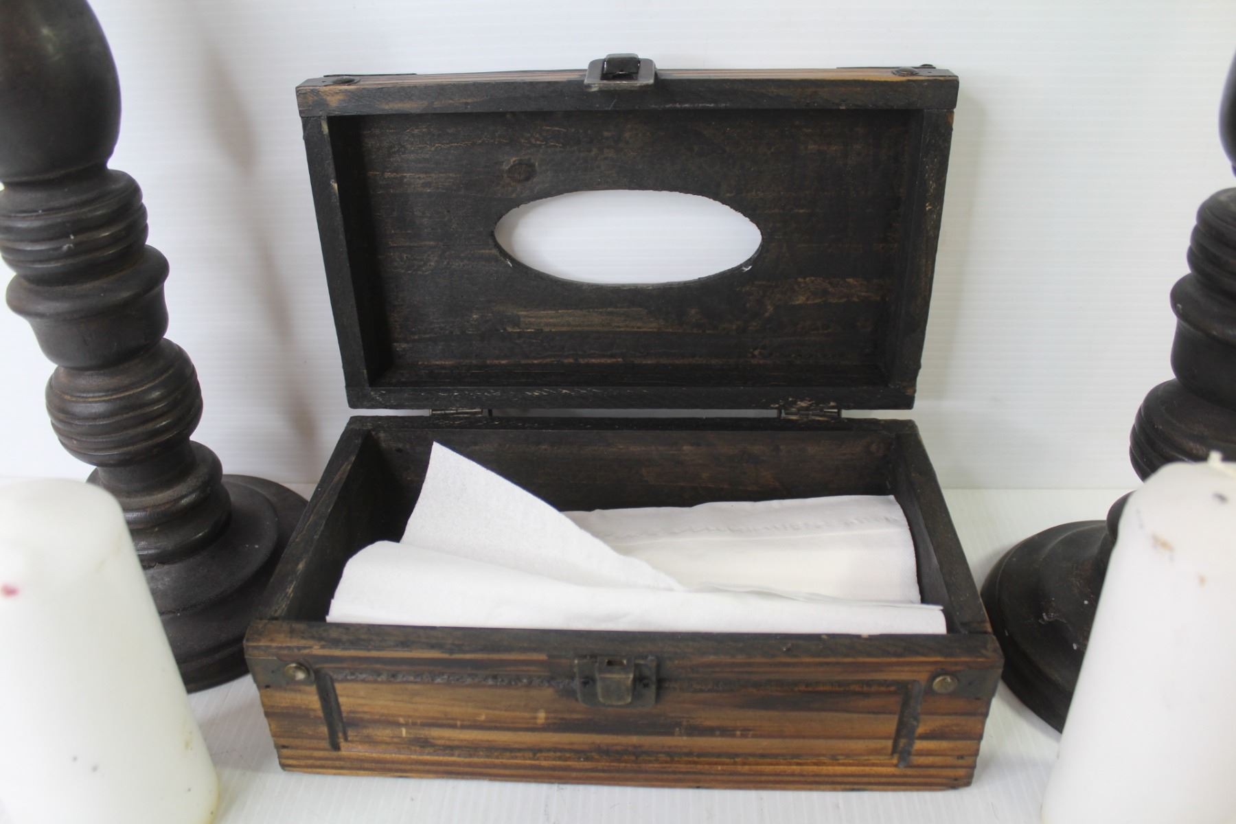 (2) Wooden Candle Holders w/Candles (15" tall) - Wooden Kleenex Box