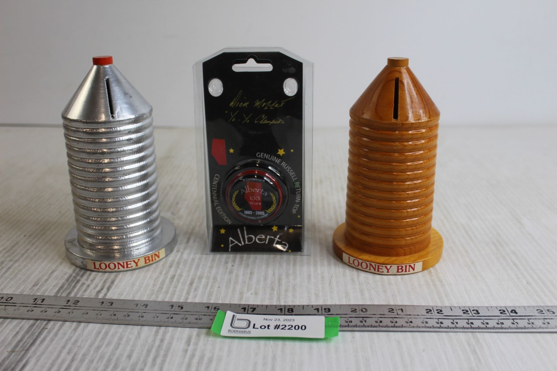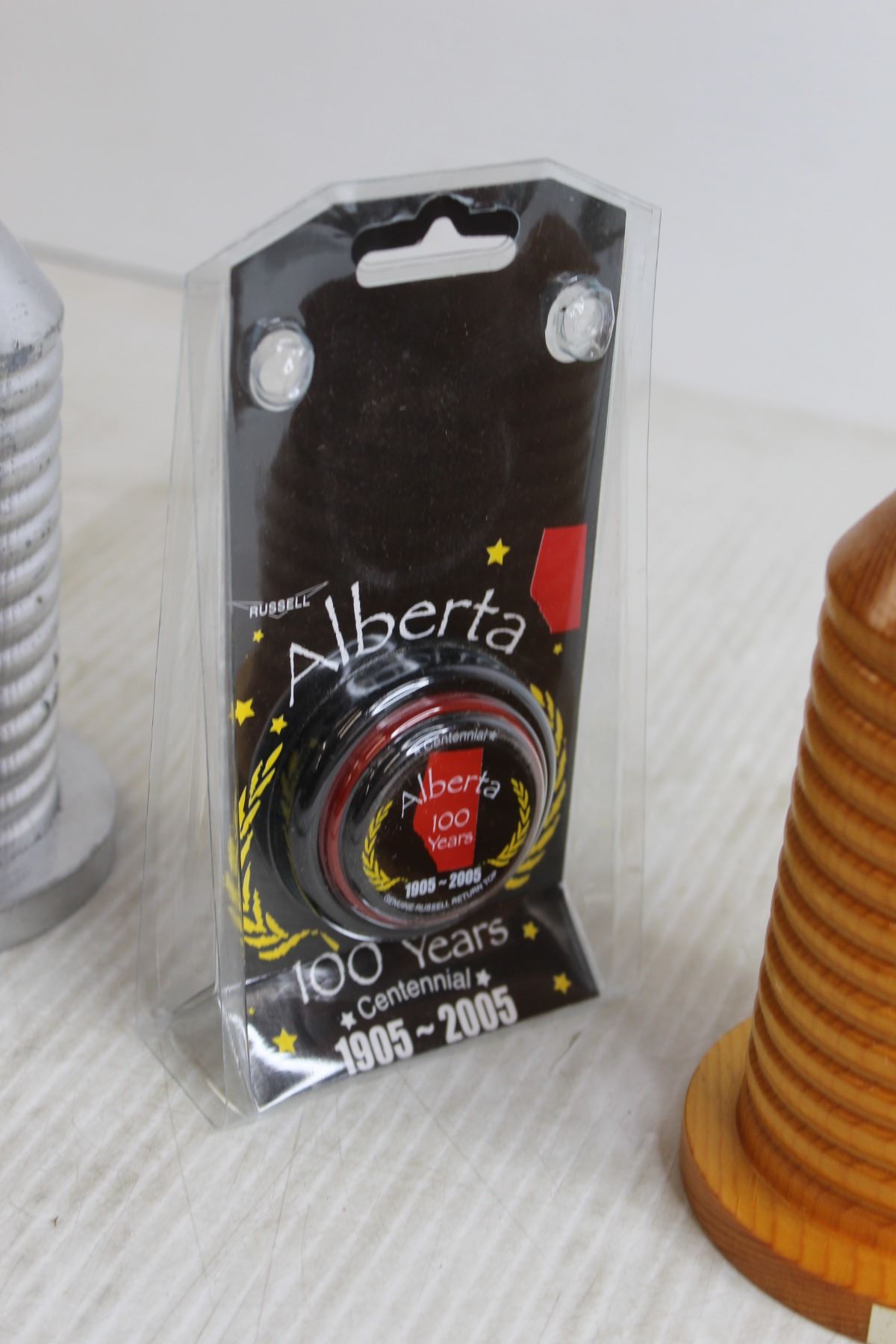 (2) Wooden Looney Bins, Russell Return Top Alberta 100 Years Yo-Yo
